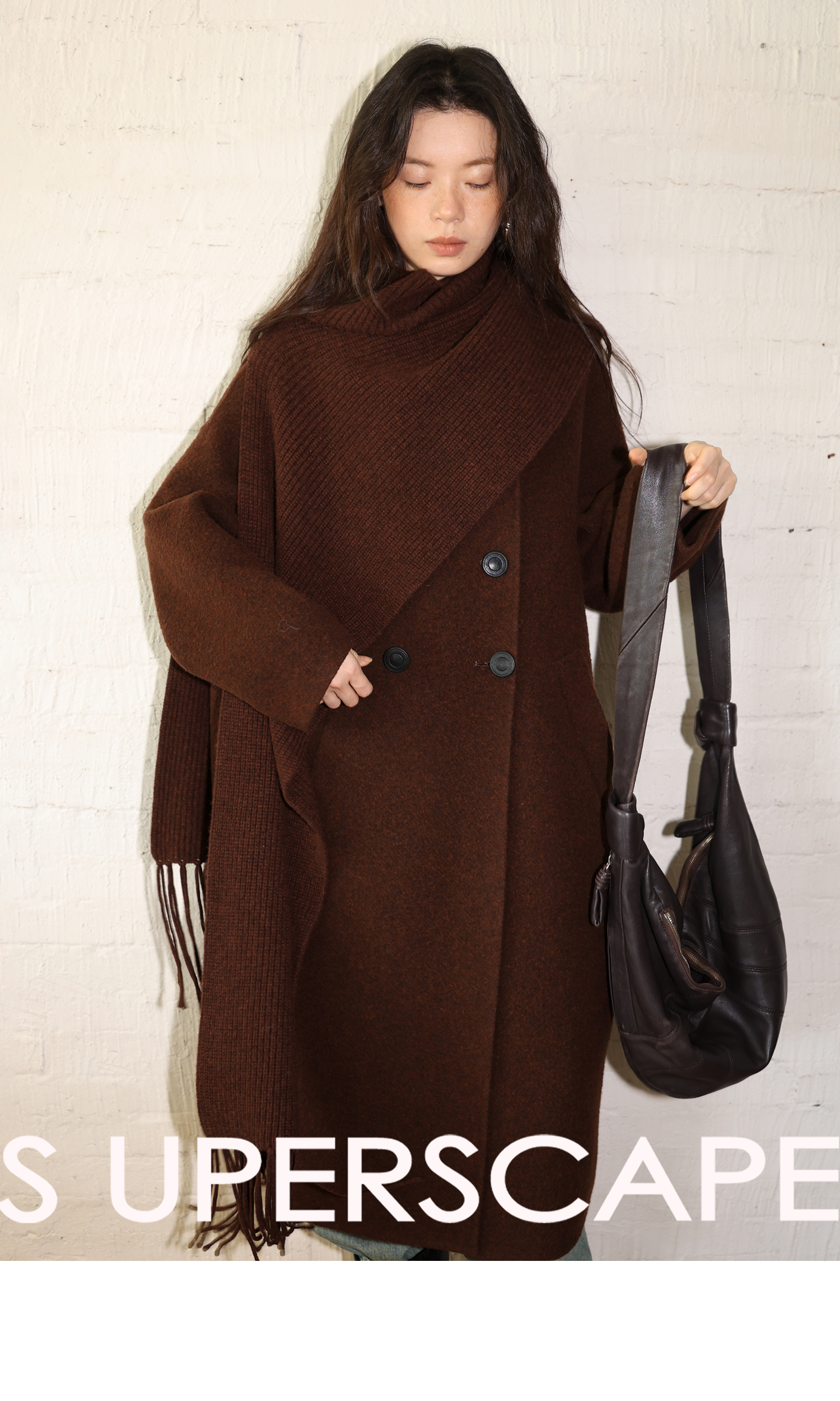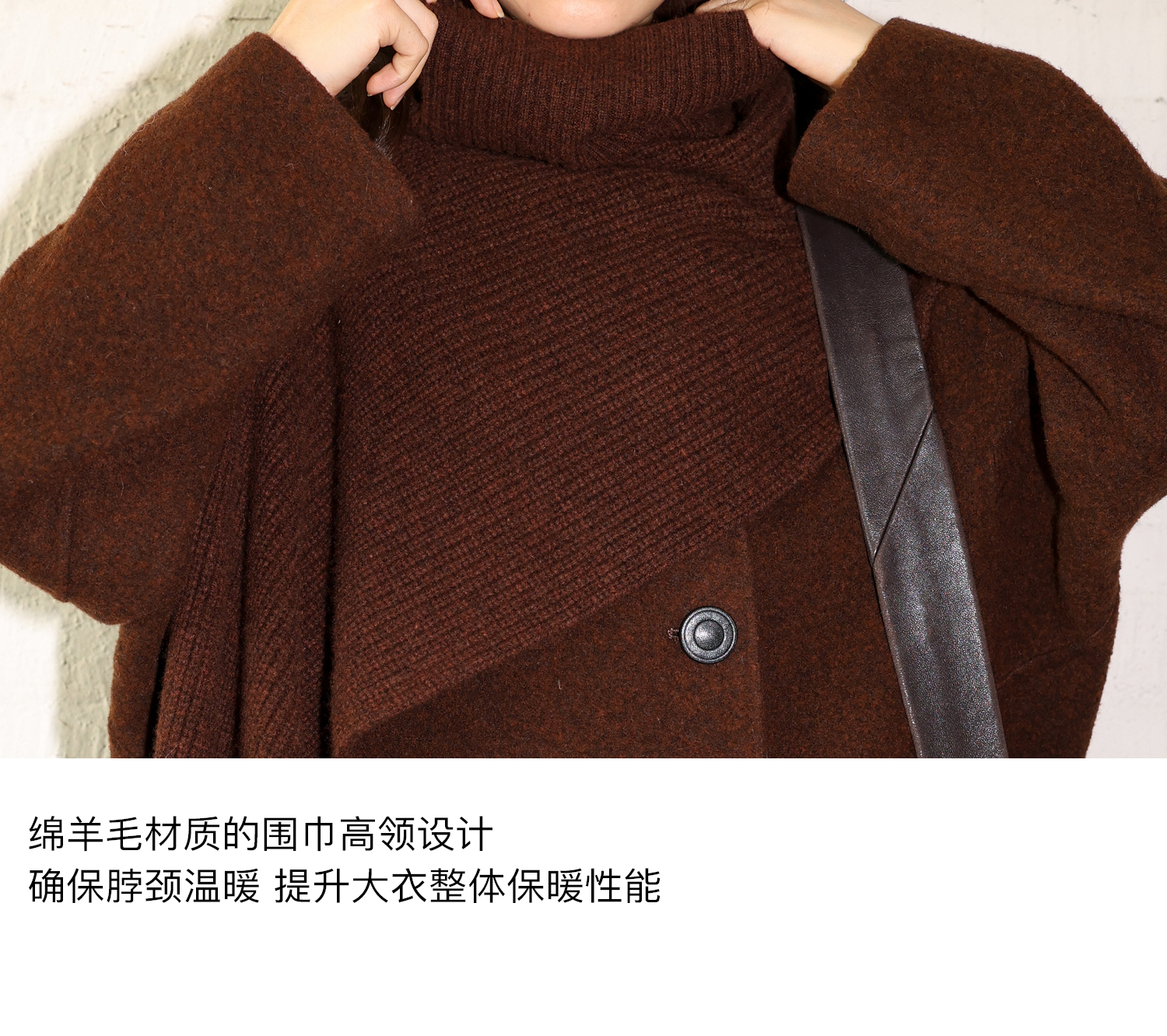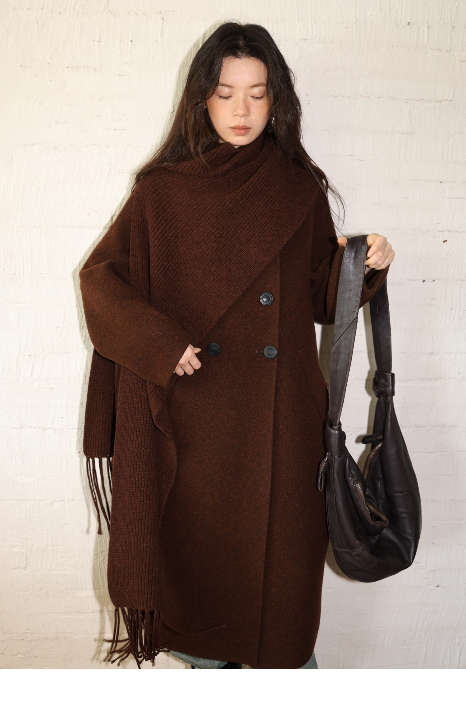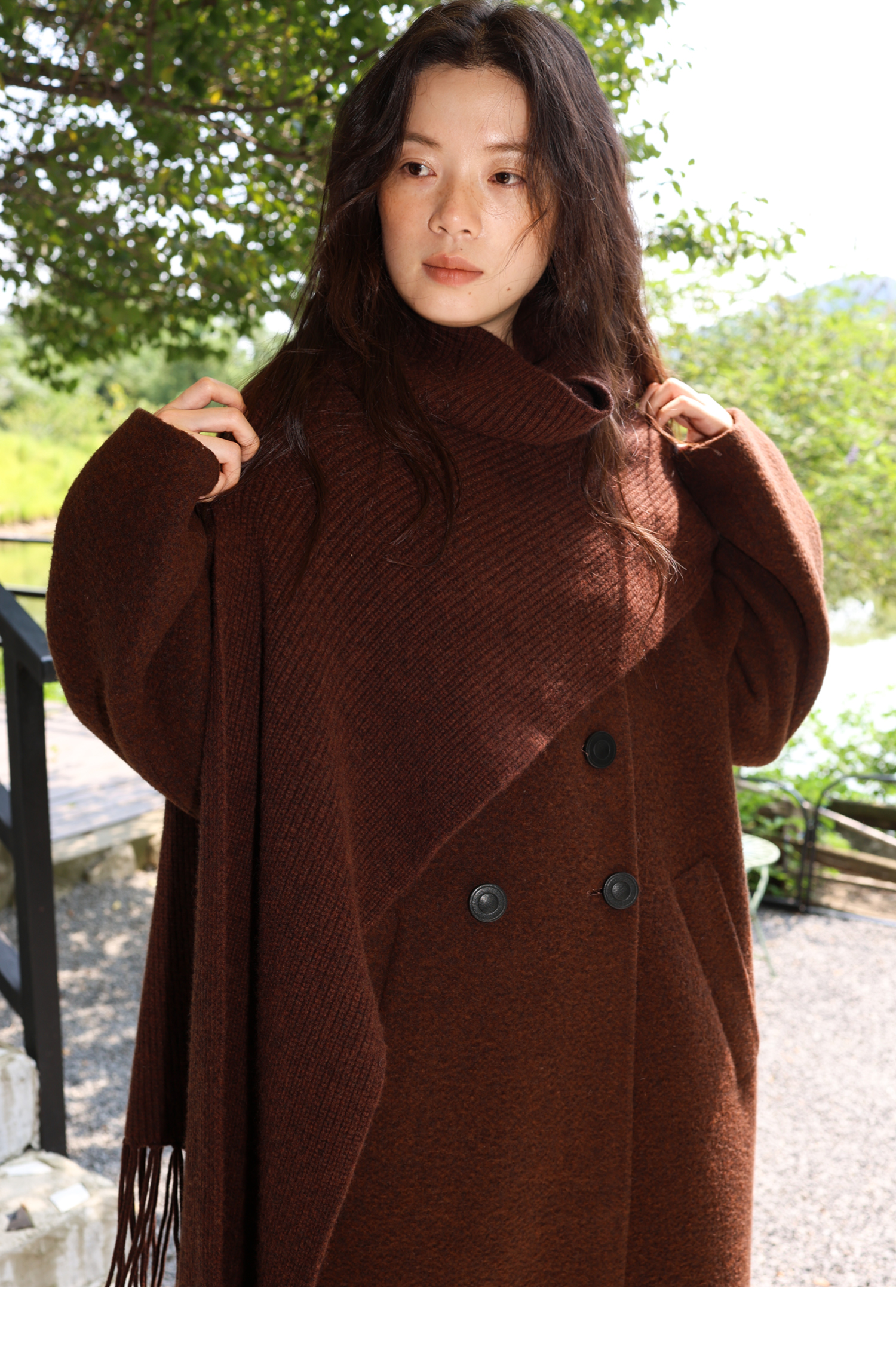 素舶 绵羊毛圆领茧型流苏针织围巾长款双面呢大衣