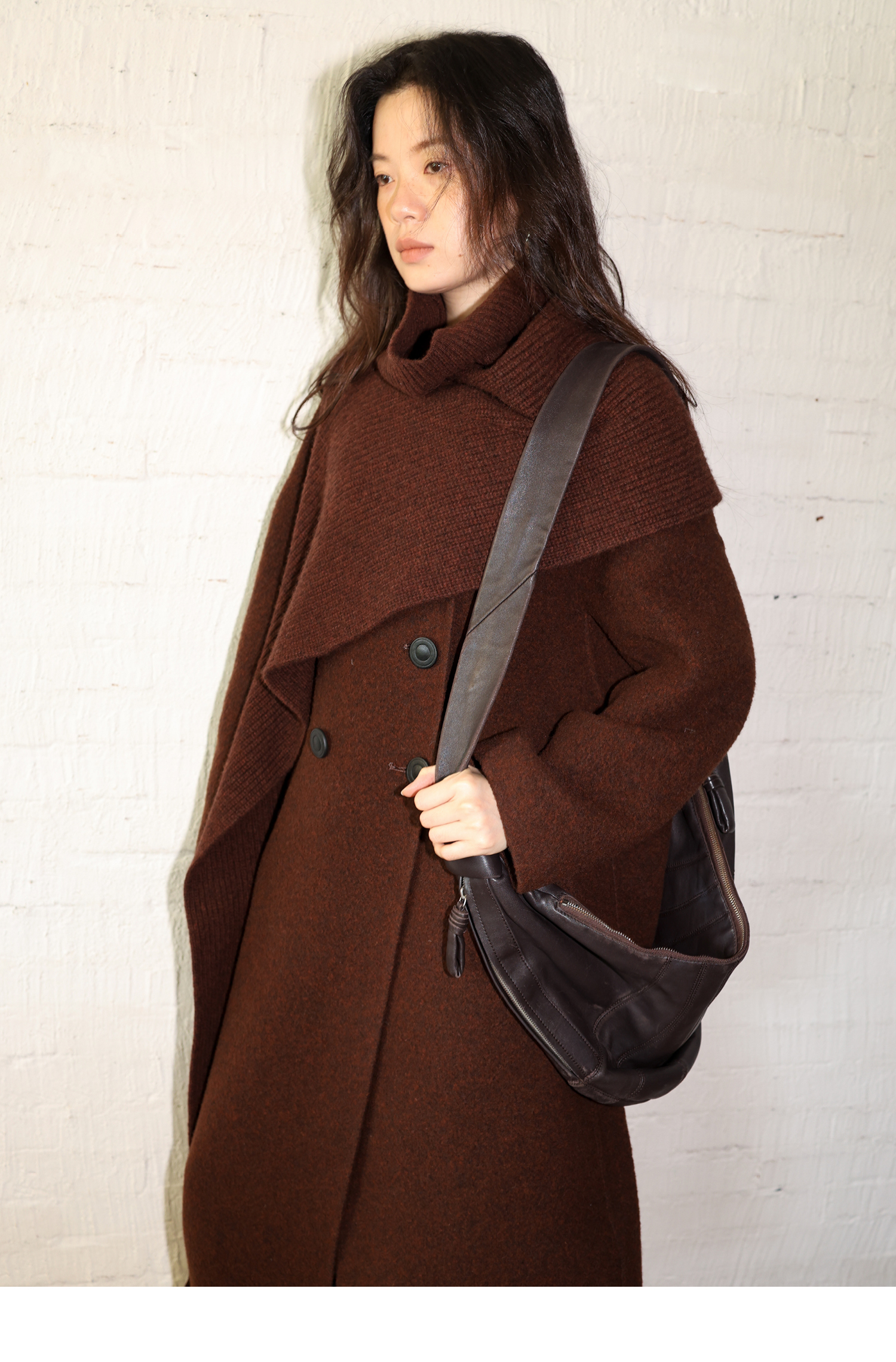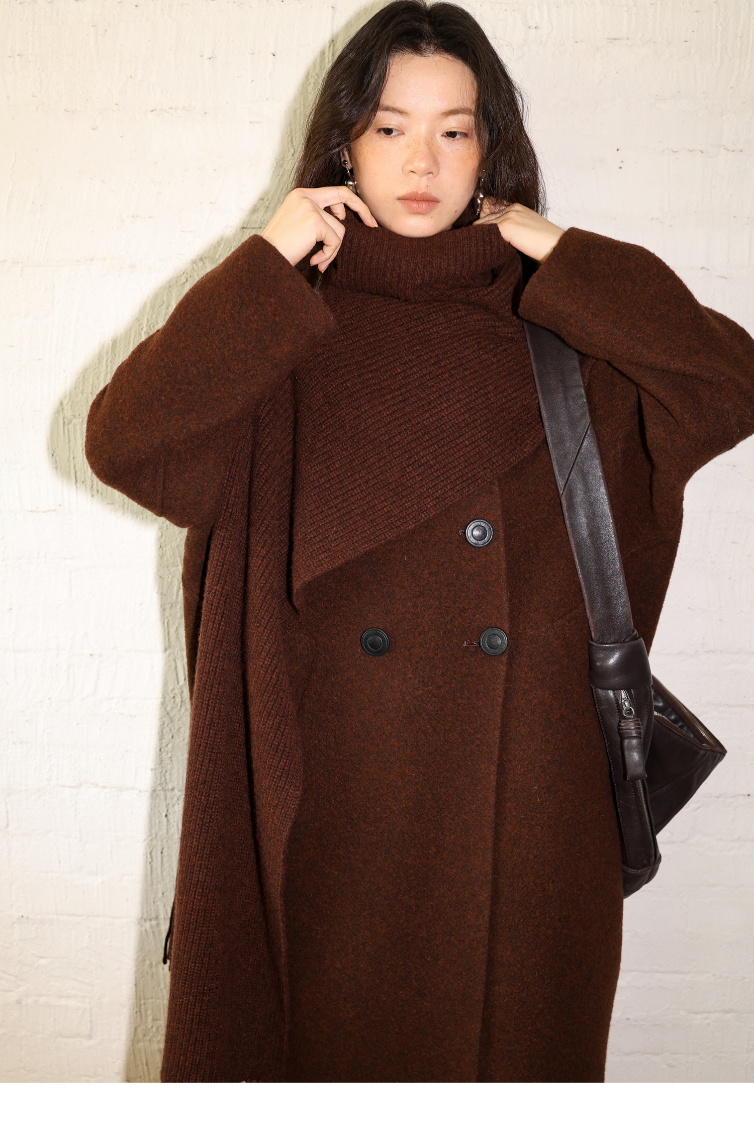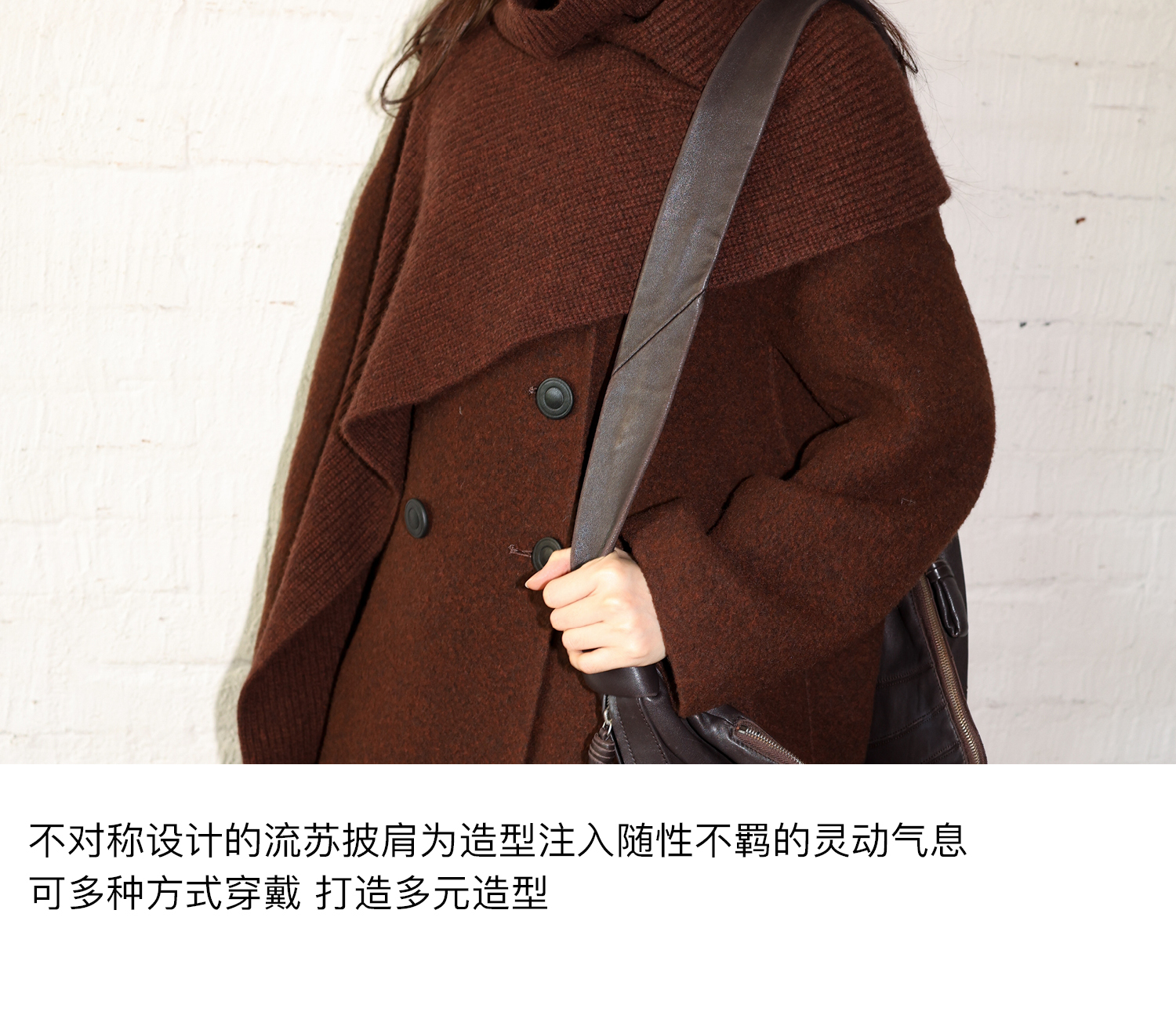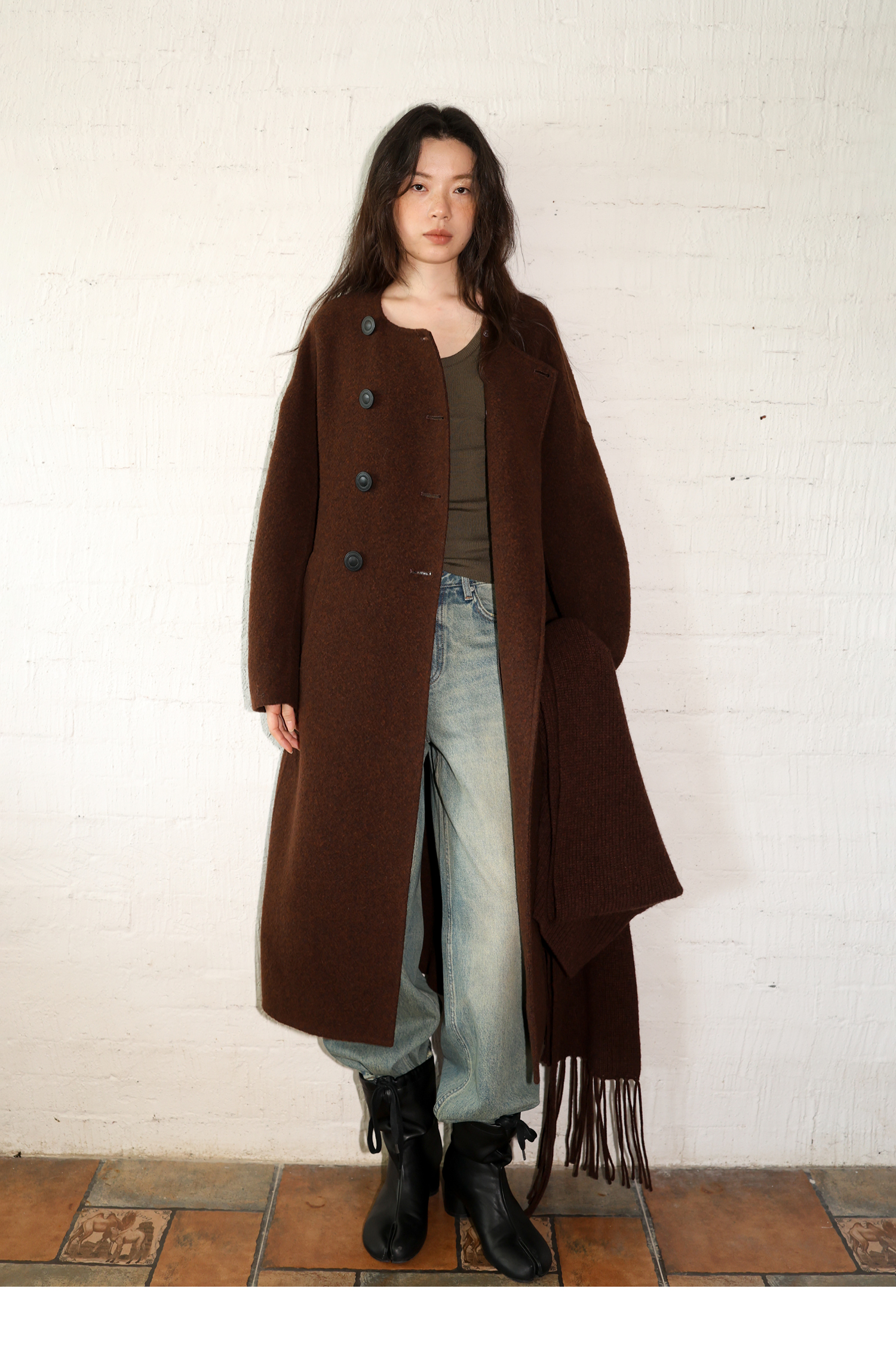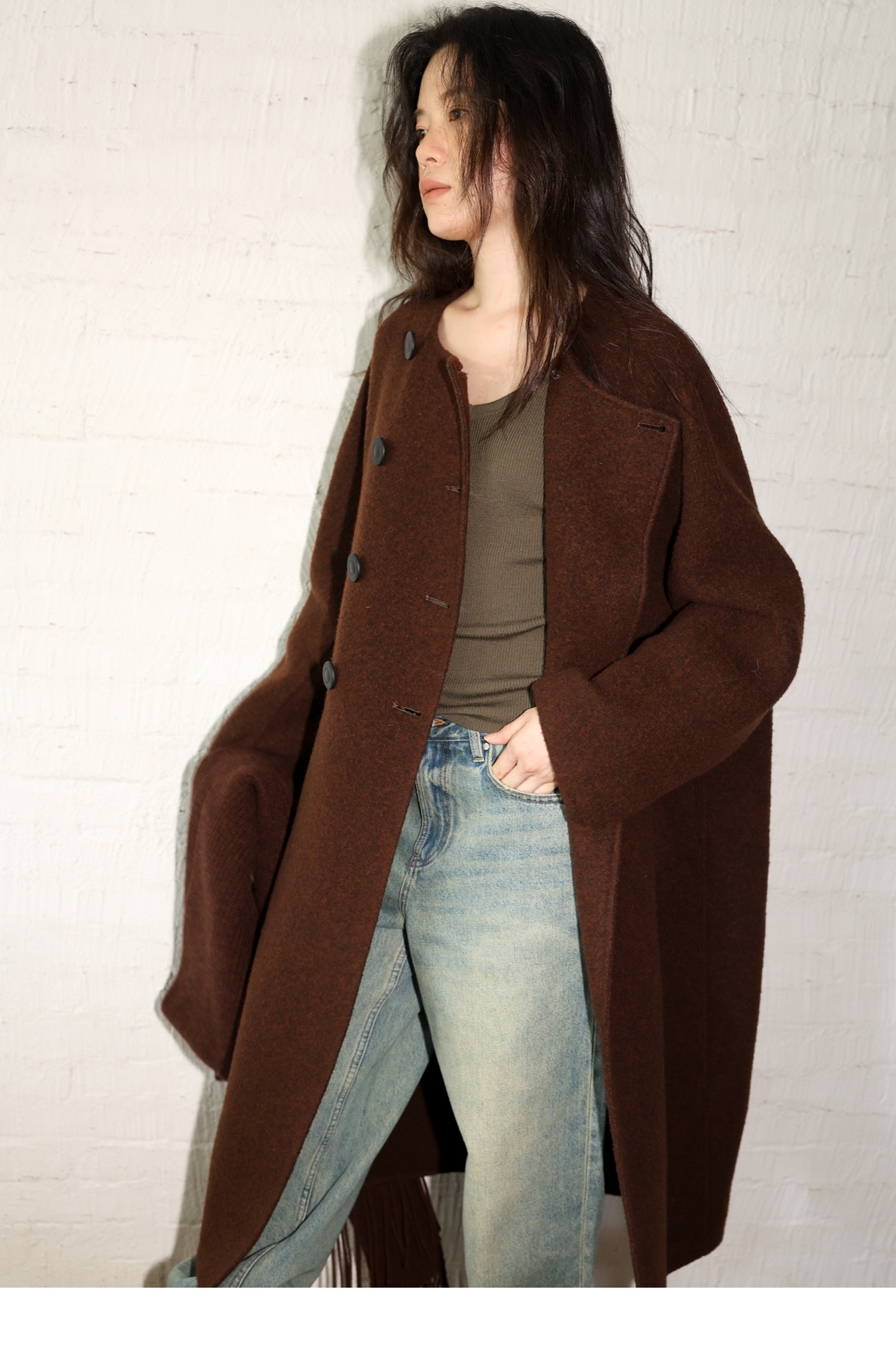 素舶 绵羊毛圆领茧型流苏针织围巾长款双面呢大衣