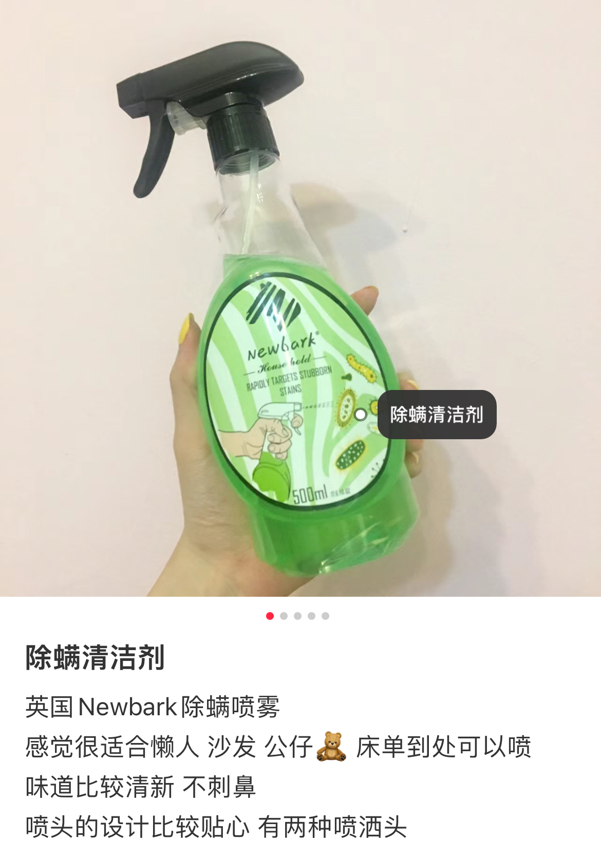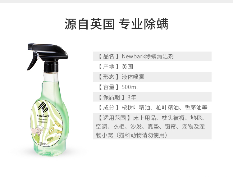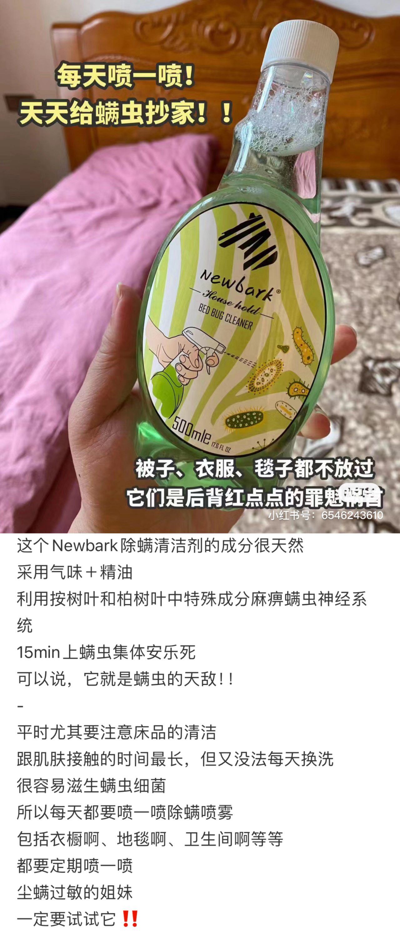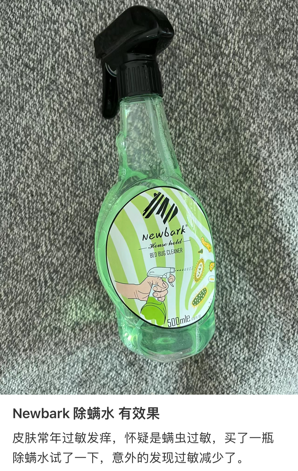 最近问背上痘痘的老粉又多了哦,估计是冬天没有在好好除尘螨!其实,很多莫名其妙的皮肤发痒蛮多都是螨虫引起的,更严重的还会掉发、咳嗽、呼吸不畅等问题……春夏也正是螨虫容易滋生的时节,尤其是南方部分城市,已经阴雨绵绵好久了,这种温度湿度螨虫真太喜欢了,如果床垫被子不能及时晒太阳,又懒得用螨虫贴和除螨仪,就试试除螨喷雾吧!这款是英国NewBark,有上过洗衣凝珠和羊毛真丝清洗剂,还不错的!