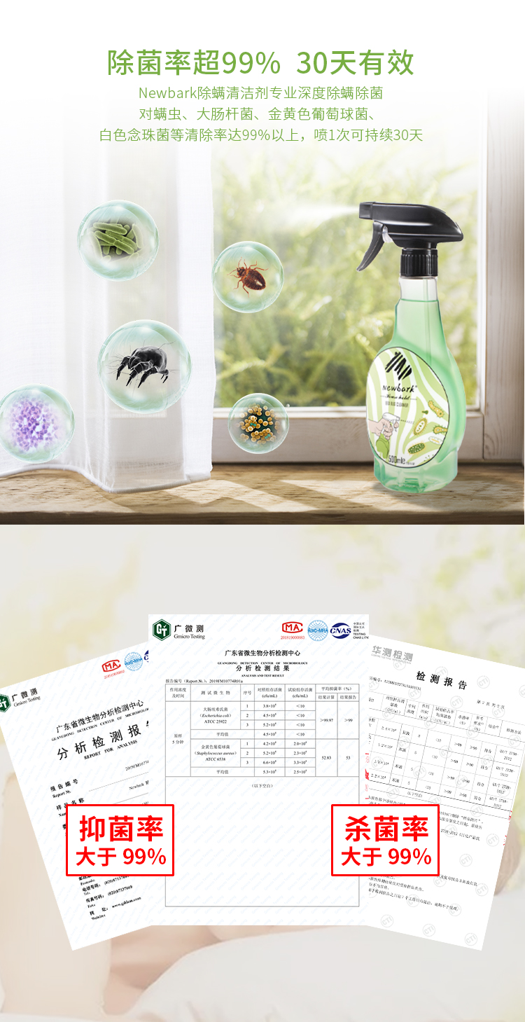 Newbark的除螨喷雾,用的是桉树叶和柏树叶,其中有几种成分可以通过散发气味,针对性的破坏螨虫的神经系统,让它们在不知不觉中安详离去,因此在生物界有“螨虫克星”的美称。Newbark在植物中萃取有效成分,达到除螨的效果的同时,对人体和小宠物又很安全。另外,经过专业测试,除螨喷雾除了针对螨虫外,对大肠杆菌、金黄色葡萄球菌、白色念珠菌等细菌抑菌率也大于99%,主打一个一举多得!