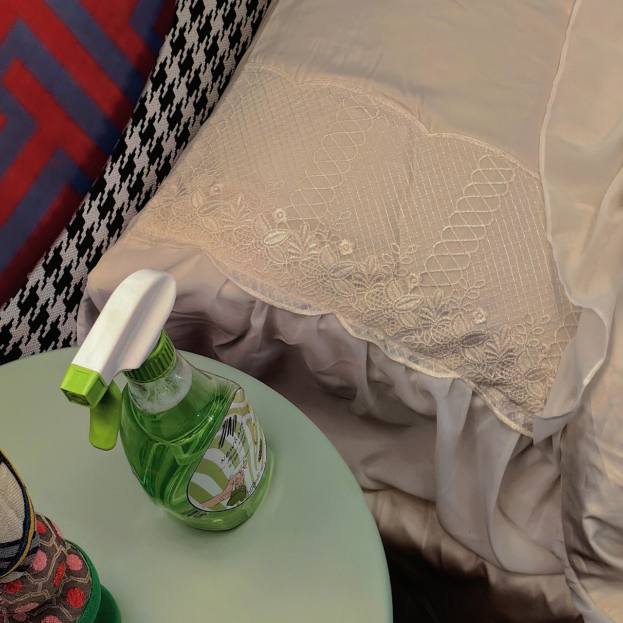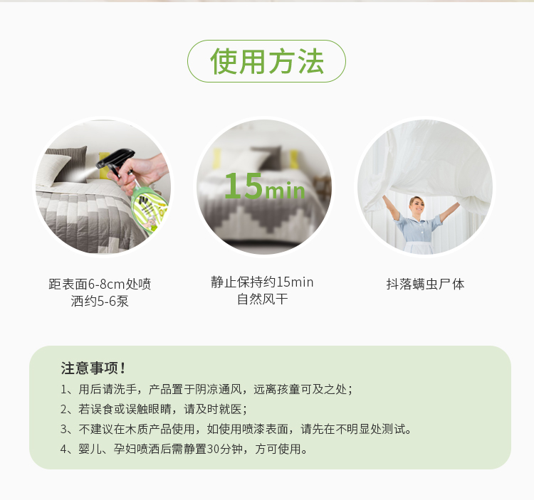 日常着重喷喷床和沙发,喷完等干就可以了,还有换季后久放的衣物,在穿前一天也建议喷喷,去味的同时能尽可能减少皮肤过敏的可能,如果家里有宠物的话就更需要备一备啦,在毛毛们活动区域多喷喷,也可以让宠物们减少皮肤病!而且喷一次管一个月哎,一瓶500ml用个半年不是问题!更敏感些的老粉,搭配除螨仪和螨虫贴贴一起,全方位围剿,更安心!