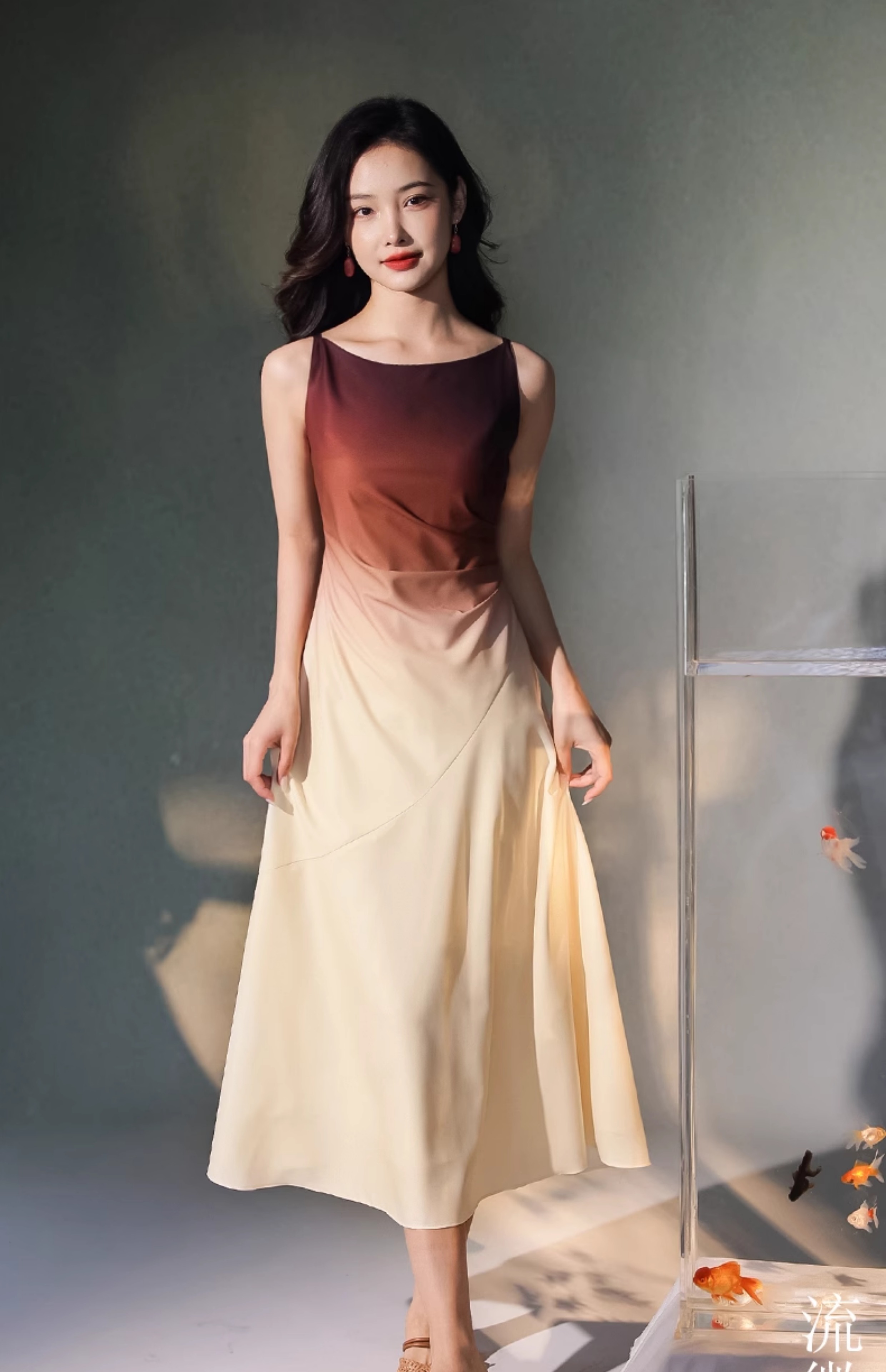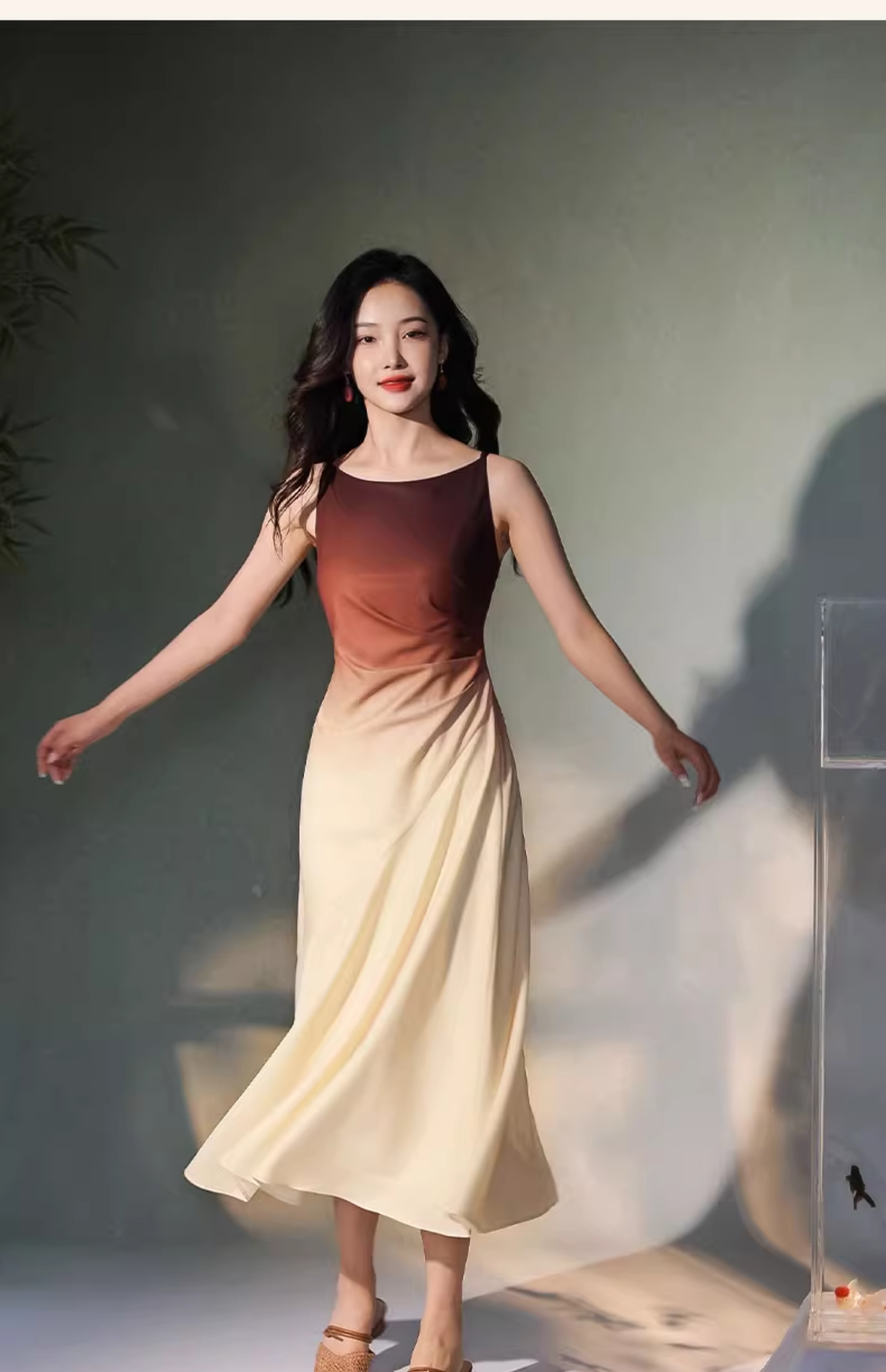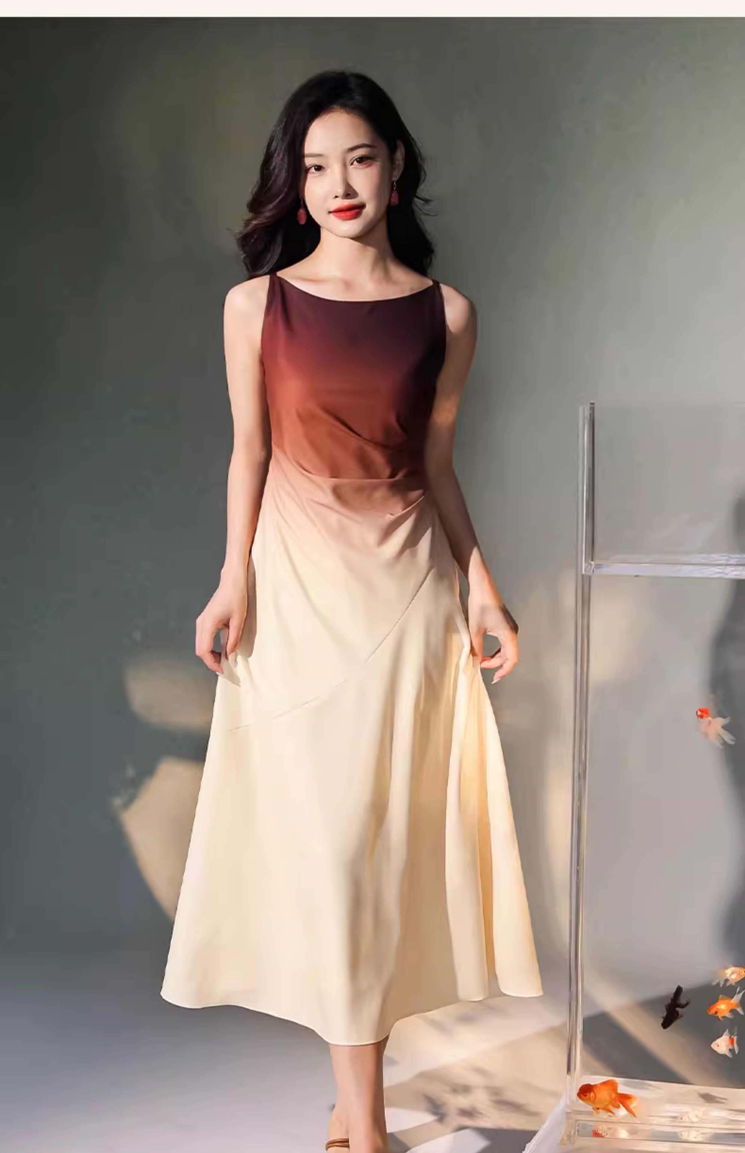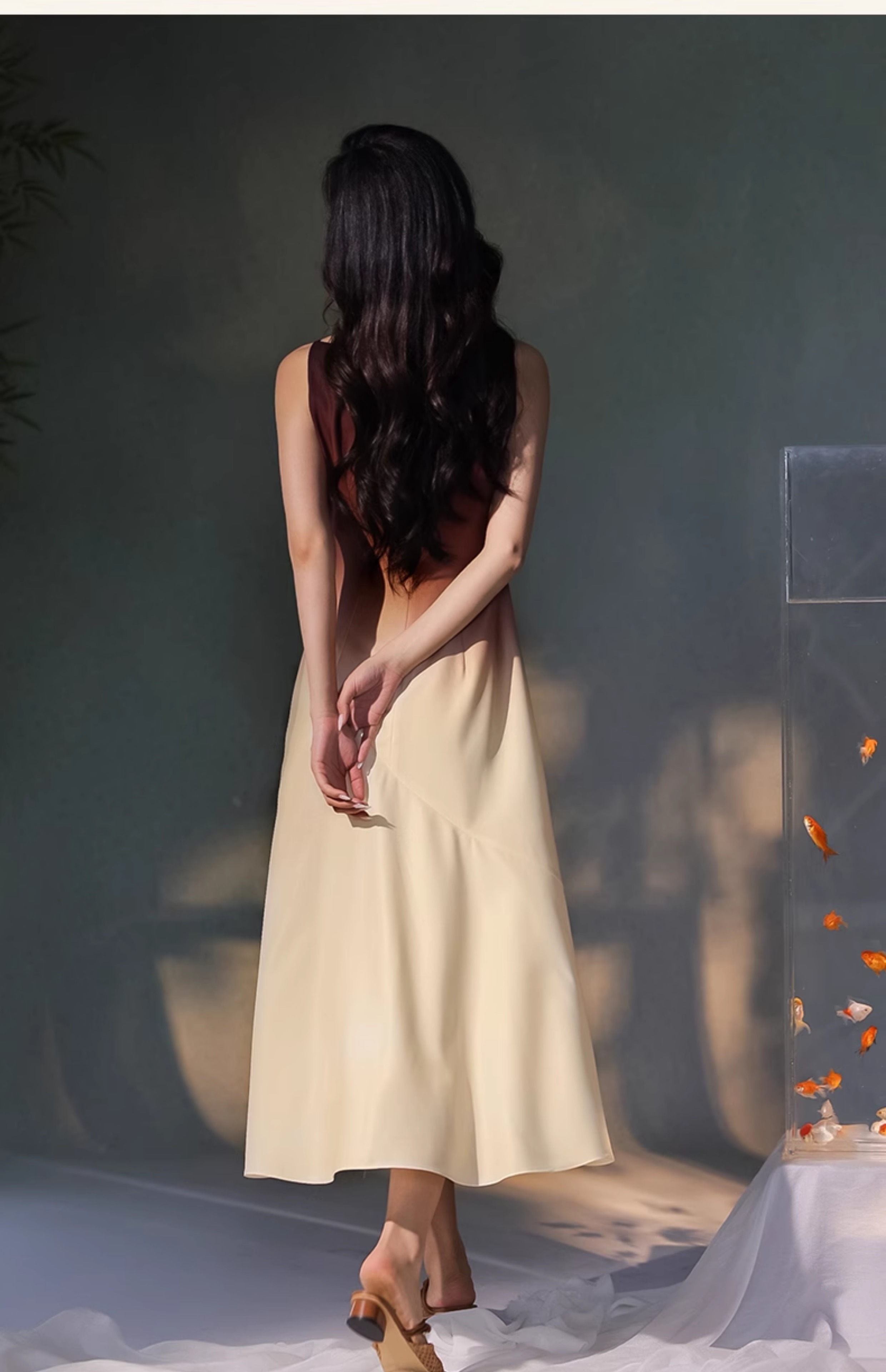 逸红颜流徵2025夏新款天然植物吊染一字领新中式吊带短袖连衣裙女