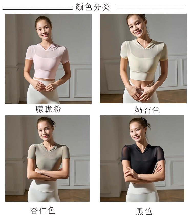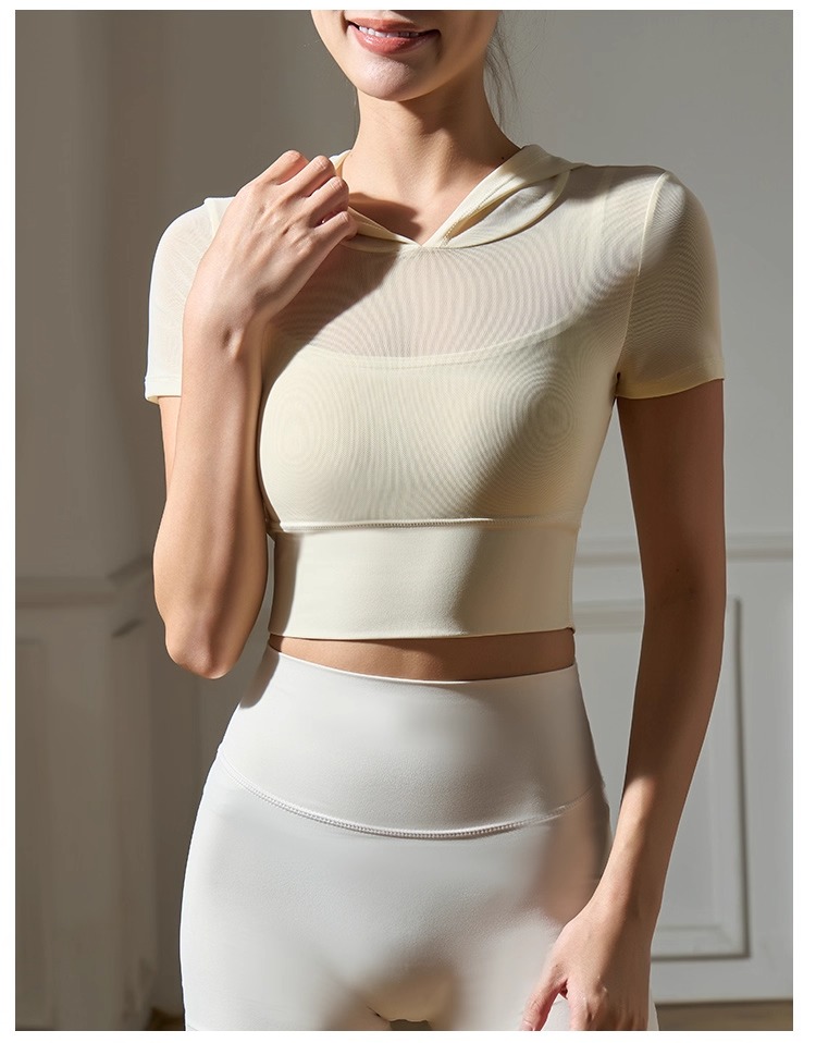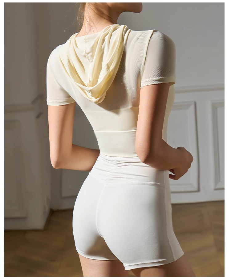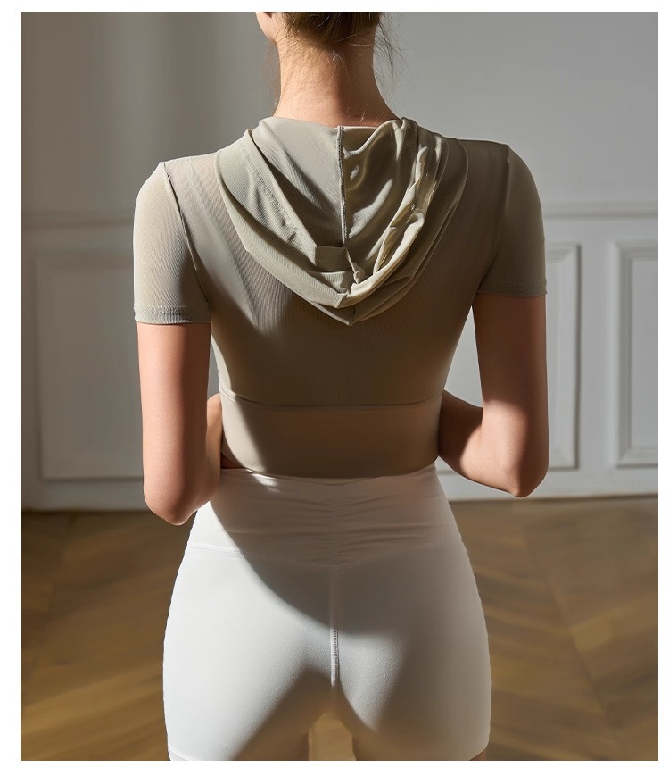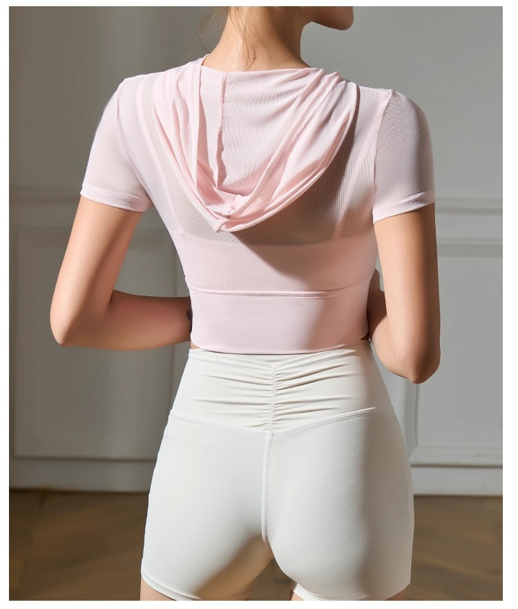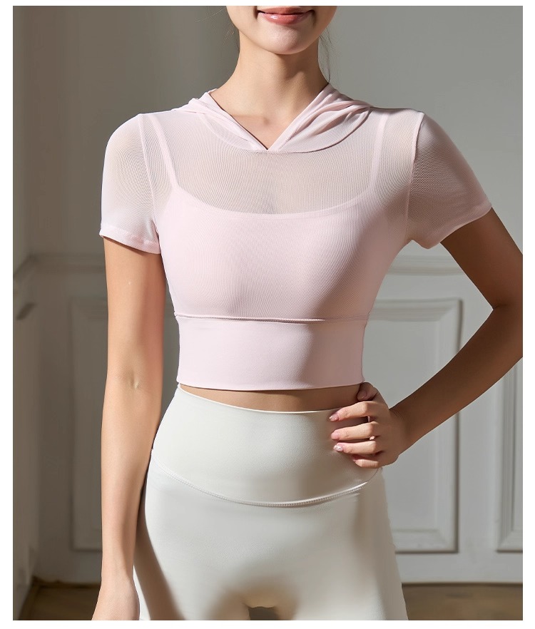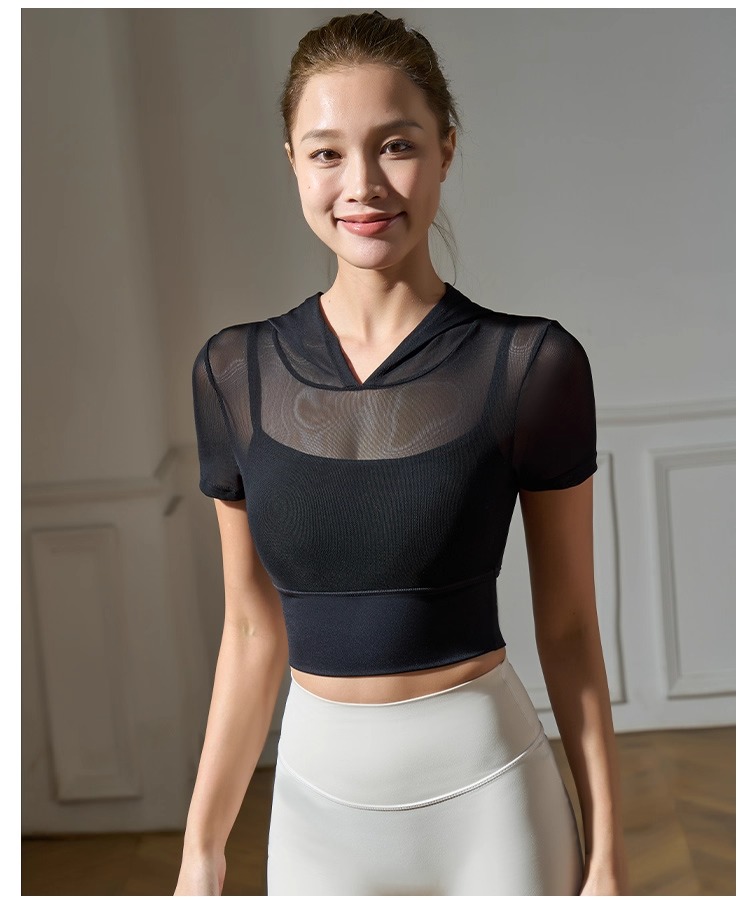 跃牌【禅语梵心】连帽网纱瑜伽服短袖带胸垫跑步速干运动文胸一体杯健身服上衣DX3257