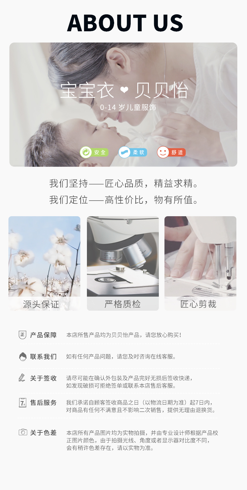 - 贝贝怡专注0-6岁婴幼儿服饰,坚持安全、柔软、舒适的产品理念,为千万中国家庭提供超高品质、安全可靠的婴幼儿服饰产品,妈妈放心,宝宝开心!