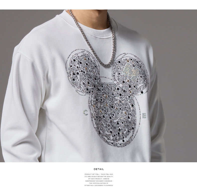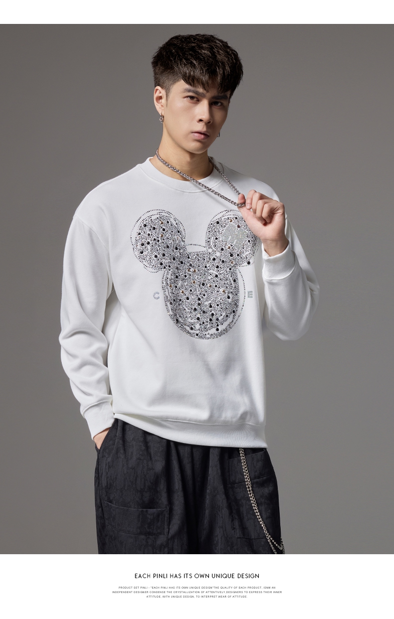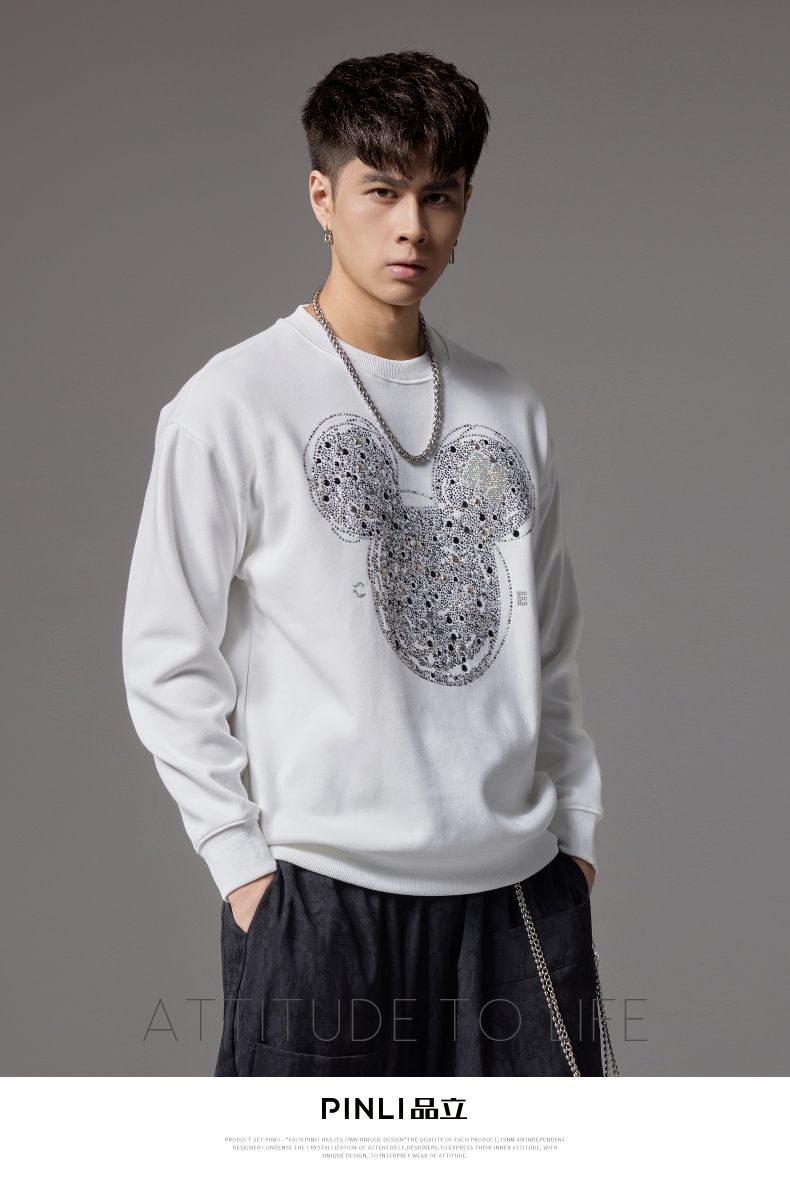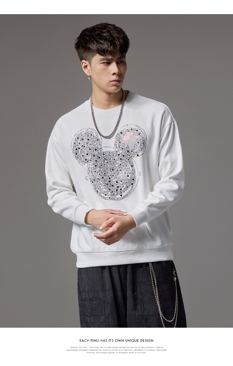 PINLI品立秋季新款男士宽松圆领落肩卡通烫钻套头卫衣上衣潮BG243109026