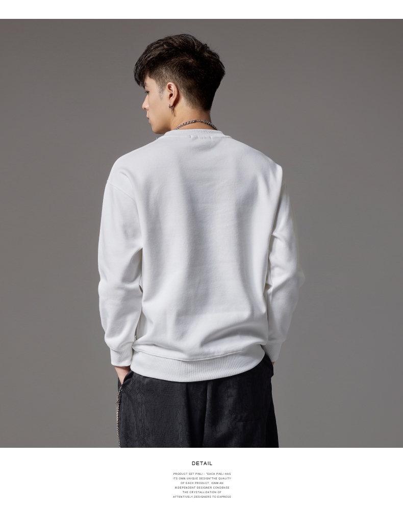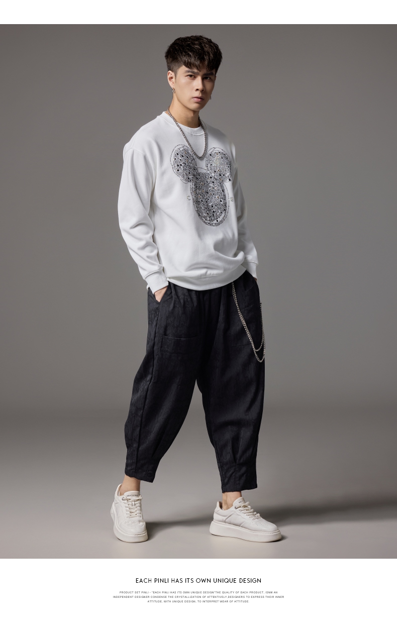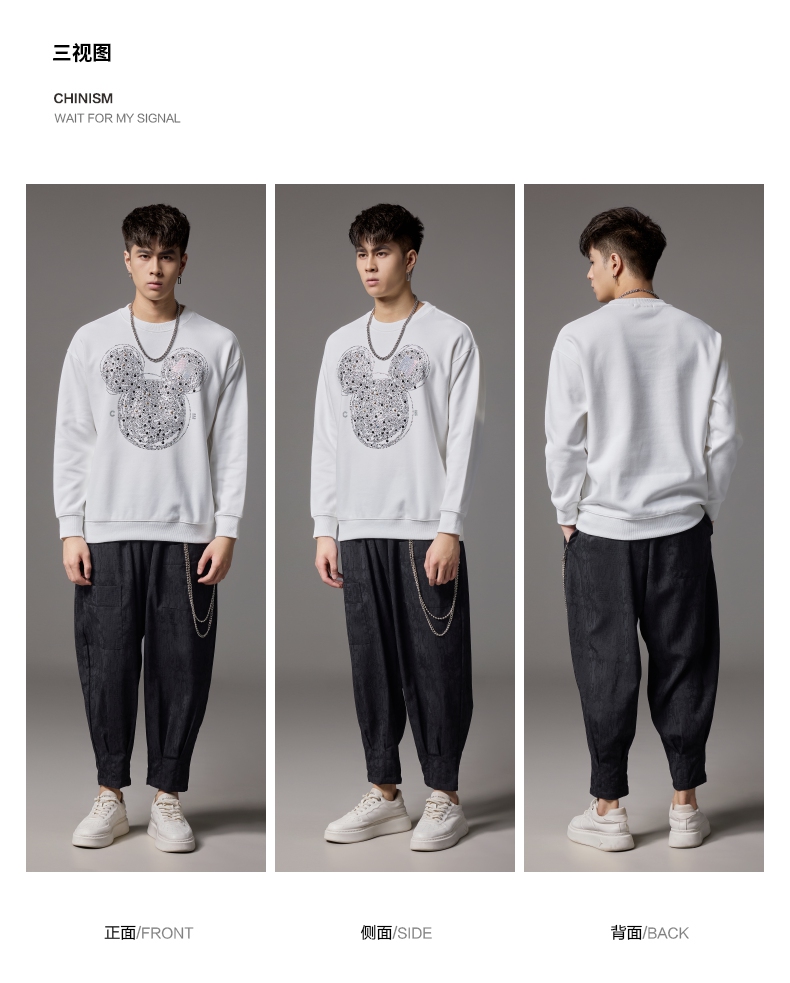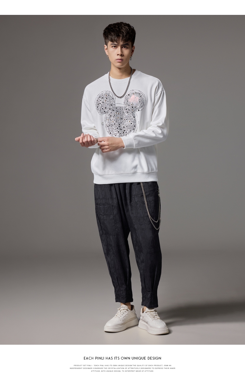 PINLI品立秋季新款男士宽松圆领落肩卡通烫钻套头卫衣上衣潮BG243109026