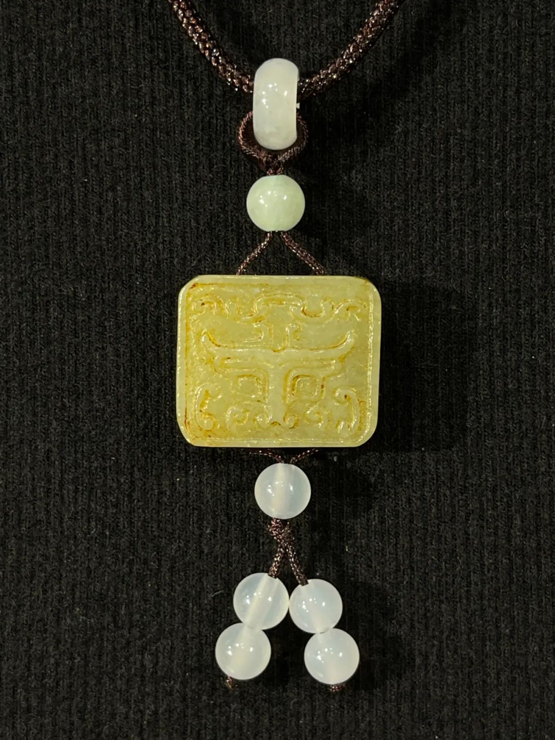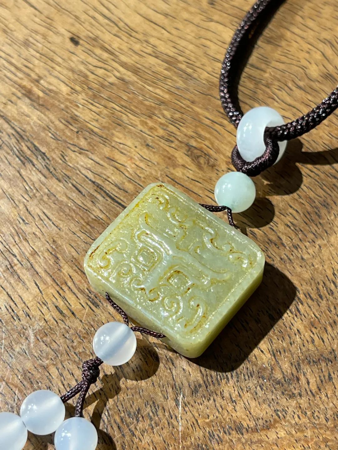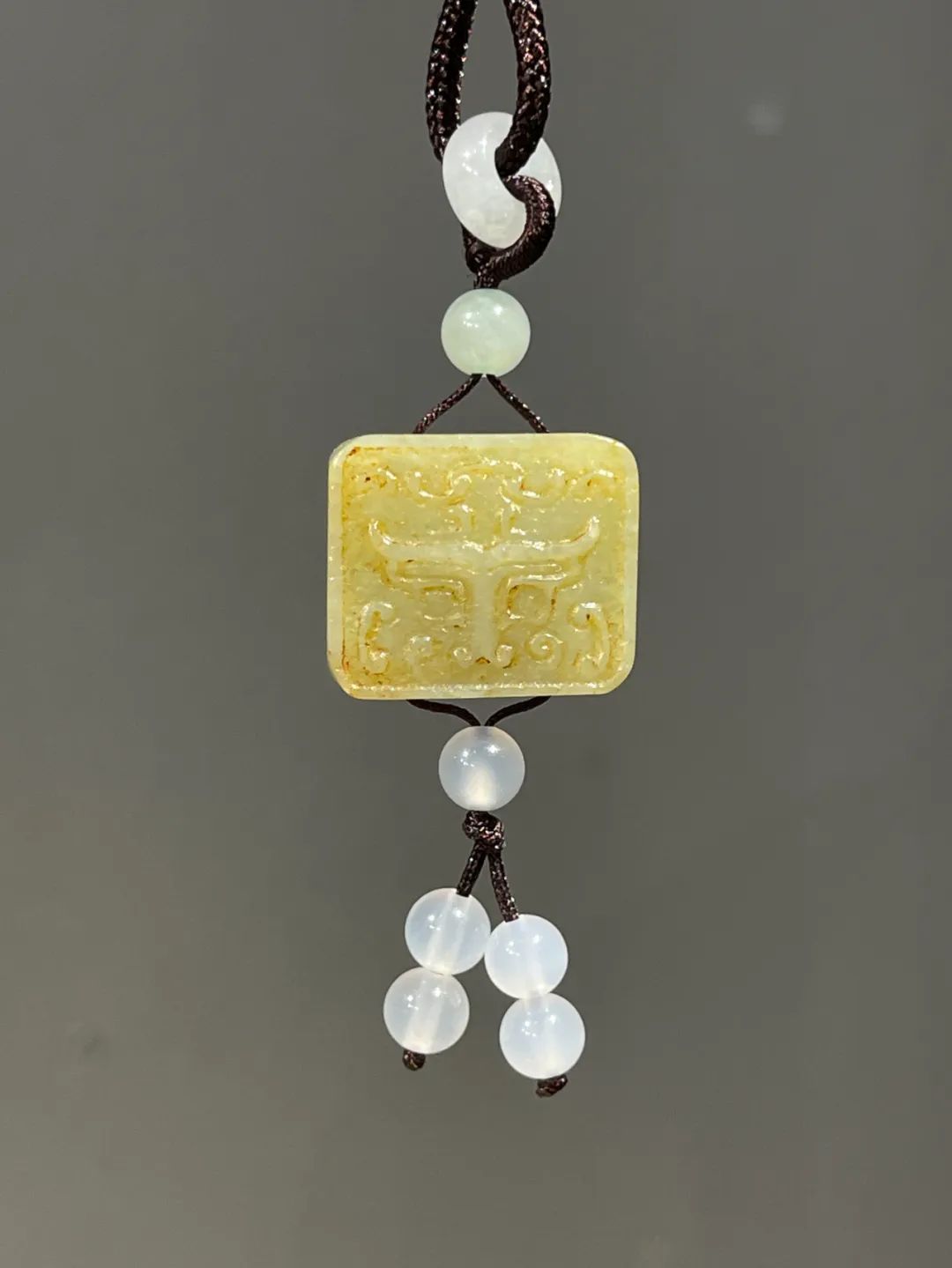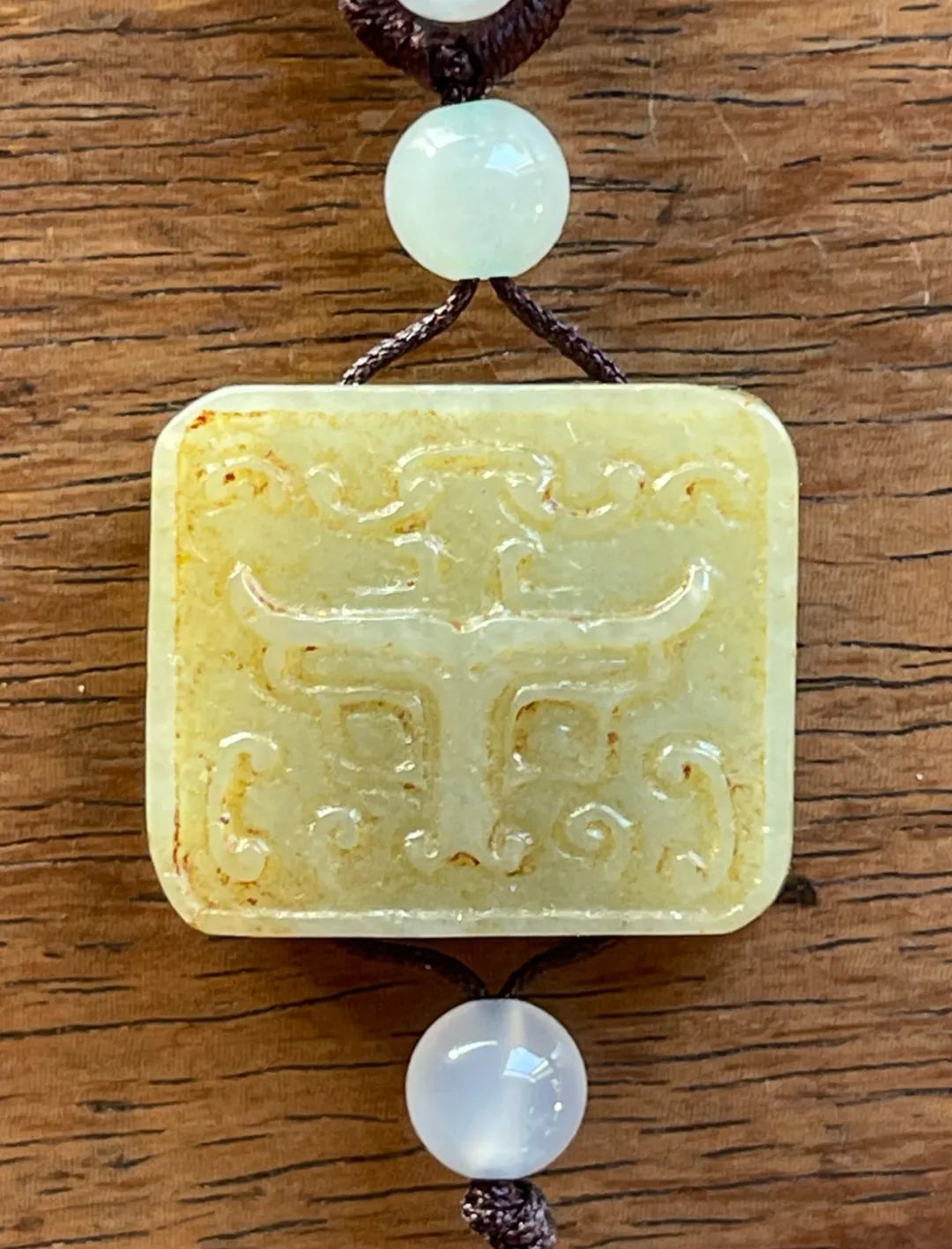 这是一件厚片白玉雕饕餮纹正方牌,正方形厚片和田白玉,单面浅浮雕饕餮纹,白玉质地纯净带褐黄沁,无瑕,上方钻穿线孔,搭配白玉髓配珠设计成绳结吊坠项链。