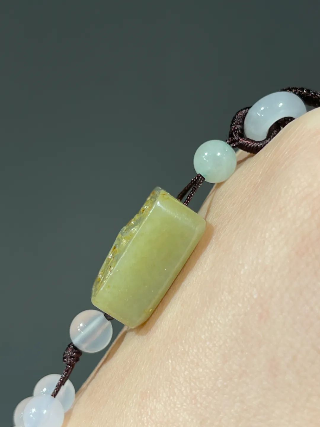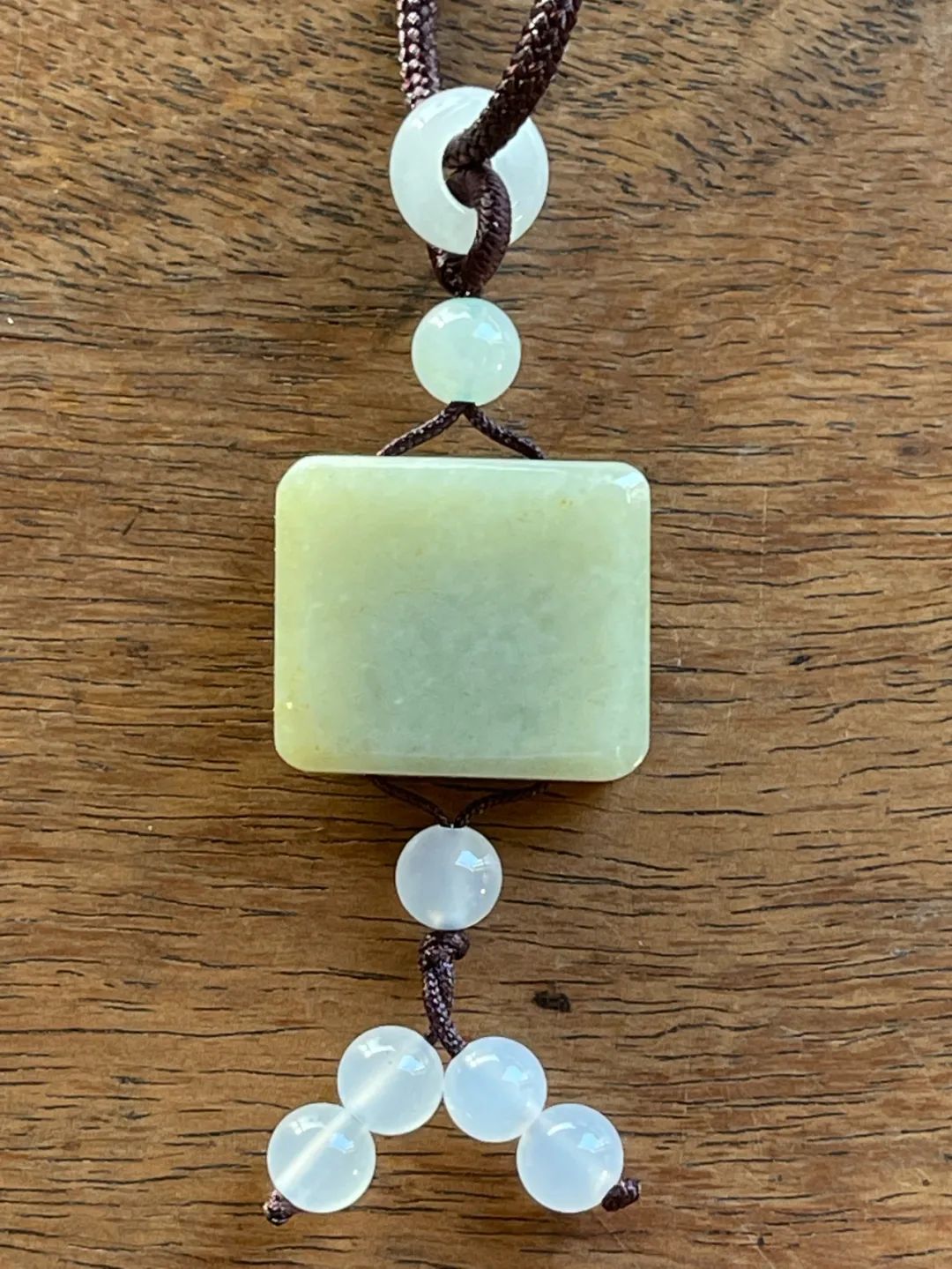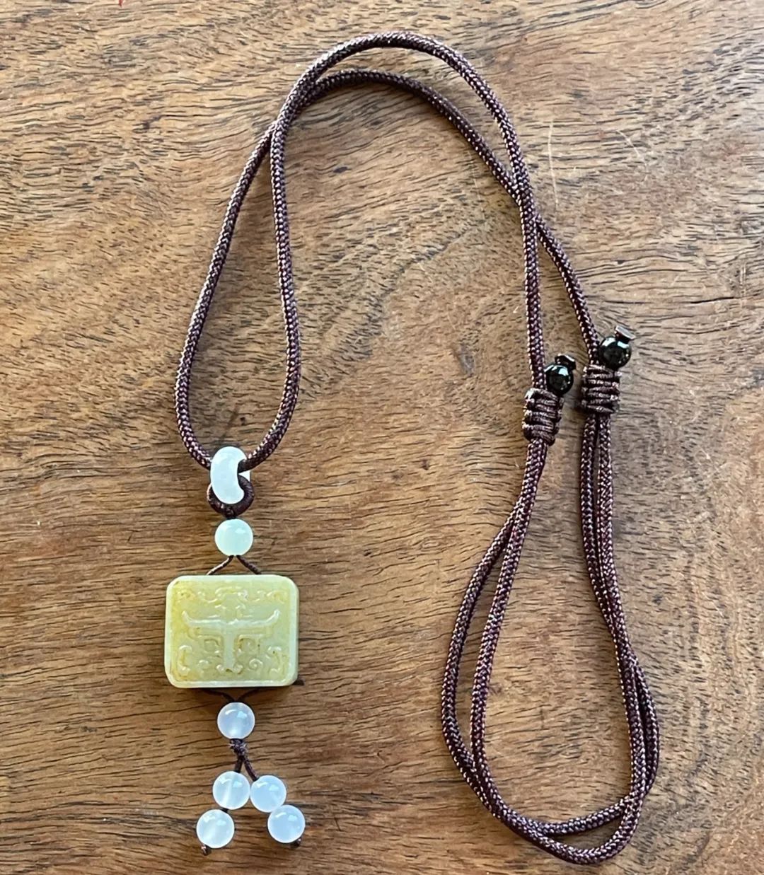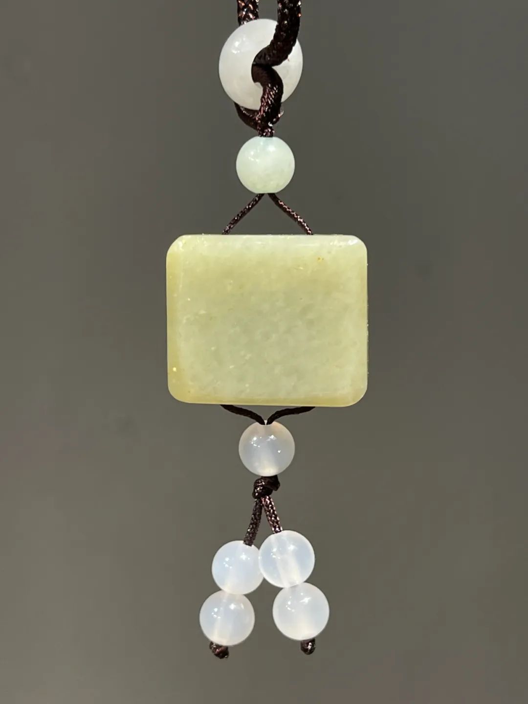 这是一件厚片白玉雕饕餮纹正方牌,正方形厚片和田白玉,单面浅浮雕饕餮纹,白玉质地纯净带褐黄沁,无瑕,上方钻穿线孔,搭配白玉髓配珠设计成绳结吊坠项链。