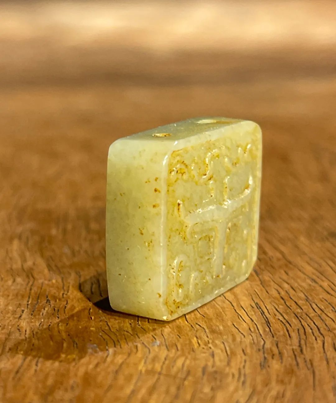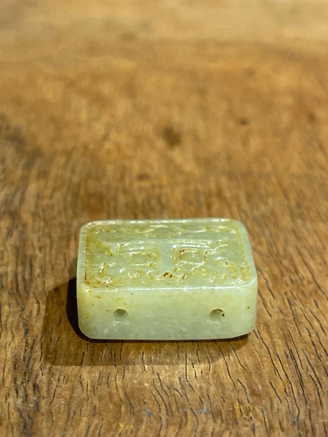 此和田黄玉雕饕餮纹方形吊坠牌,玉牌形式典雅雕琢精美,质地温润,纹饰雕琢细腻,是一只优雅贵气的白玉淑女项链吊坠。 如图所示,除凹槽内有积垢,可以个人喜好剔除,除此以外,保持完好。