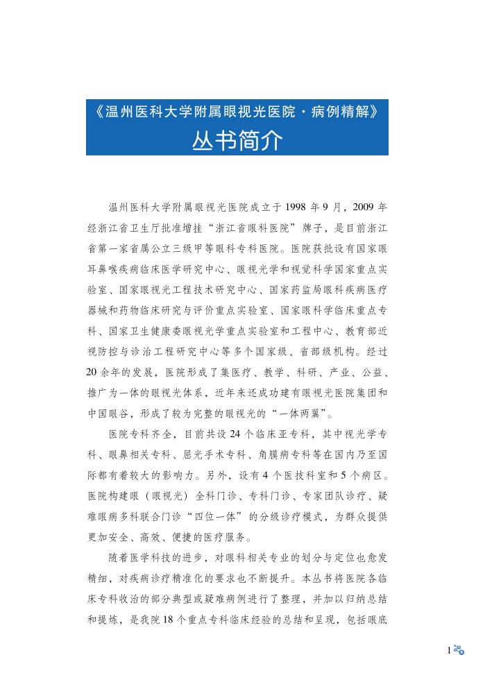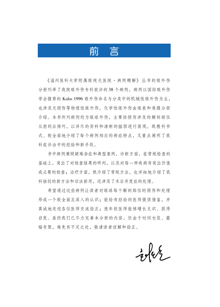 本书列举了温州医科大学附属眼视光医院眼外伤专科所见的38个病例,病例以国际眼外伤学会推荐的Kuhn 1996 眼外伤命名分类法中机械性眼外伤为主,也涉及光损伤这样的物理性眼外伤,化学伤则由眼表和角膜分册介绍。所列病例均为眼球外伤,主要按损伤涉及的解剖部位从前到后排列,并以详尽的资料和清晰的插图来展现。既教科书式地较全面地介绍每个病例相应的疾病,又重点地说明我科在诊治中的经验和新手段。希望通过这些病例使读者对眼球每个解剖部位的损伤和处理形成一个较全面且深入的认识;希望能给有经验的医师提供借鉴并真诚地欢迎交流指正;希望年轻医师能够增长见识、获得启发。