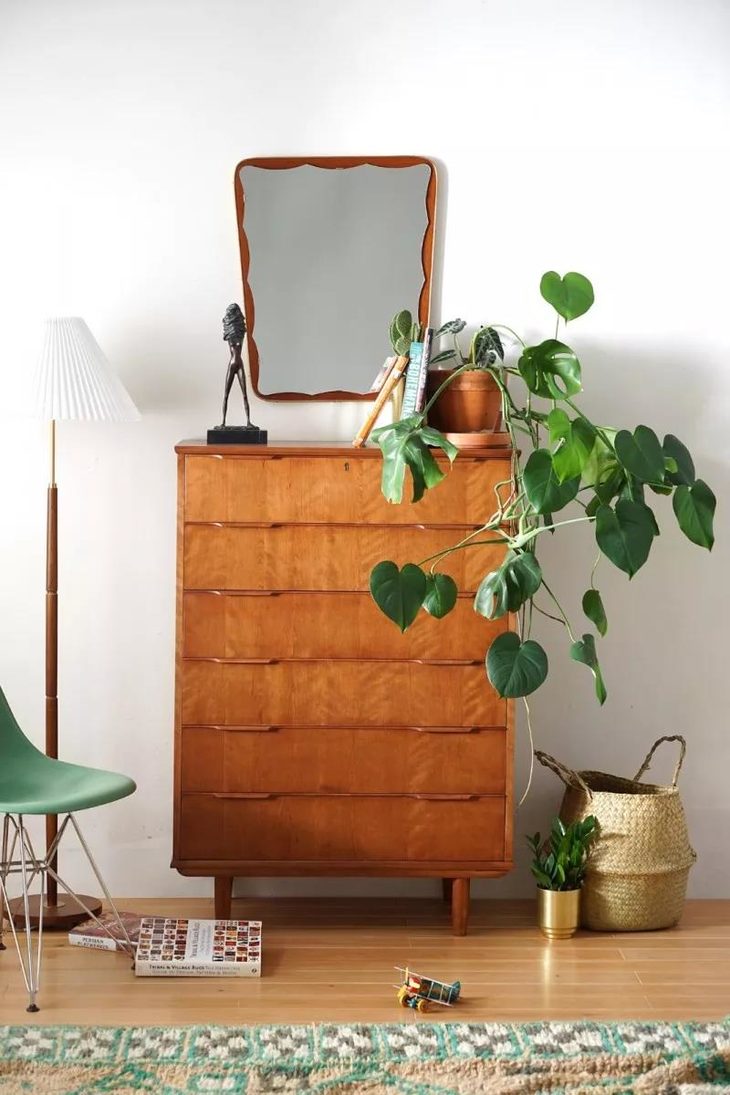 六斗橱不仅能收纳,还能当边柜用,上边摆镜子、绿植和书籍铜像,有很强的装饰性