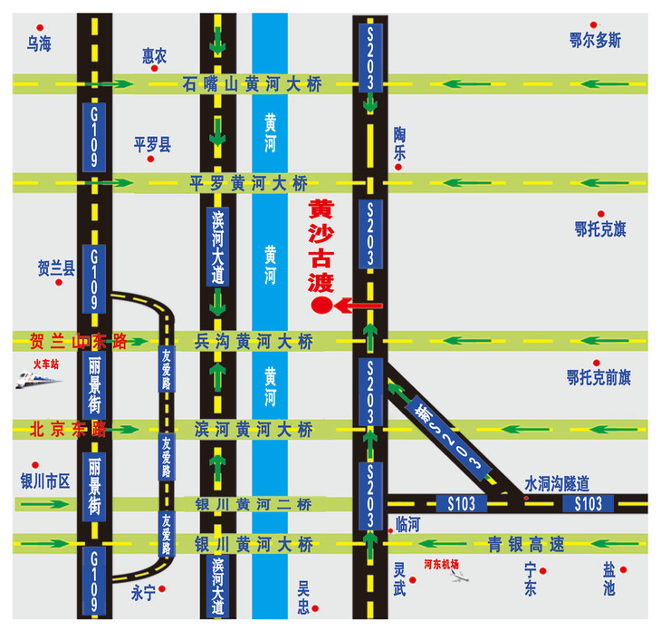 G、贺兰、石嘴山——滨河大道西线向南——兵沟黄河大桥向东——G244(原203省道)向北5km——黄沙古渡景区(月牙湖)