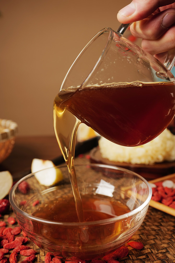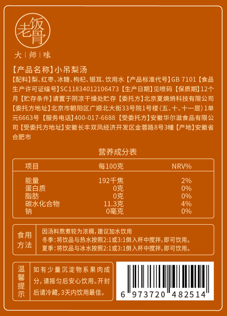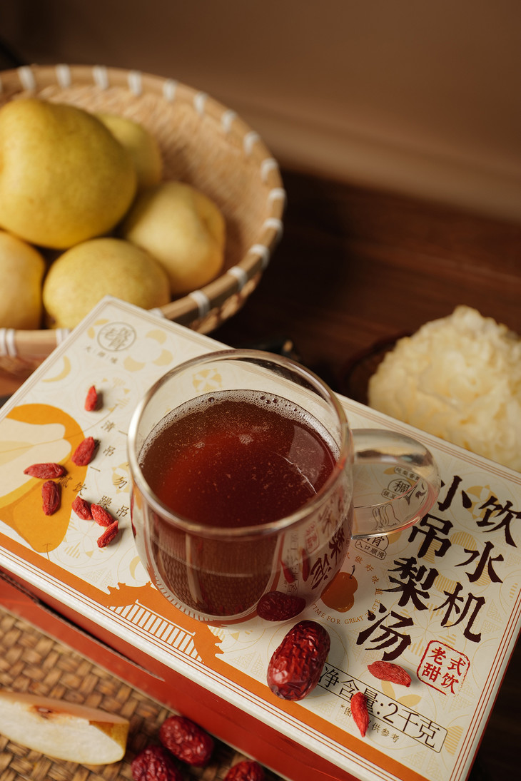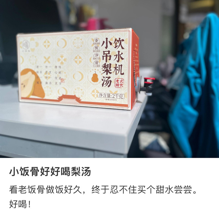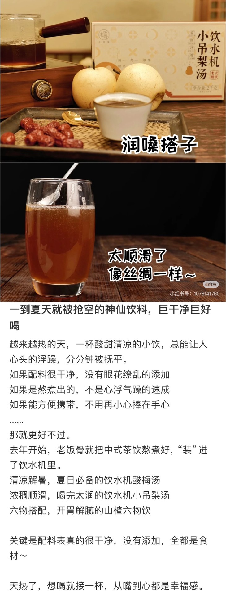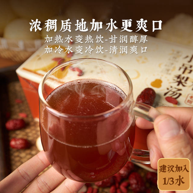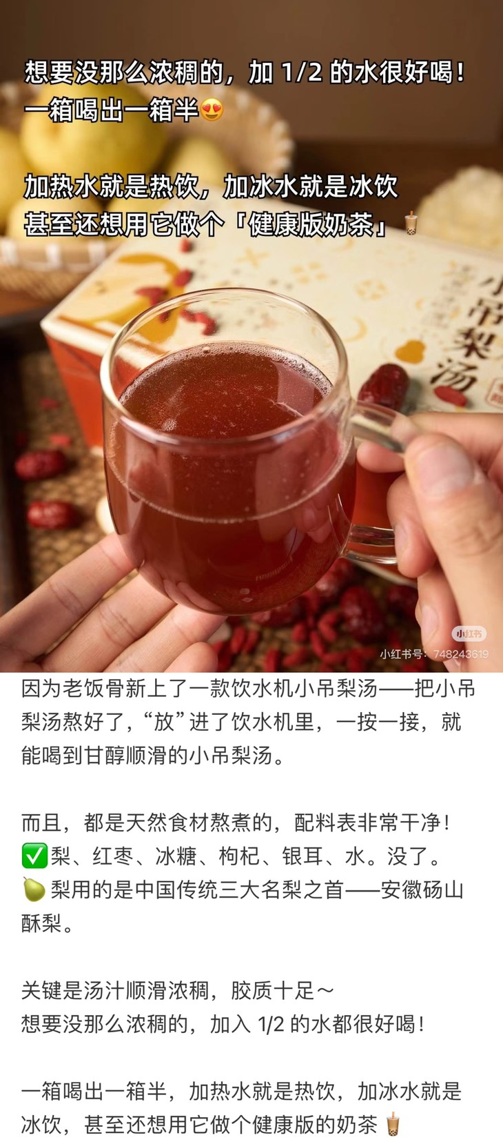 小吊梨汤是变稠厚的,有着浓郁的炖梨香气,入口丝绸般顺滑,且胶质十足,是梨汤中的浓郁plus版本!根据个人口味,喜欢厚重口感,按梨汤:水=3:1加水,这样得到的梨汤梨香满满,香甜挂口,而偏爱清甜口感的,可以梨汤:水=2:1,更清香解渴!姨妈期或冬天时想暖一暖,可以加热一下,小火锅的夏日,就冰一冰,清爽解腻,完美适配,绝不糊弄!