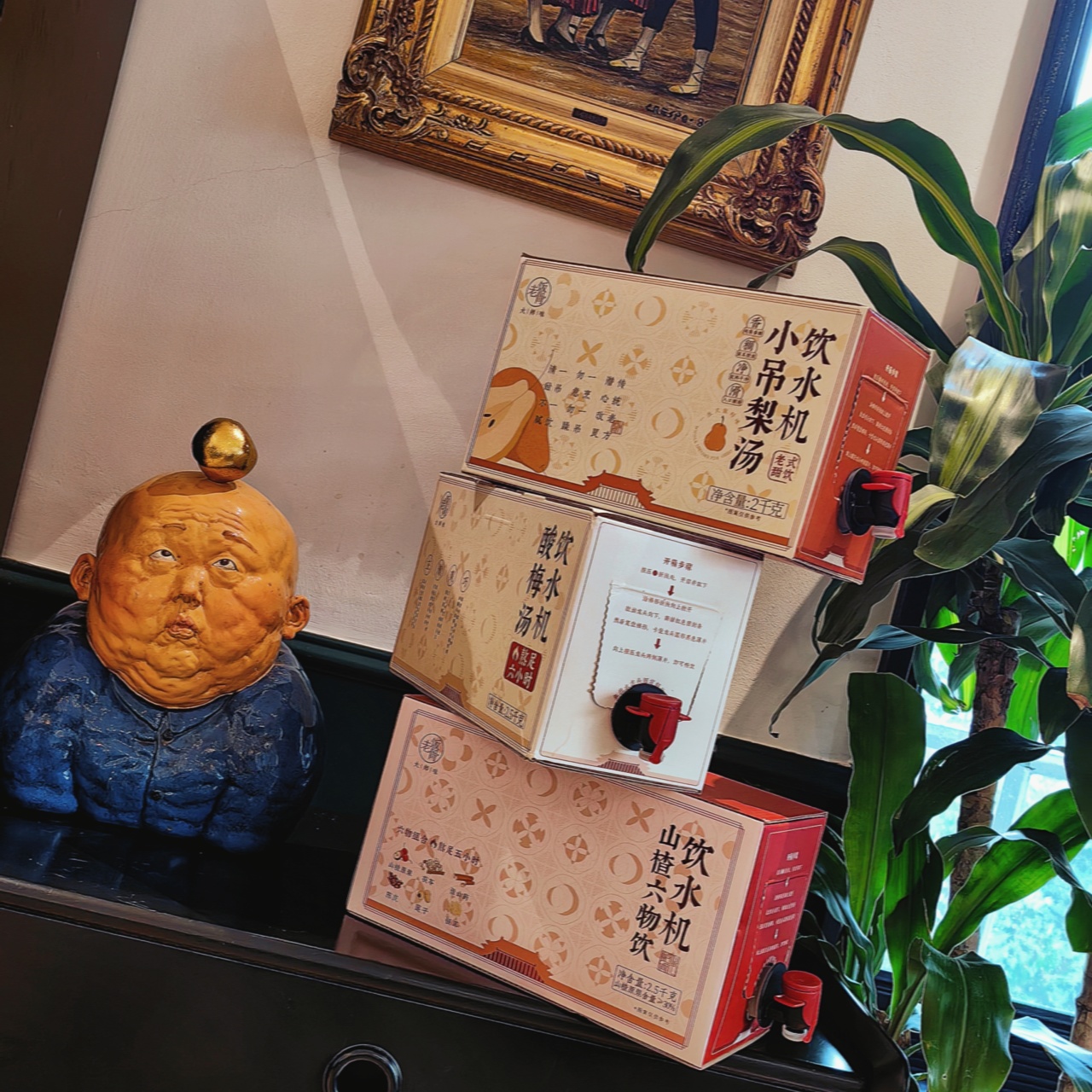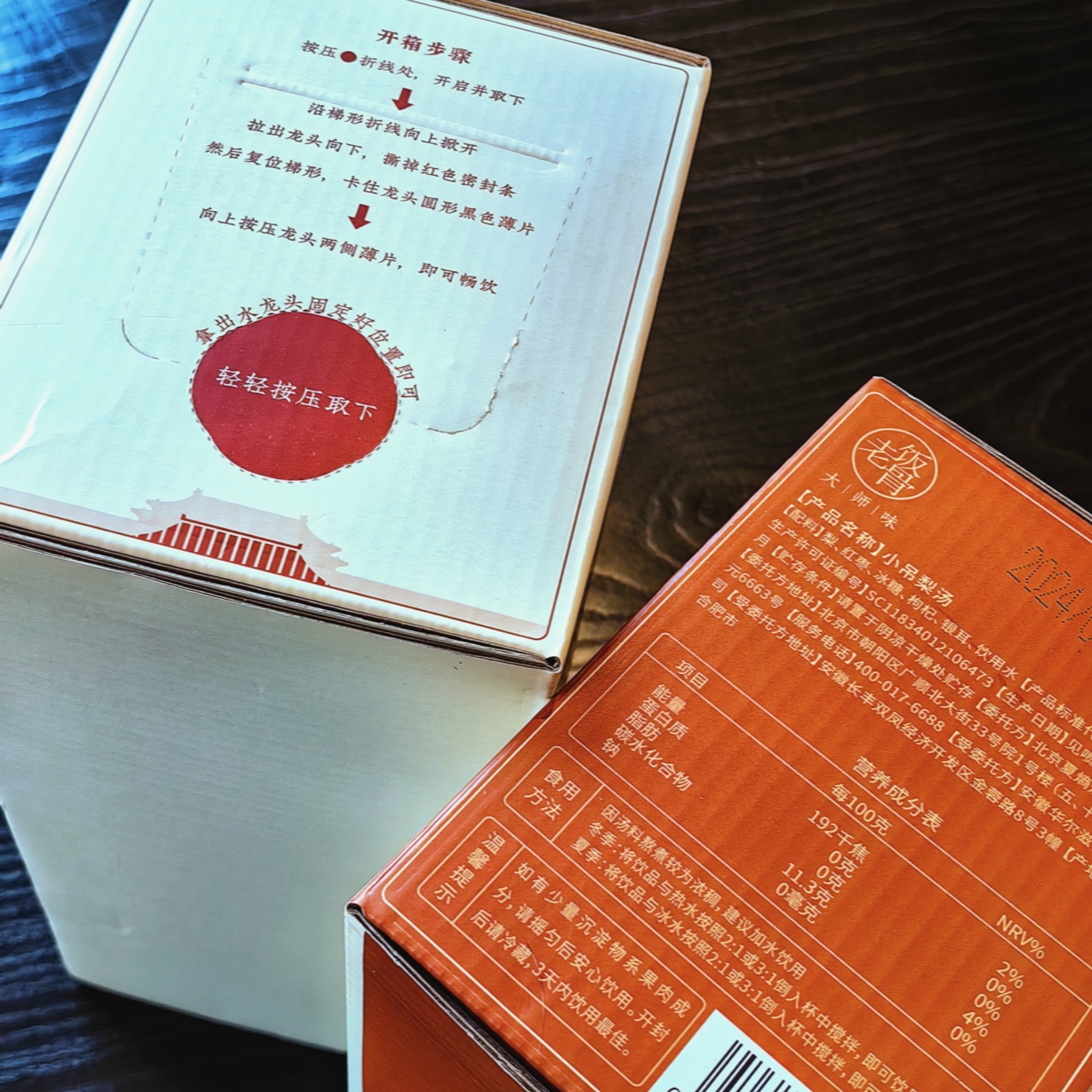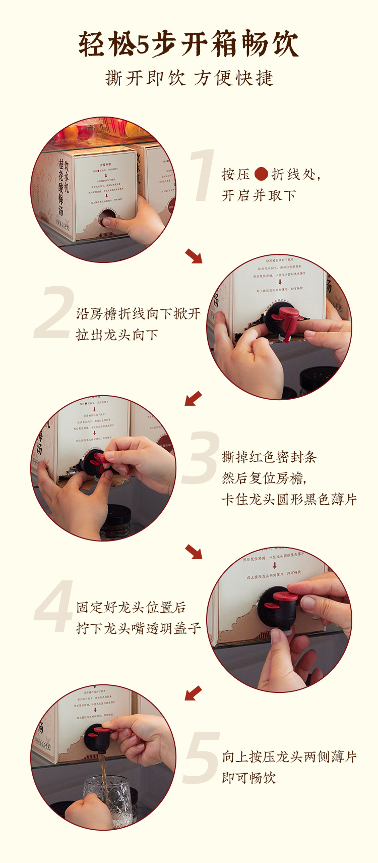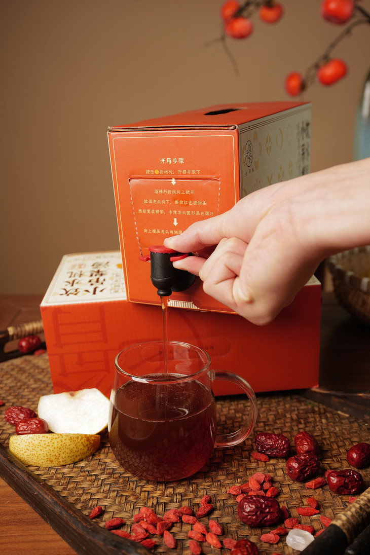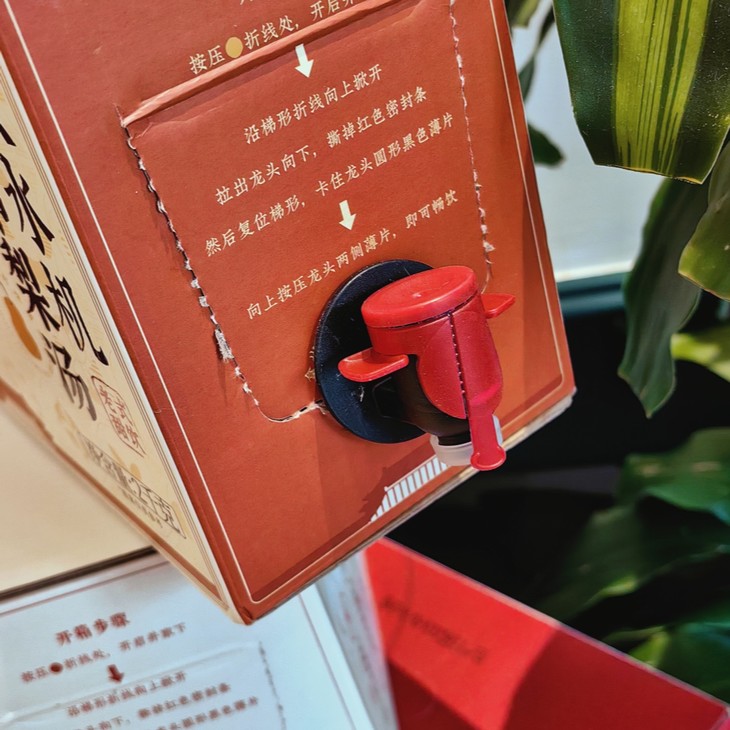 小吊梨汤一大箱,重达2kg,外观设计也别具一格,方方正正,轻松放入冰箱,随时保持最佳口感。饮用时,只需在侧面沿虚线按压开箱,拉出水龙头卡好,撕去密封条,即可变身为便捷的“小吊梨汤饮水机”了。轻轻一捏水龙头按钮,香稠润滑的小吊梨汤即刻流淌而出,放办公室还可以和同事分享一下,聊点小八卦!