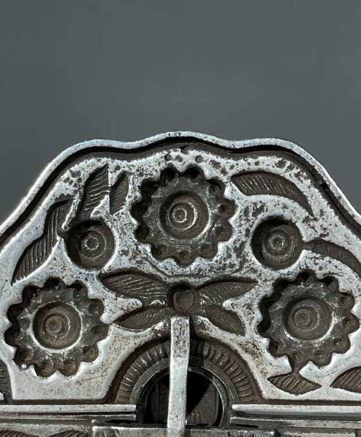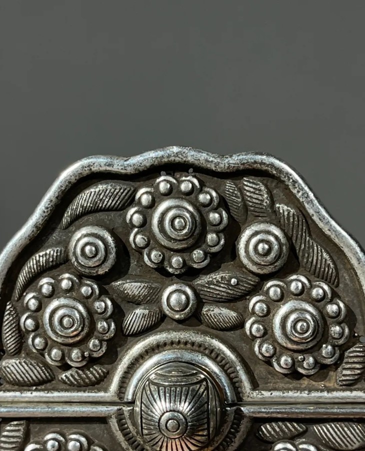 这是一件设计典雅、錾工精细、制作严谨的藏银服饰扣环,海棠花形银片,精心錾刻宝相花,合页中央以钩环联接,整体纹饰华丽精致,设计奇巧实用,是高端老式服饰的扣环。