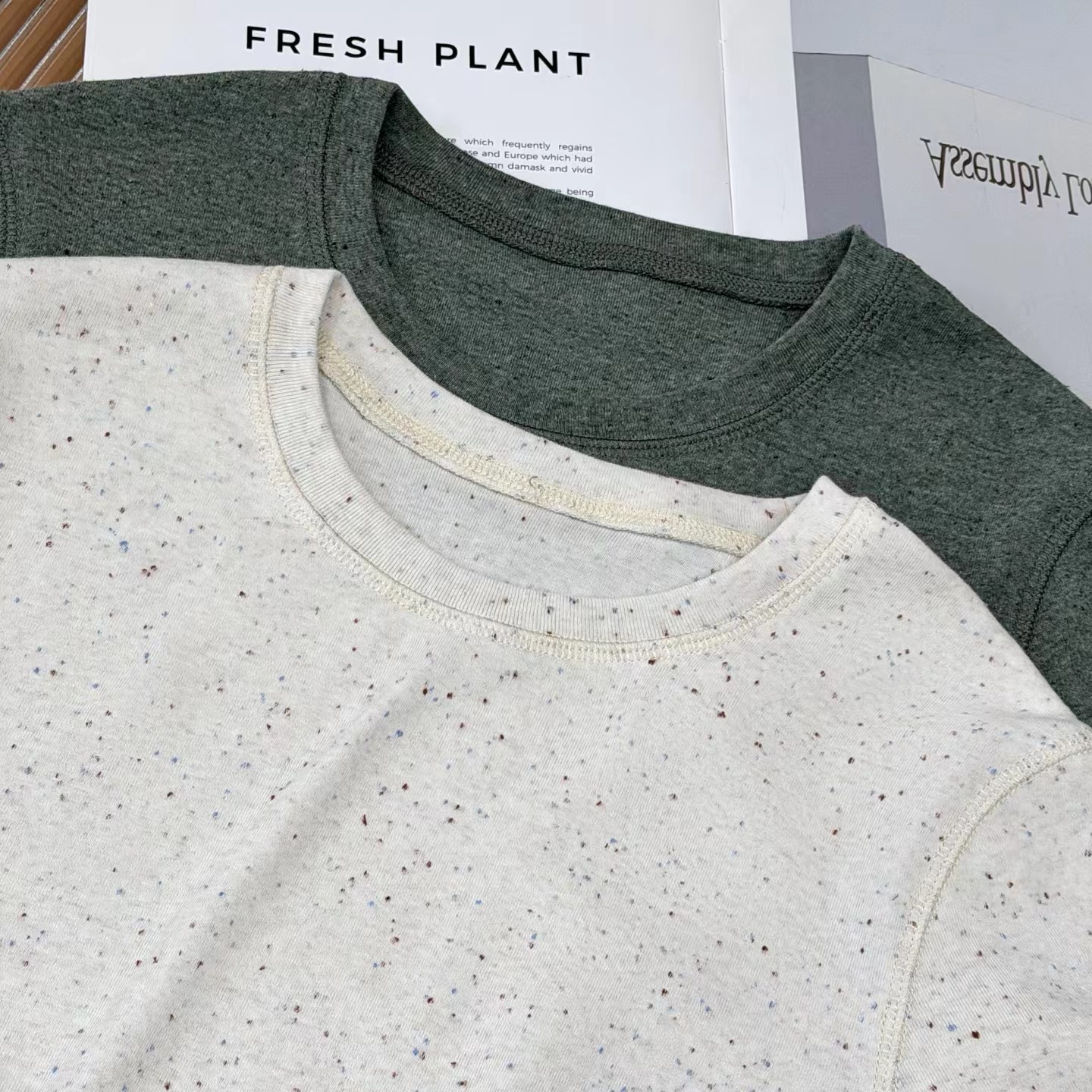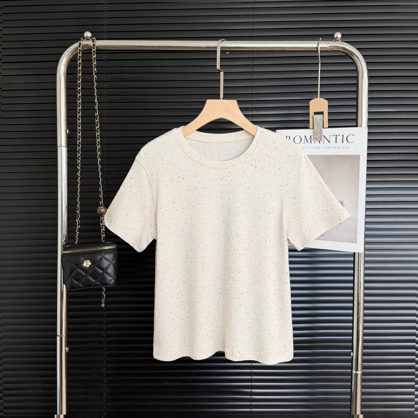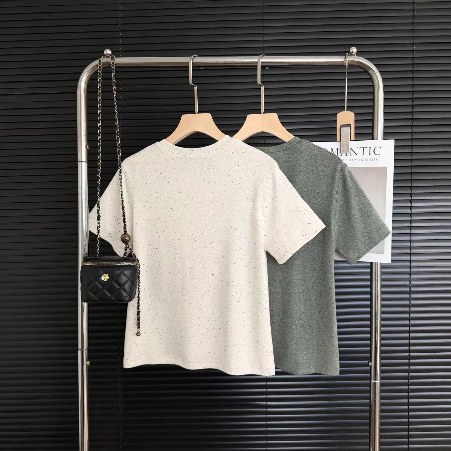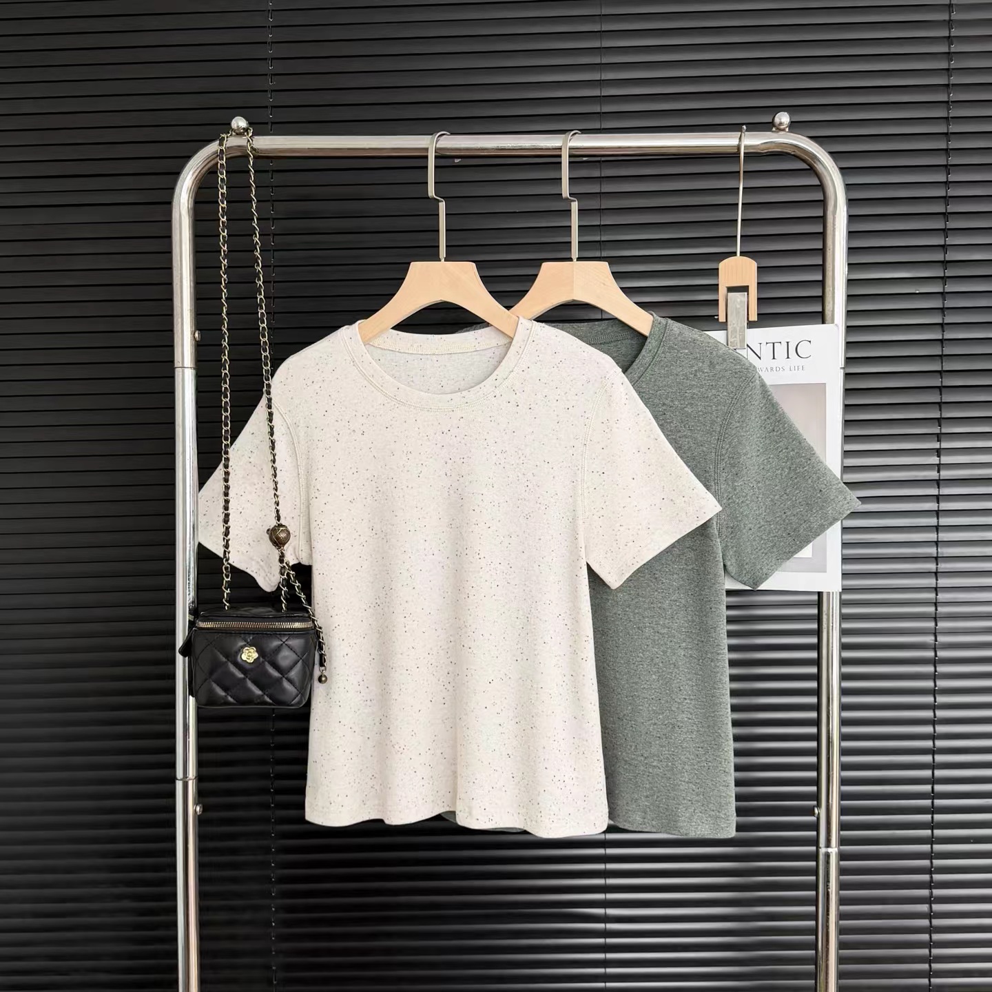 定染彩点花纱棉~设计感舒适圆领百搭T恤短袖时髦巨美的点子纱短袖T袖!!INS博主随性出行的wang牌“jing典T恤’柔润光泽美轮美奂,獨家定染gao级2色提气时髦,显白不挑人,奢侈舒适的亲柔体验,jing典百搭,舒适易打理~荃新点子纱线带来gao级舒适体验,定制点子彩纱混纺面料,颜色治愈星星点点不规则的颗粒点子纱,随着光影呈现微妙机理质感的独特辨识度,高针密织法制作而成更富有层次立体感,棉的天然亲肤赋予肌肤云朵轻拥般的柔润,聚酯纤维则赋予衣身垂坠挺括的gao级廓形,轻松适配多元场景,棉弹混纺面料兼顾舒适与有型,适配各种身形,圆jing典圆领领,线条柔和修饰脸型,人人适穿~随性大方,舒适耐穿,平整利落短袖长度轻松藏手臂拜拜肉。衣长适穿率高,日常穿着自带松弛gao级感,无论是通勤还是休闲场合都恰到好处~