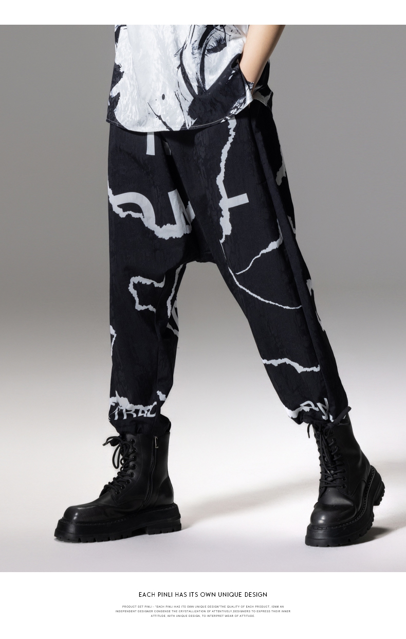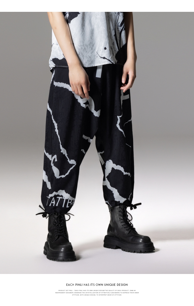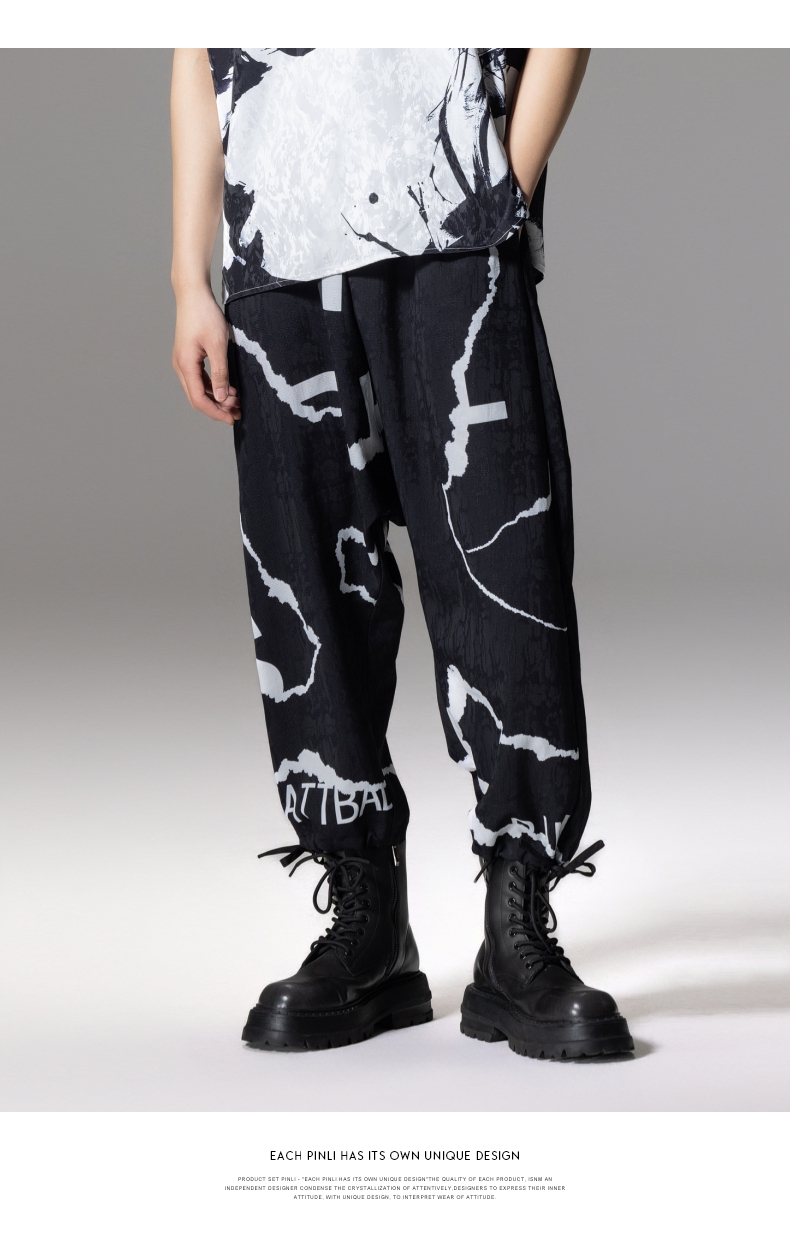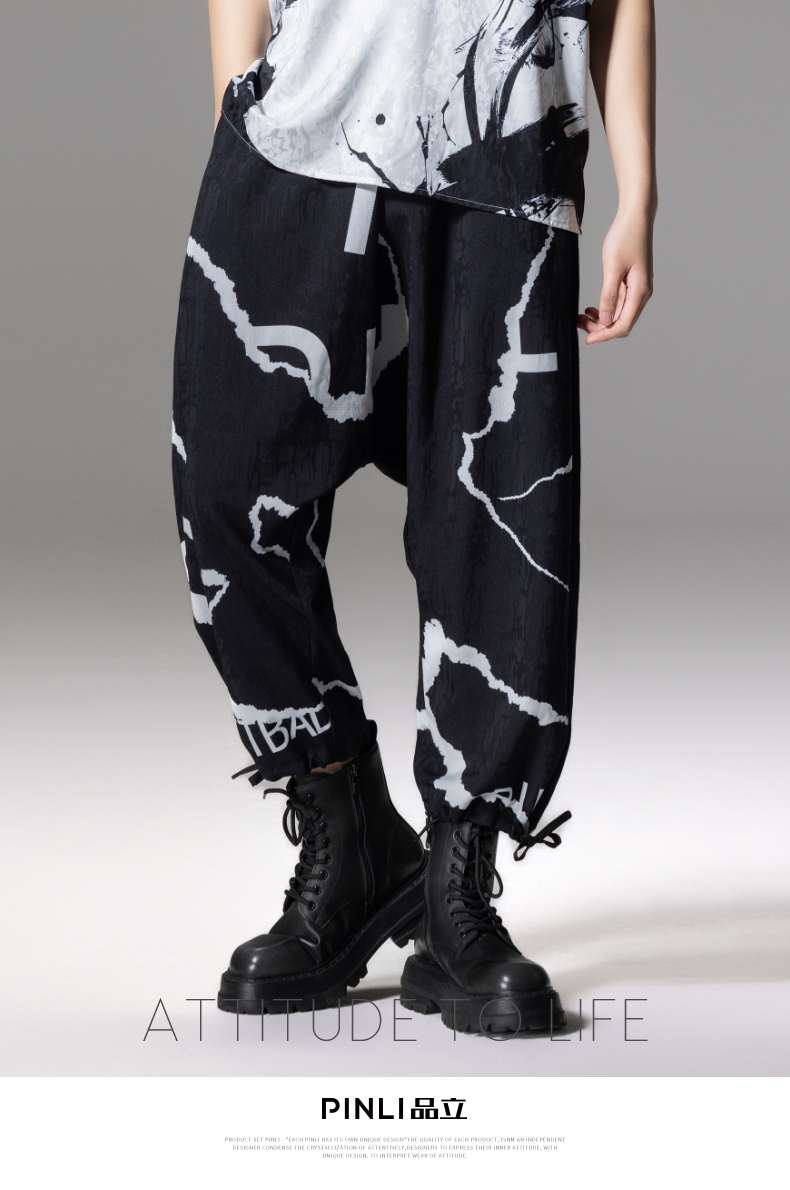 PINLI品立夏季新款印花撞色束脚裤宽松九分裤男士潮牌休闲裤B242117176