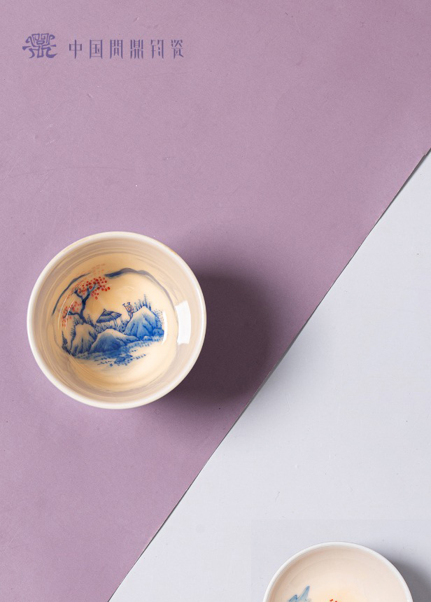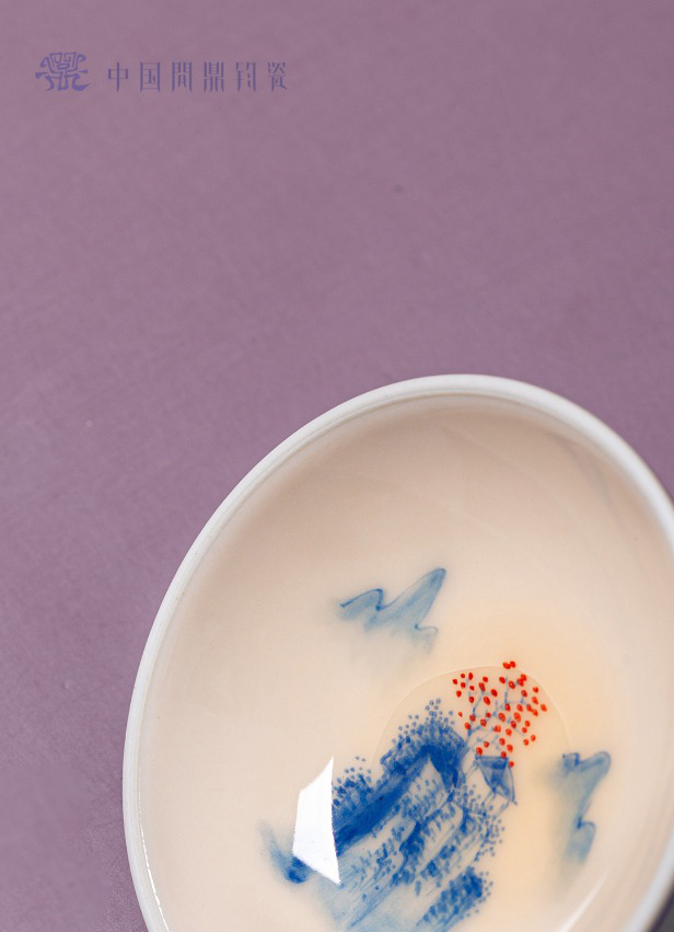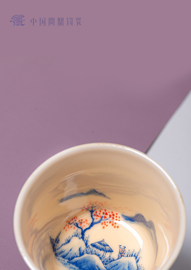 问鼎钧瓷鹅黄青花精工款华彩盖碗(碧水秋山)