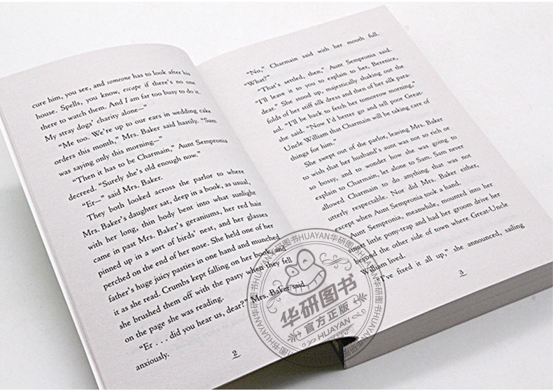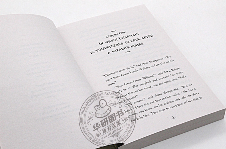 “Charmain must do it,” said Aunt Sempronia. “Wecan’t leave Great-Uncle William to face this on his own.” “Your Great-Uncle William?” said Mrs. Baker. “Isn’t he…” She coughed and lowered her voice because this, to her mind, was not quite nice. “Isn’the awizard?” “Of course,” said Aunt Sempronia. “But has…” Here she too lowered her voice. “He has a growth,you know, on his insides, and only the elves canhelp him. They have to carry him off in order tocure him, you see, and someone has to 1ook after hishouse.Spells, you know, escape if there is no onethere to watch them. And I am far too busy to do it. My stray dogs’ charity alone...” “Me too.We’re up to our ears in wedding cake orders this month,” Mrs. Baker said hastily. “Sam was saying only this morning.” “Then it has to be Charmain,” Aunt Sempronia decreed. “Surely she’s old enough now.” “Er…” said Mrs. Baker. They both looked across the parlor to whereMrs. Baker’s daughter sat,deepintoa book, as usual with her long, thin body bent into what sunlightcame in past Mrs. Baker’s geraniums, her red halt pinned up in a sort of birds’ nest, and her gasses perched on the end of her nose. She held one of her father’s huge juicy pasties in one hand and munched it as she read. Crumbs kept falling on her book, andshe brushed them offwith the pasty when they fell onthe page she was reading.