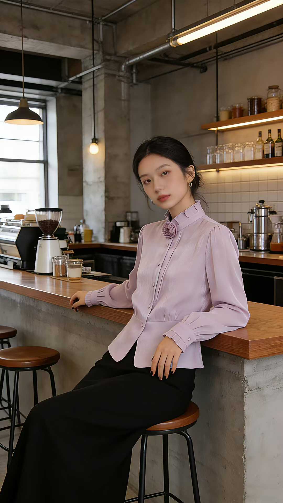 SC1F05 紫薄汗衬衫 荷叶边立领 + 手工花朵、收腰衬衫式外套剪裁、柔光缎面肌理,清冷温婉、端庄知性气质