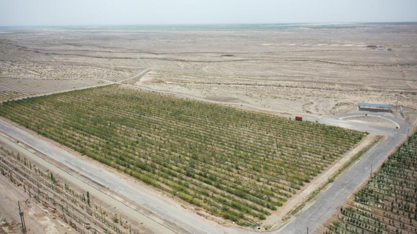 4600公里外的新疆柯柯牙地区,地处塔克拉玛干沙漠北缘的阿克苏,生态环境脆弱,是新疆重点风沙策源地,是抗击土地荒漠化、盐渍化的最前沿。沙漠离阿克苏市城区仅6公里,且以每年5米的速度不断逼近。