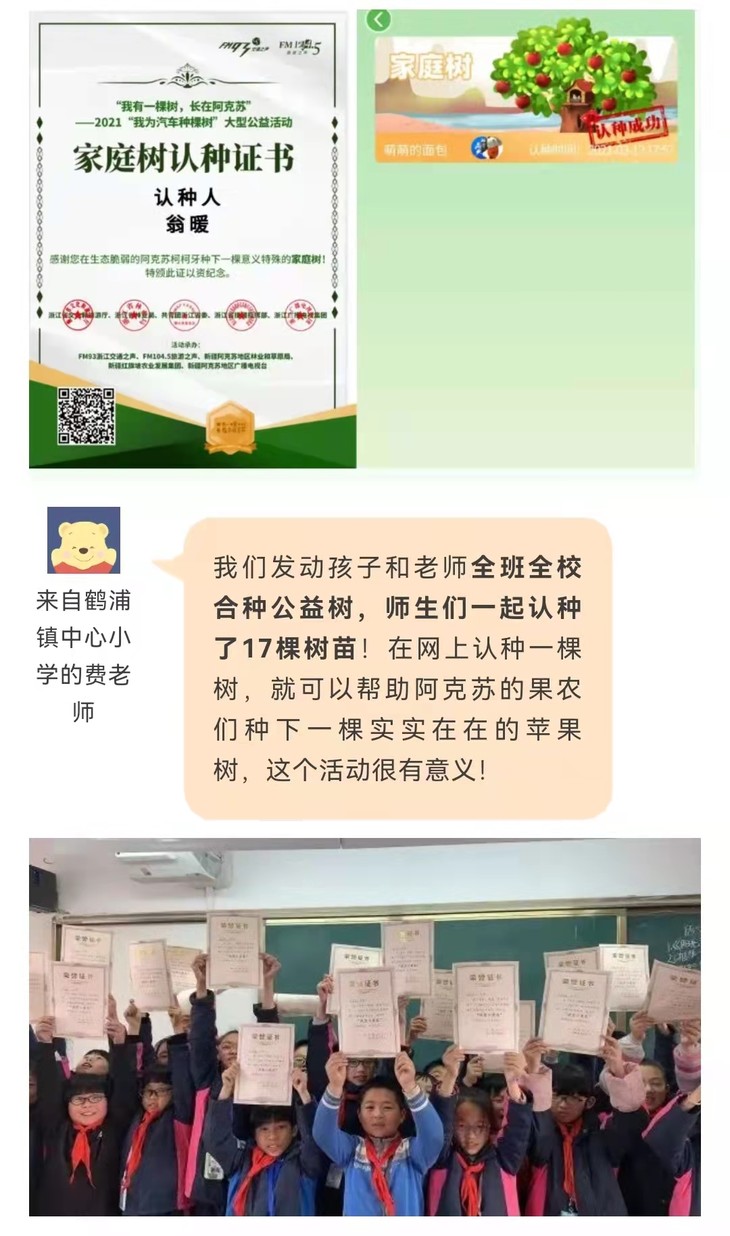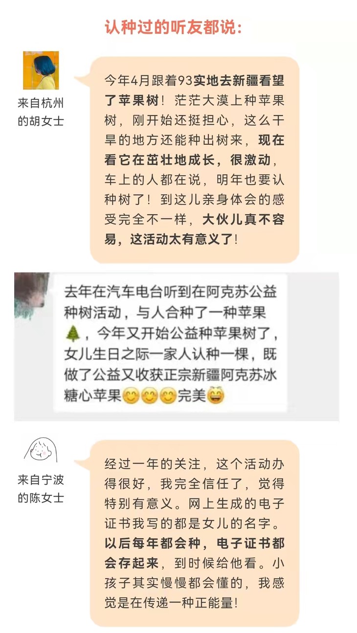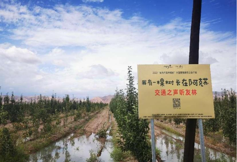 自2020年起,“我有一棵树 长在阿克苏”公益活动在新疆阿克苏柯柯牙地区累计种下超过两万棵果树,让一望无际的戈壁荒漠焕发出更多绿色生机。三年来,已有超过十万人,一千个组织单位,持续播绿。截至目前,在柯柯牙地区已初步形成占地超两百亩的"浙江听友爱心果园"。