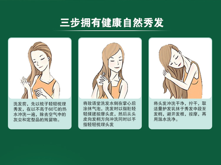 使用方法:湿润头发,取适量本品于头发上,轻柔按摩数分钟,用清水冲洗