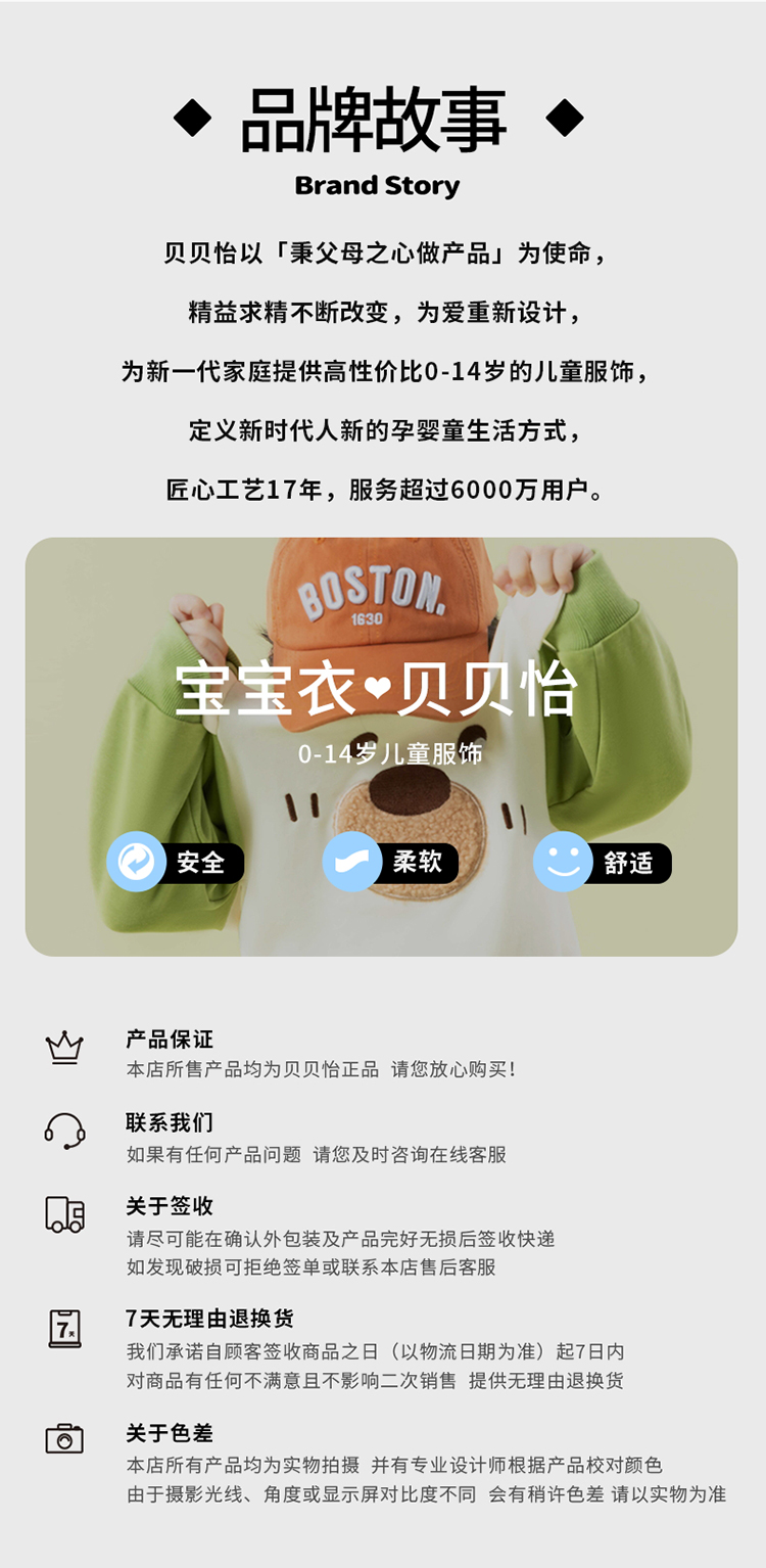 - 贝贝怡专注0-6岁婴幼儿服饰,坚持安全、柔软、舒适的产品理念,为千万中国家庭提供超高品质、安全可靠的婴幼儿服饰产品,妈妈放心,宝宝开心!