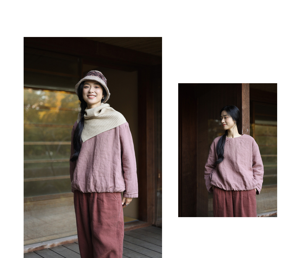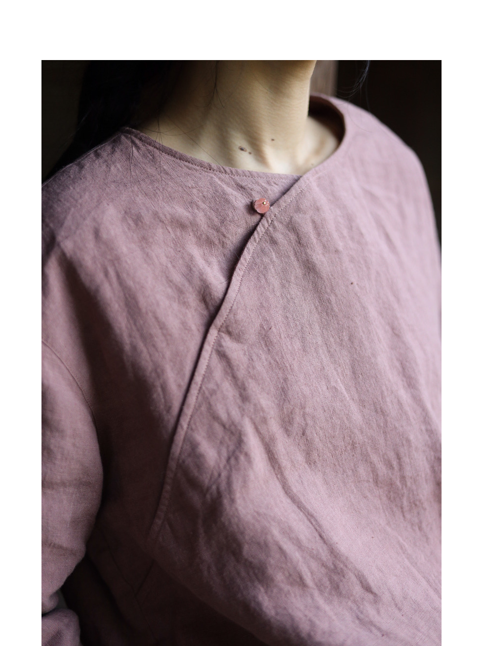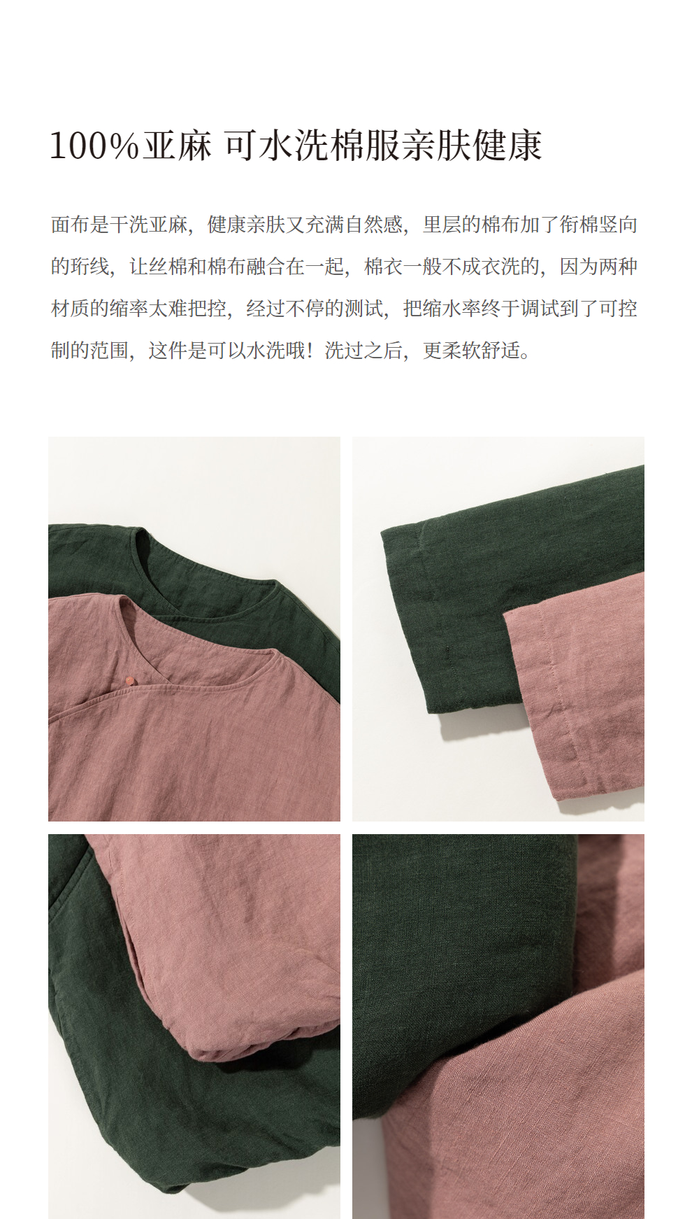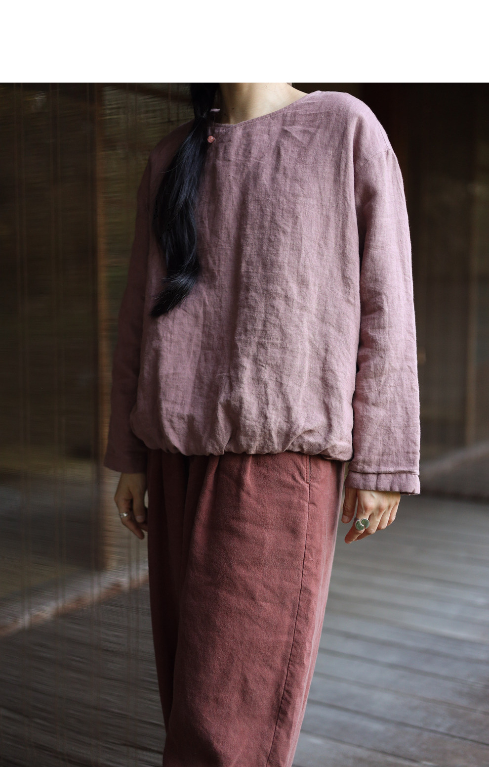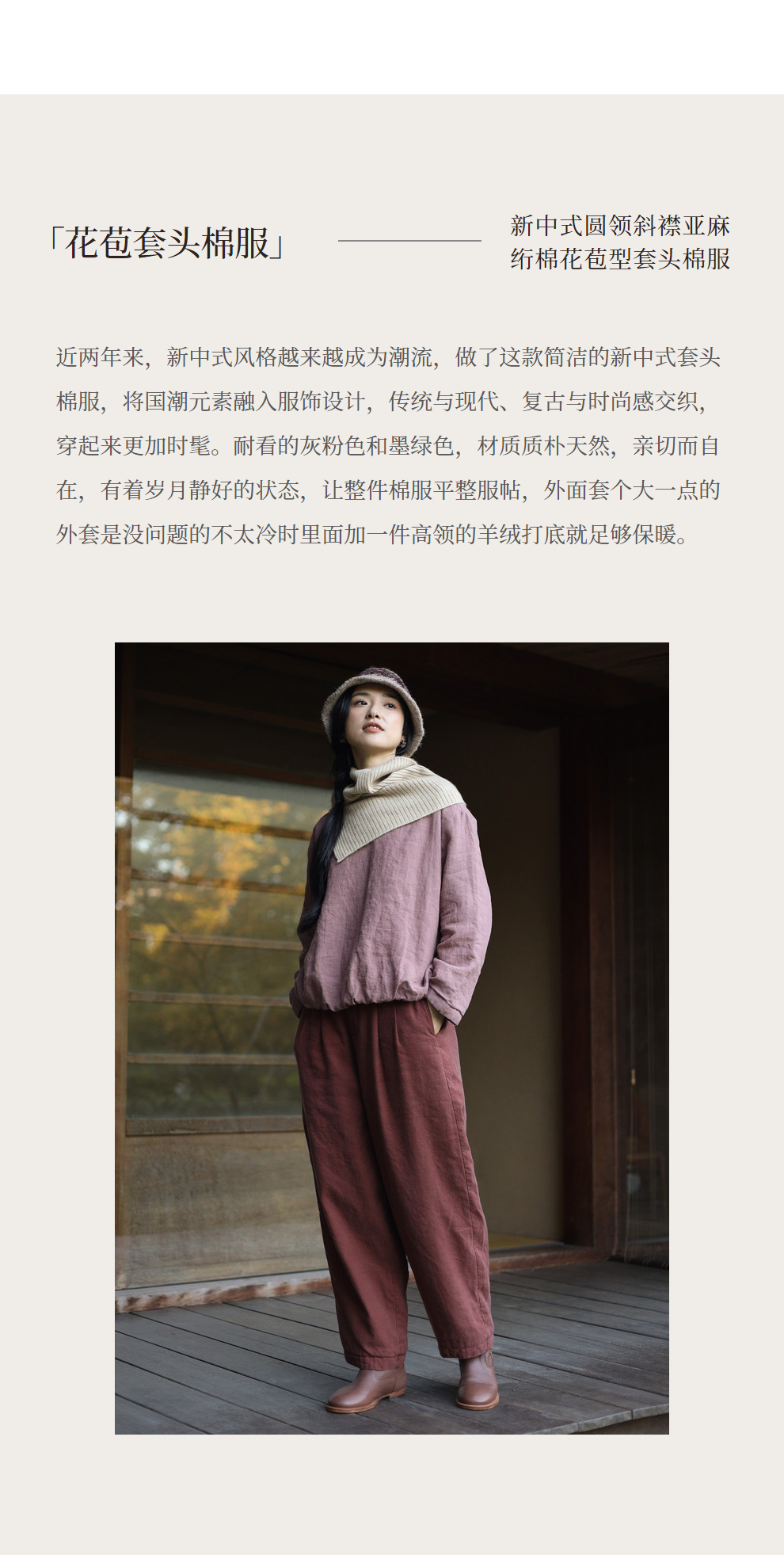 绽放928/灰粉色新中式圆领斜襟亚麻绗棉花苞型套头文艺棉服