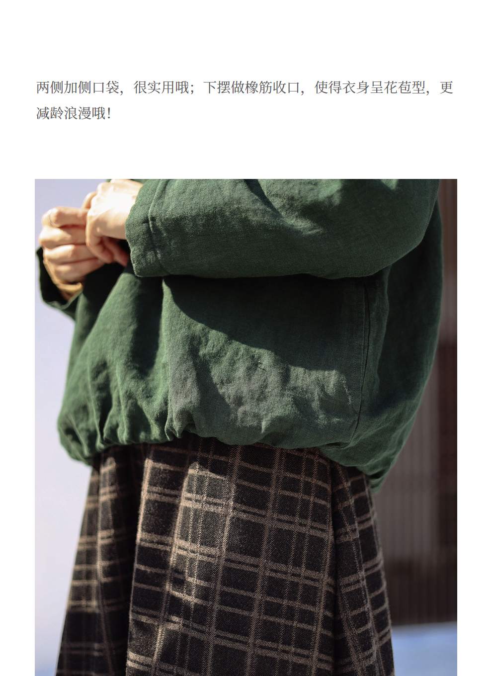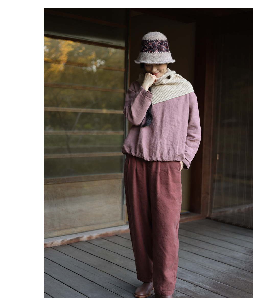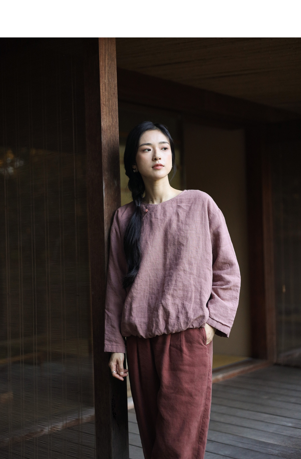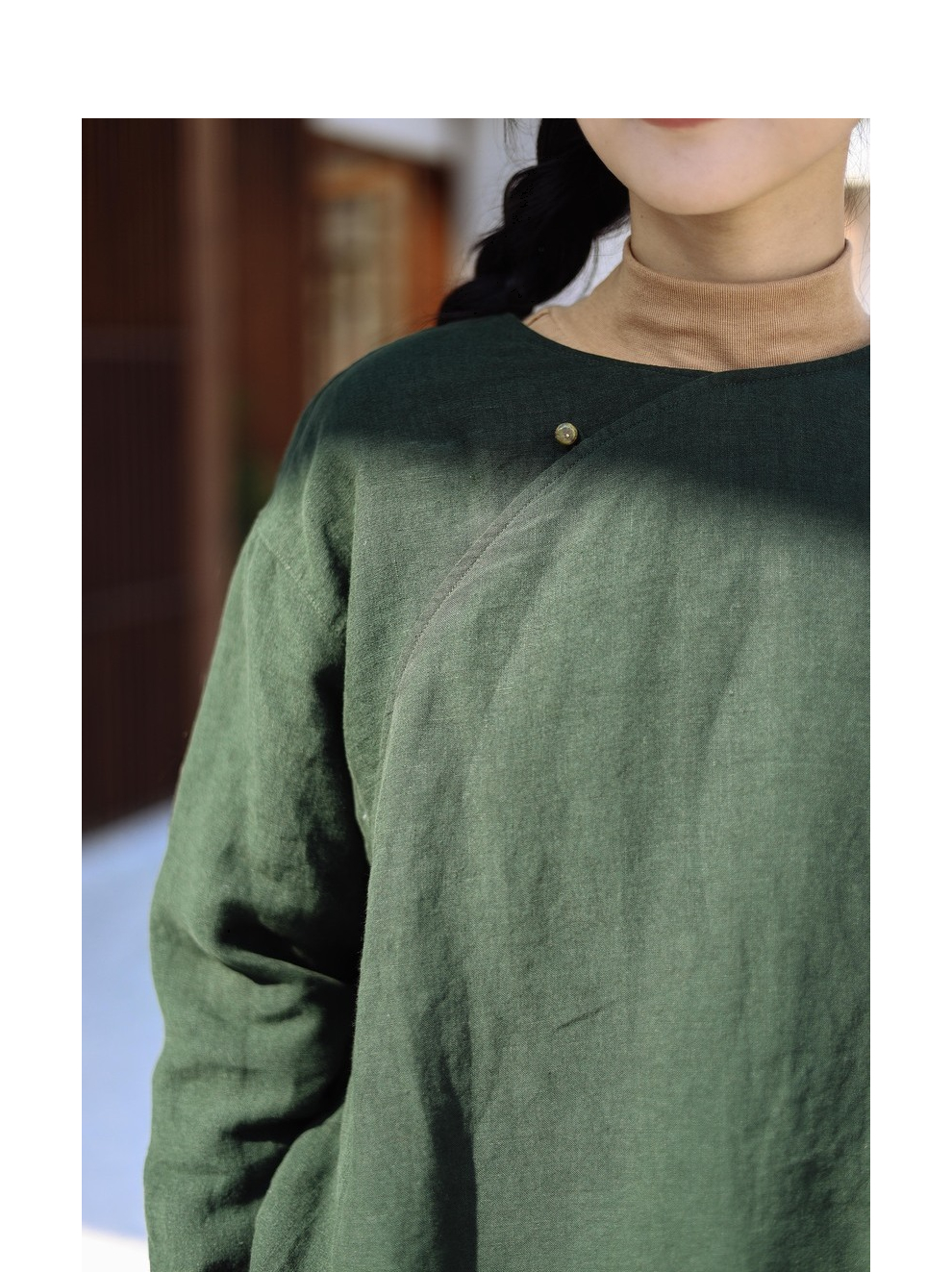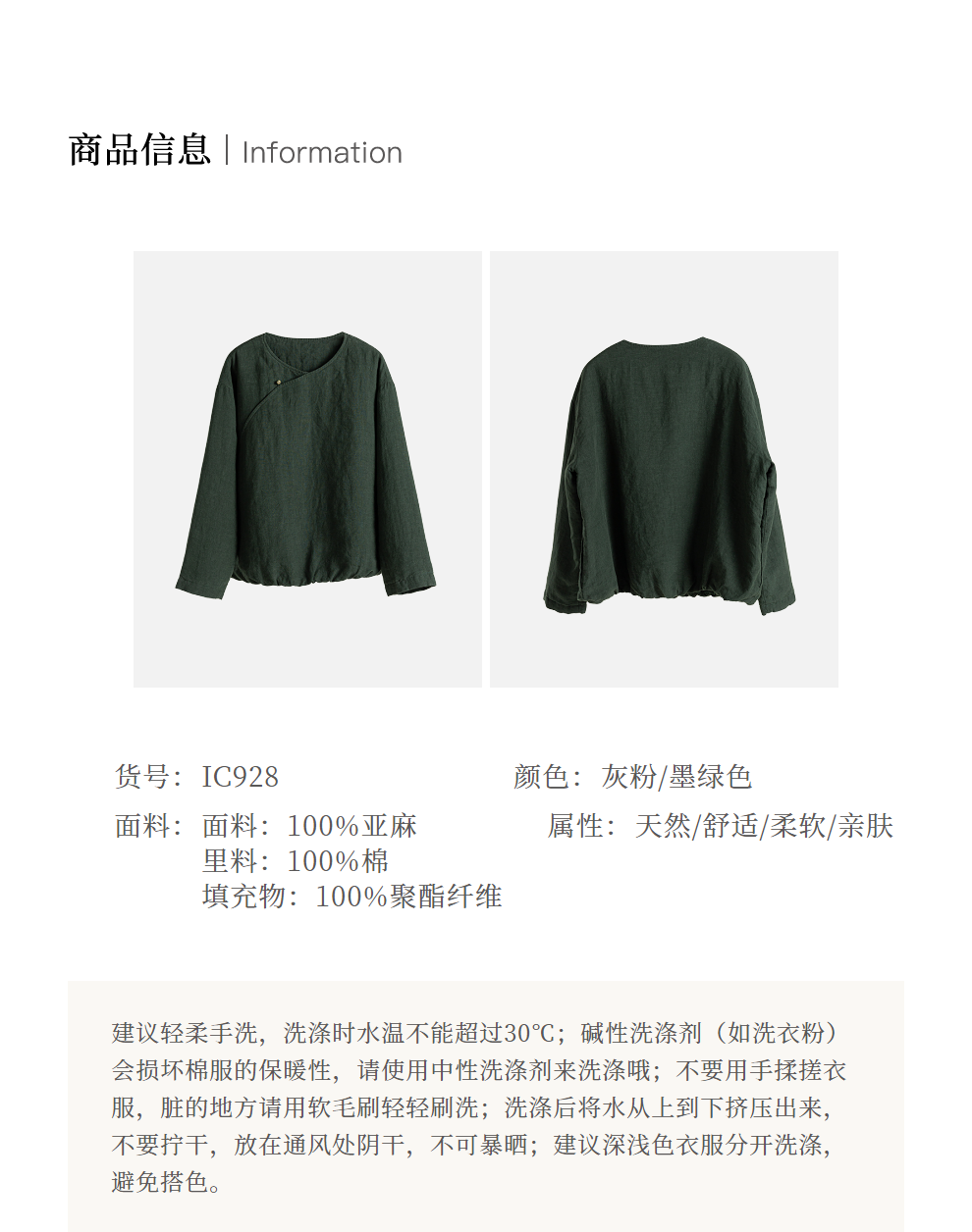 绽放928/灰粉色新中式圆领斜襟亚麻绗棉花苞型套头文艺棉服