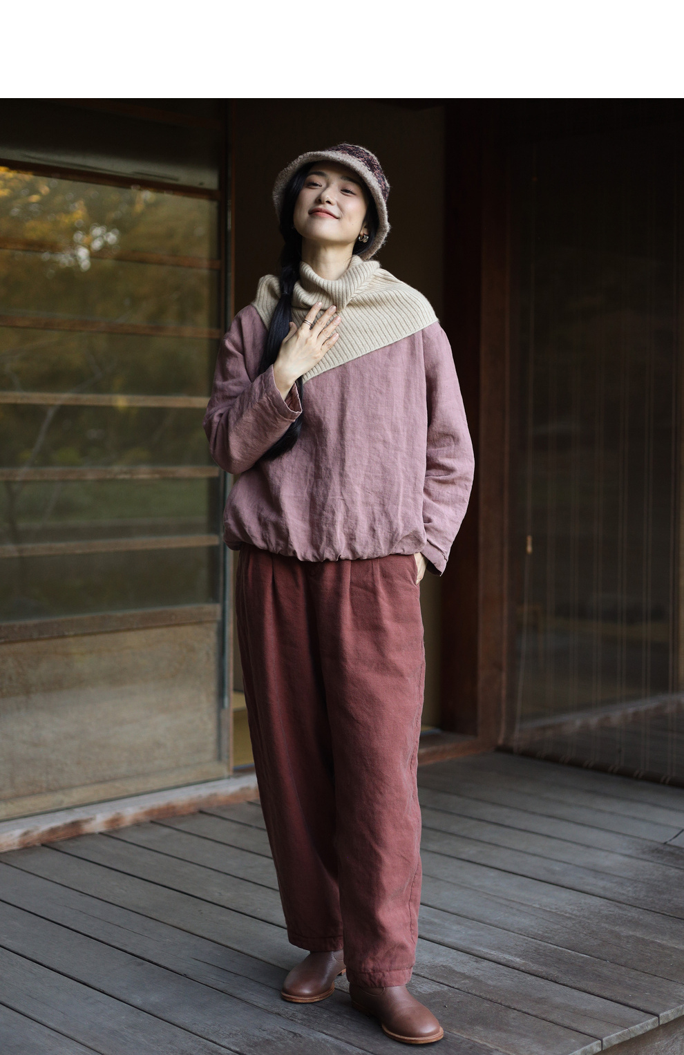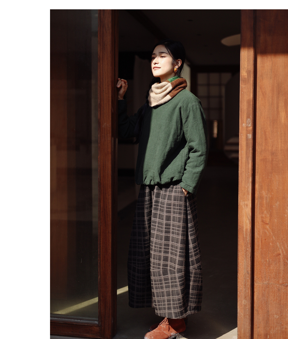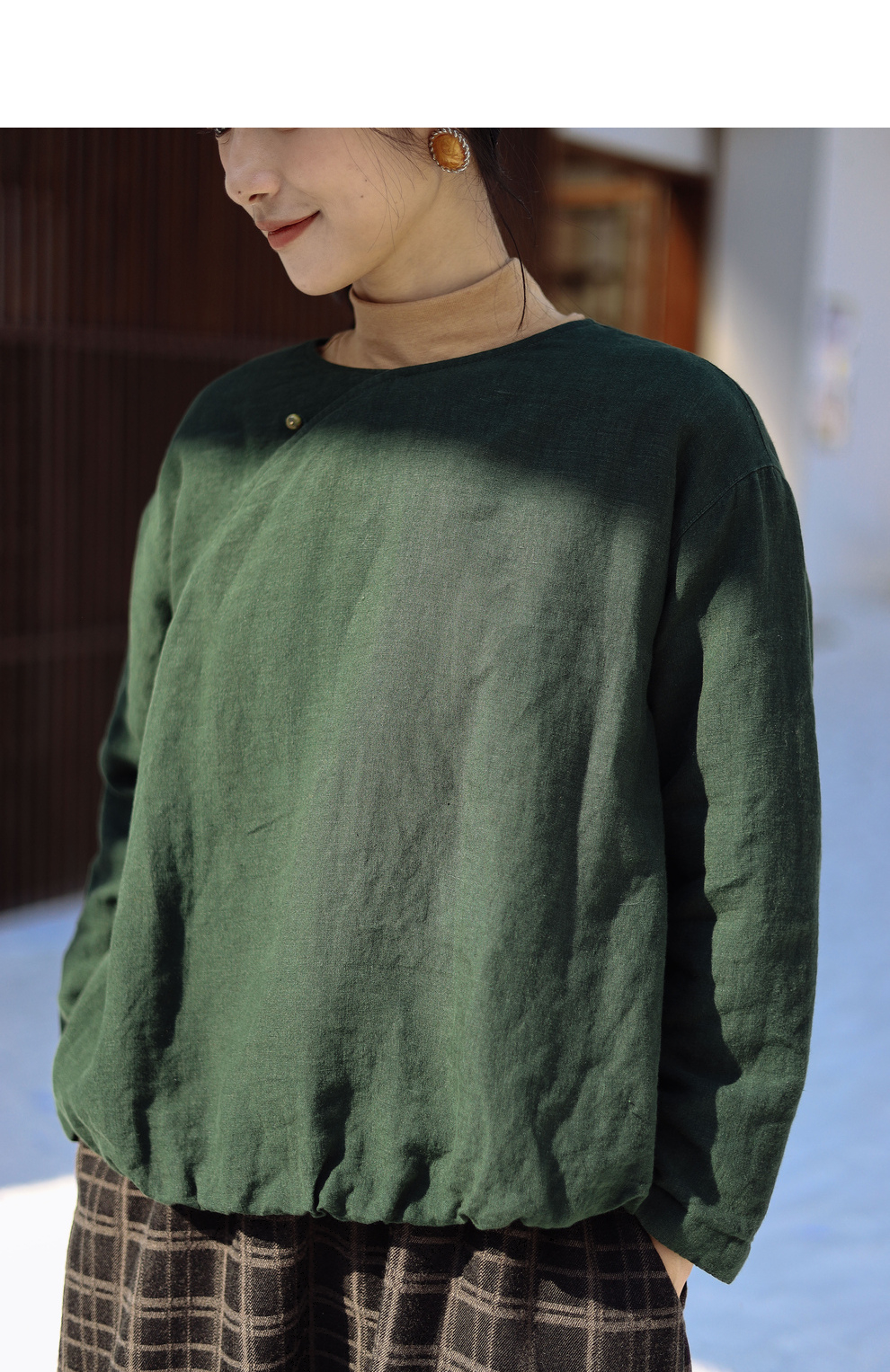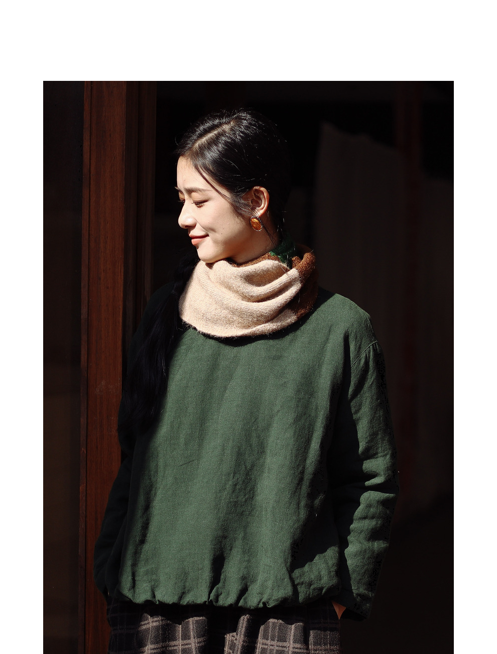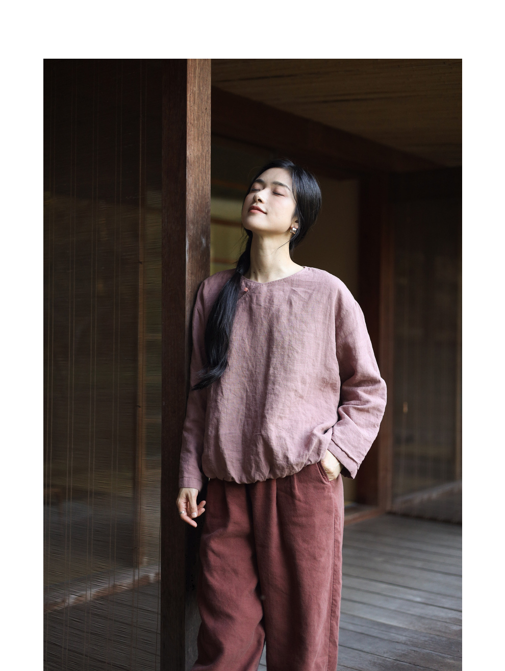 绽放928/灰粉色新中式圆领斜襟亚麻绗棉花苞型套头文艺棉服