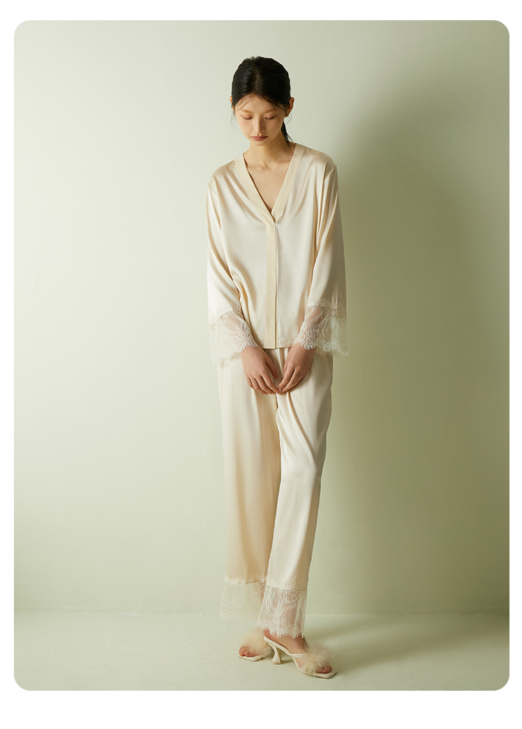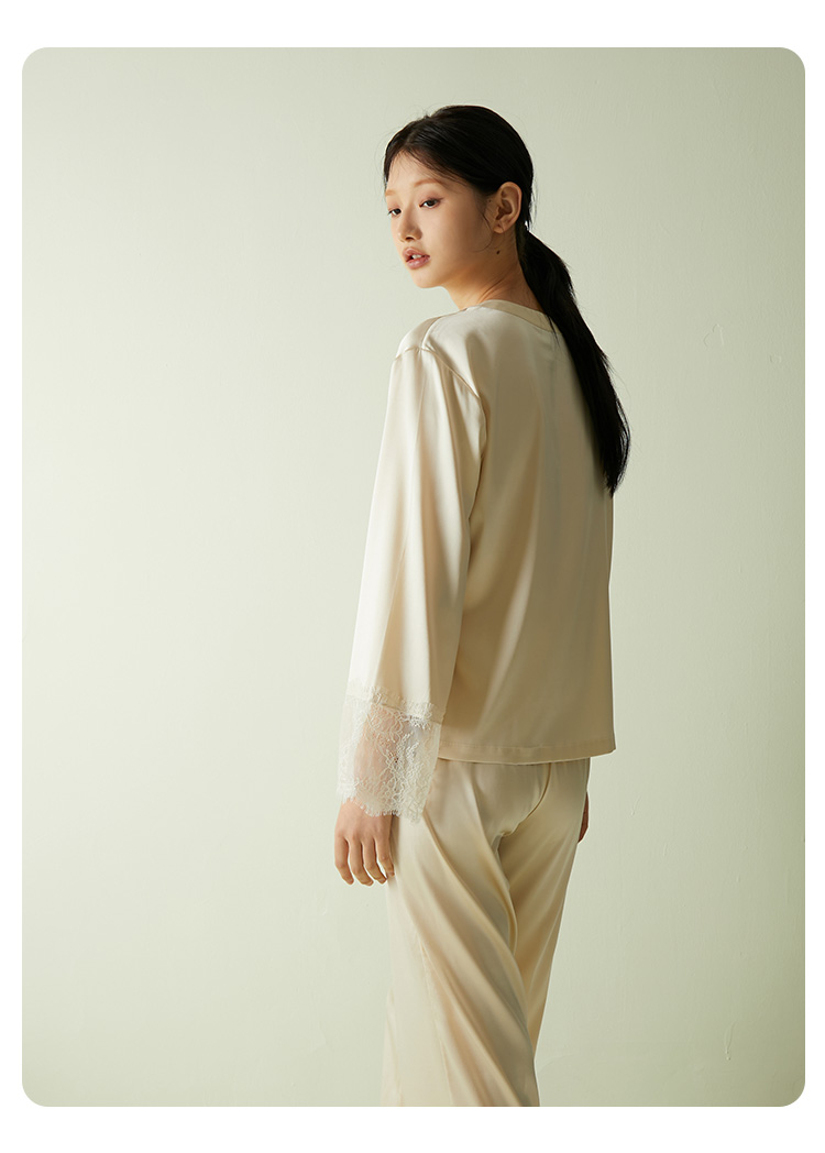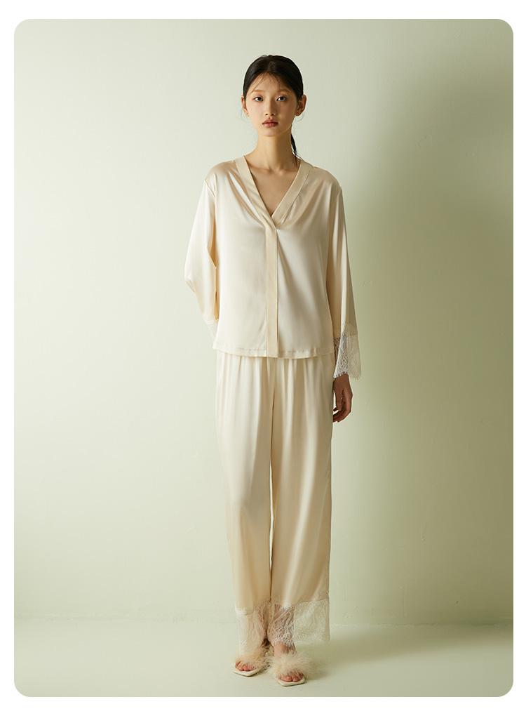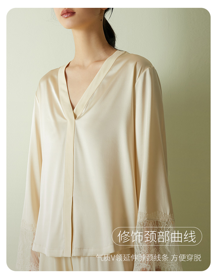 【新品】桑罗蕾丝拼接真丝睡衣套装女V领套头宽松显瘦舒适家居服春夏款