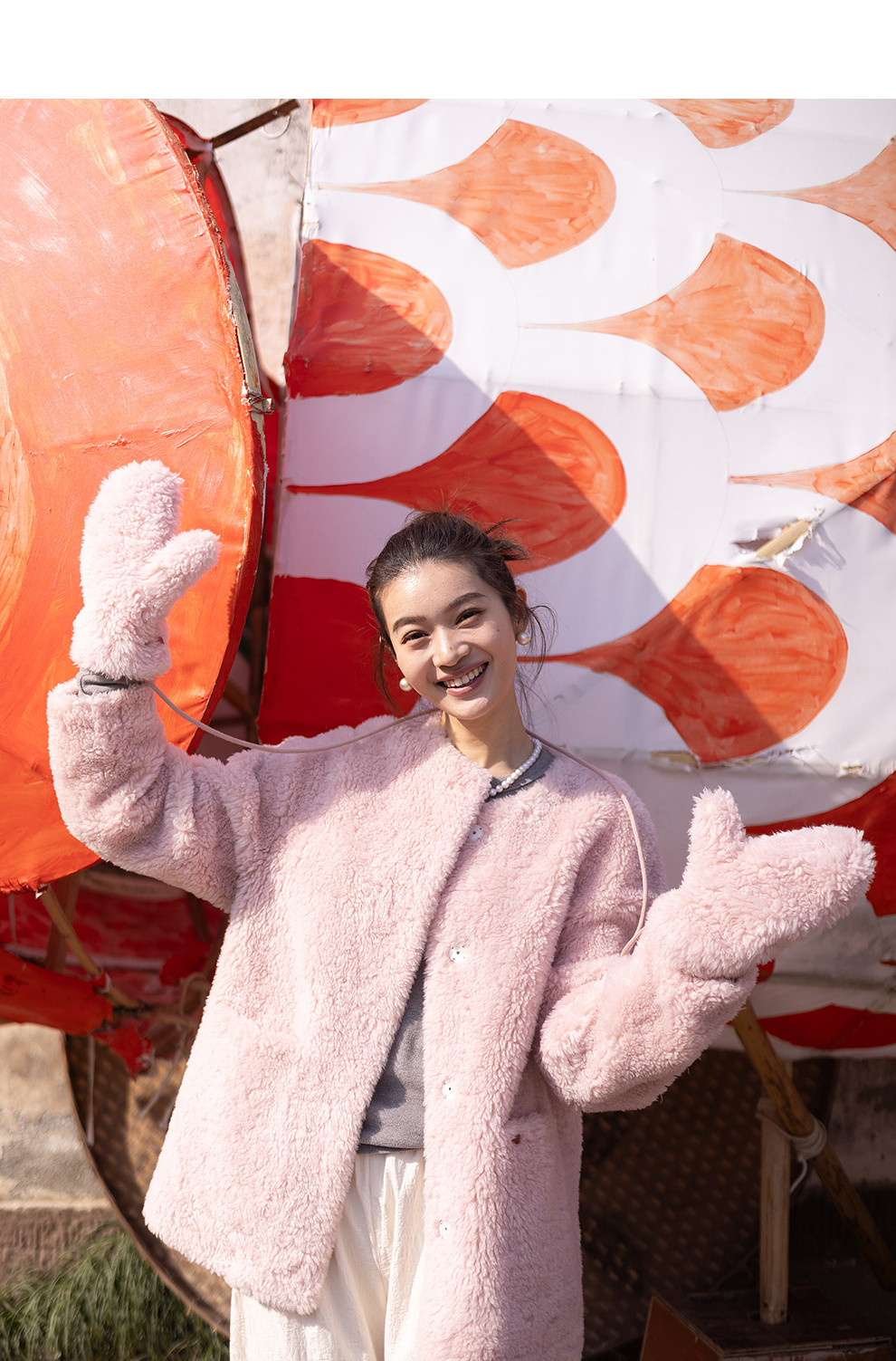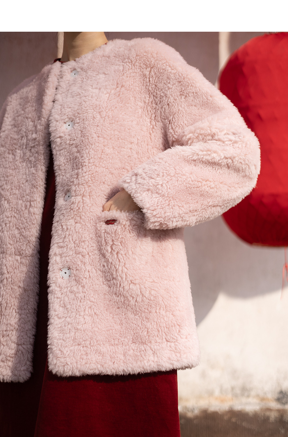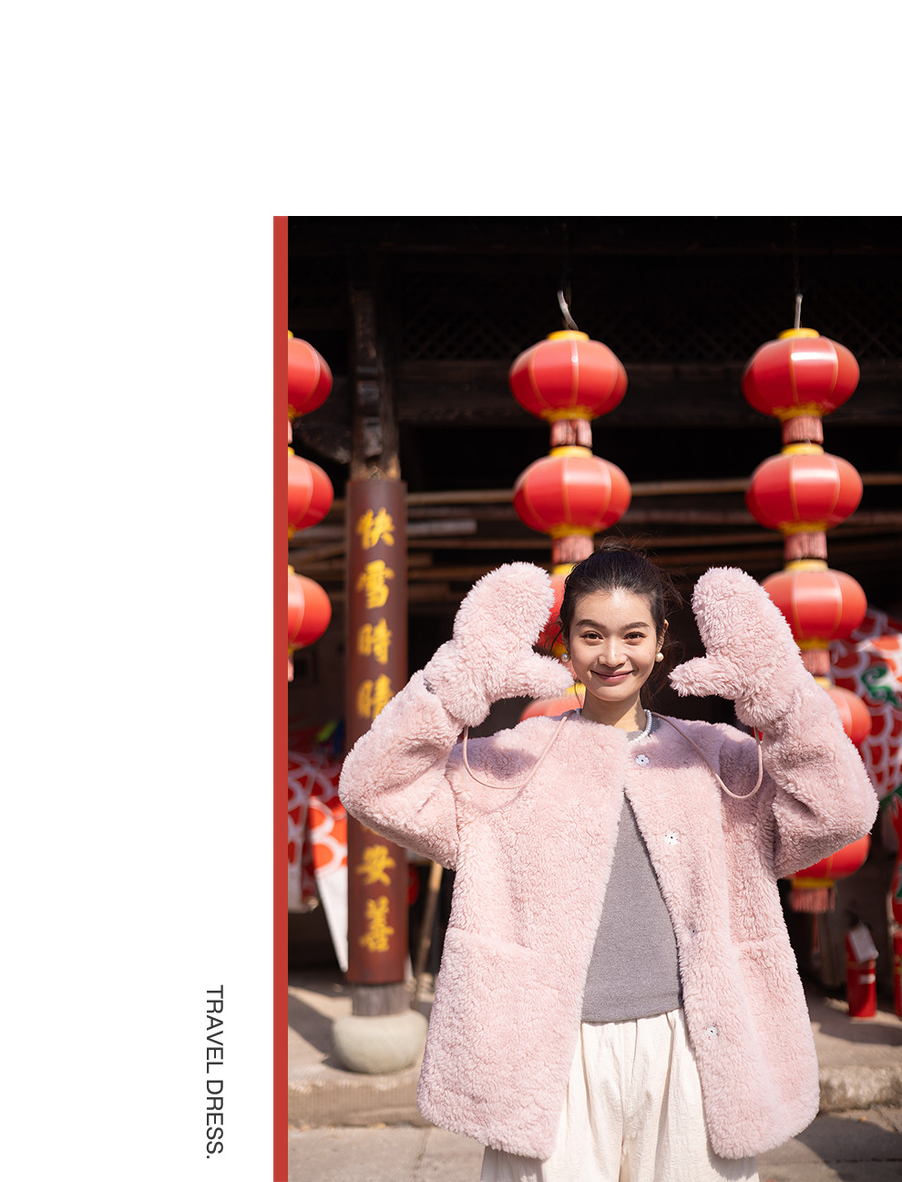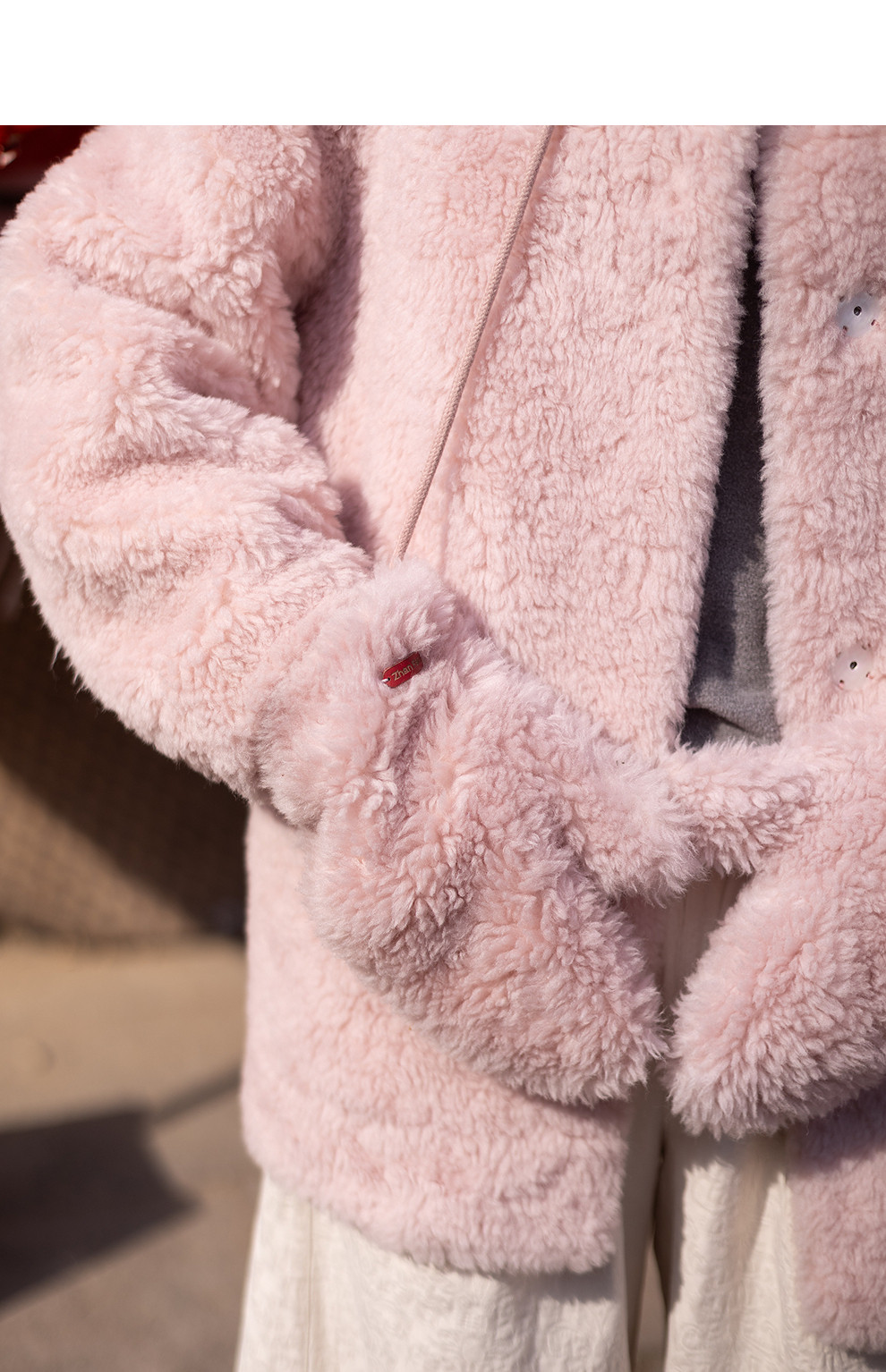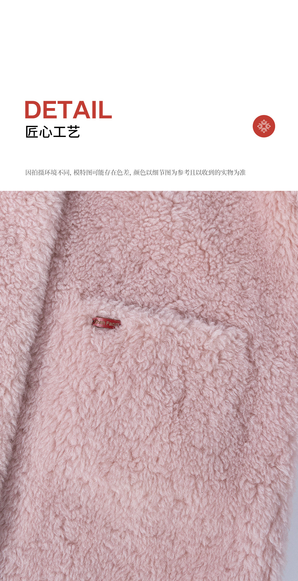绽放024朵/羊羔毛圆领带手套一手长外套保暖宽松纯羊毛厚外套新款