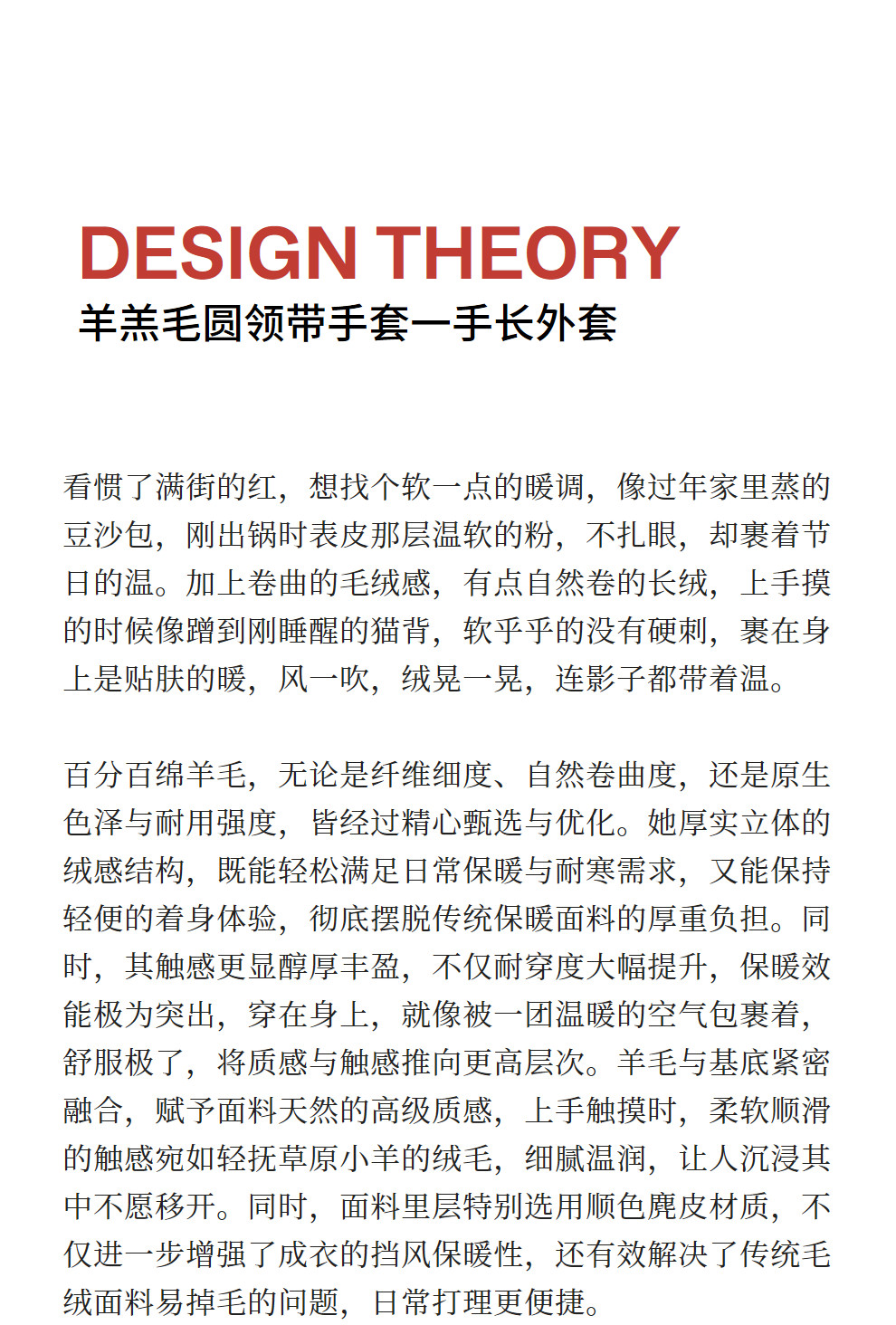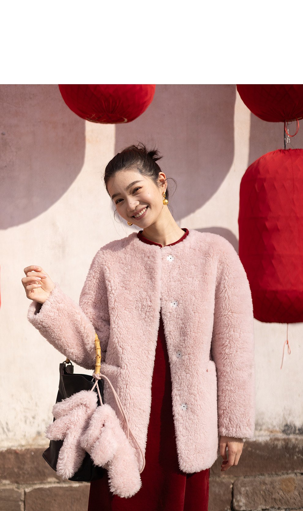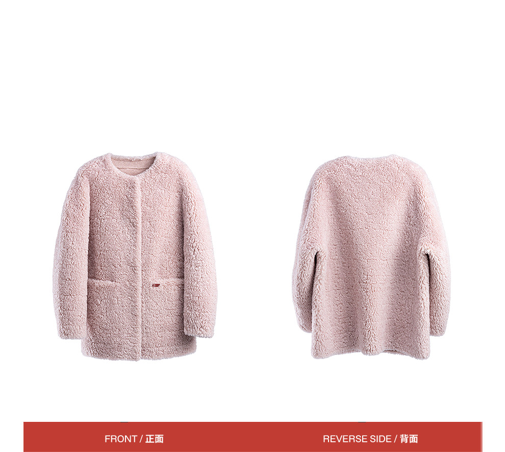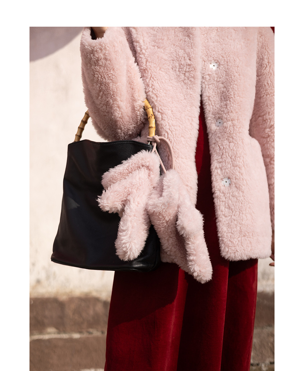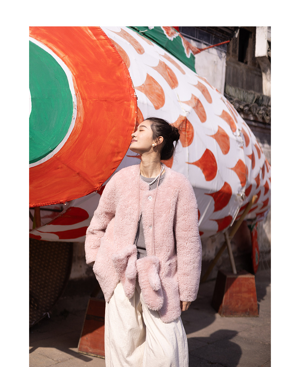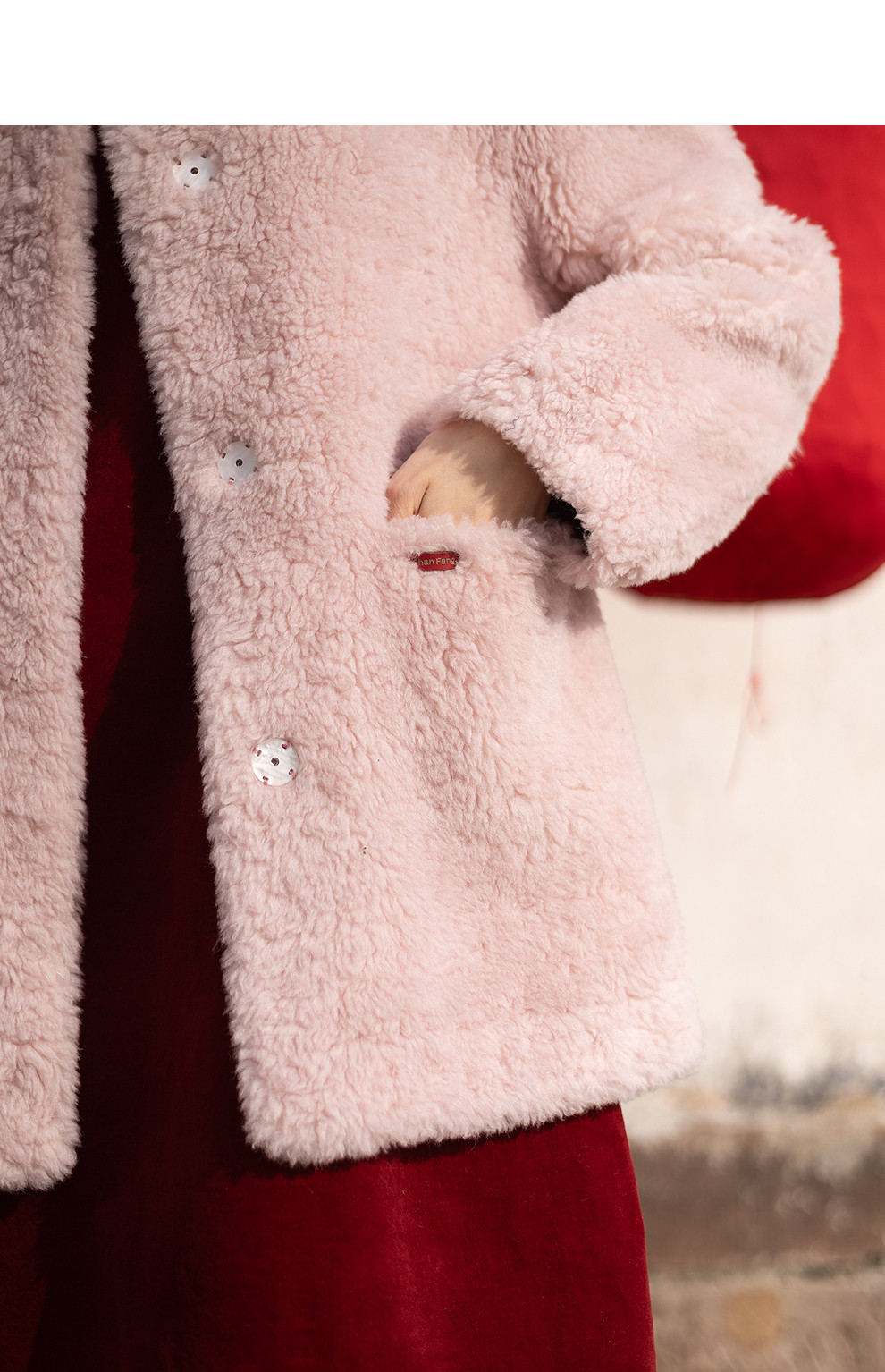 绽放024朵/羊羔毛圆领带手套一手长外套保暖宽松纯羊毛厚外套新款