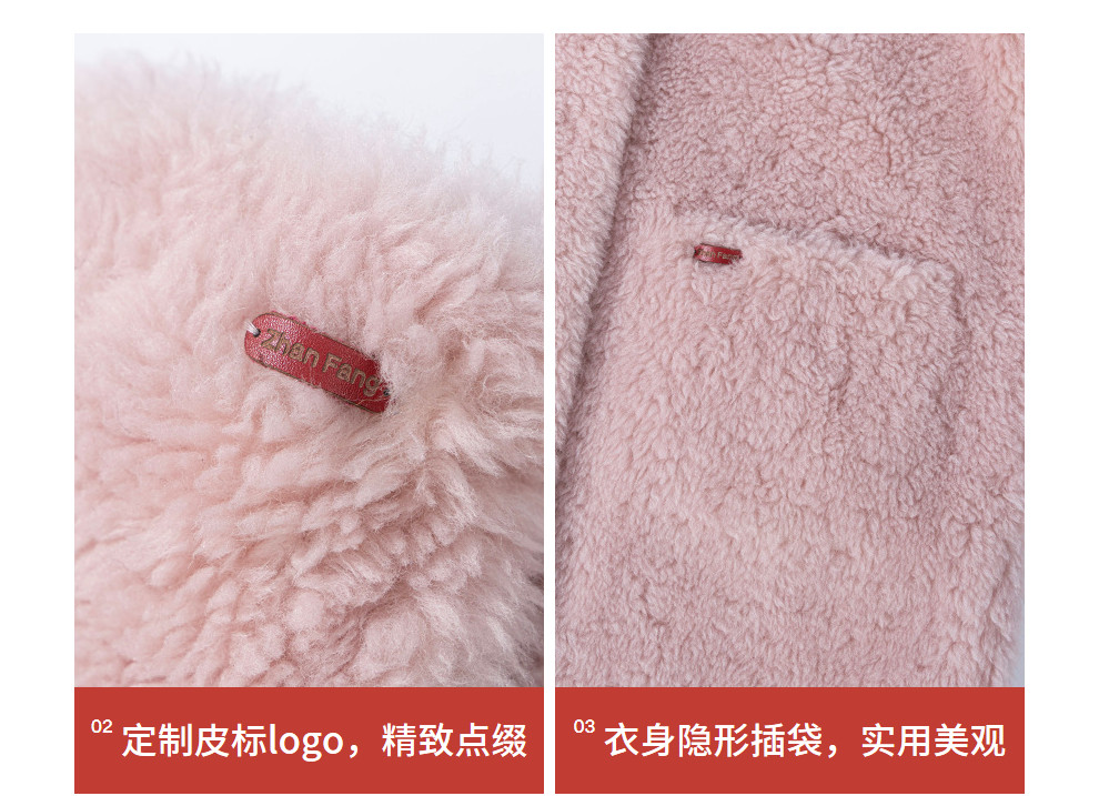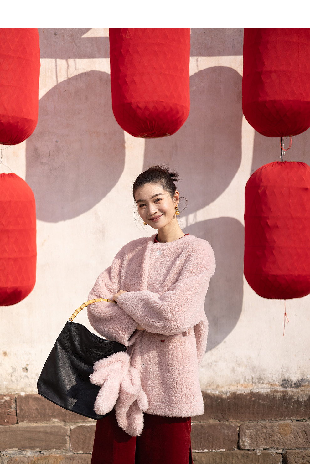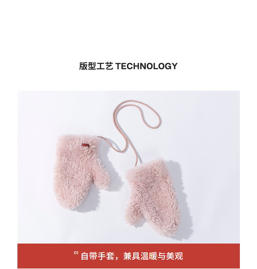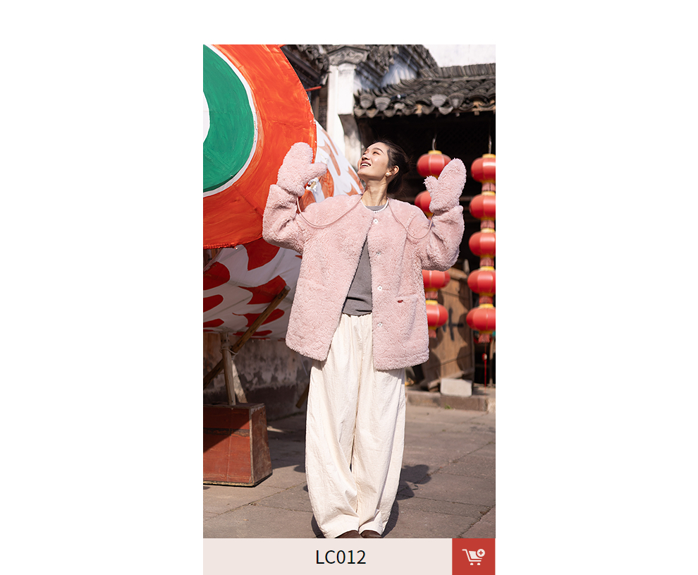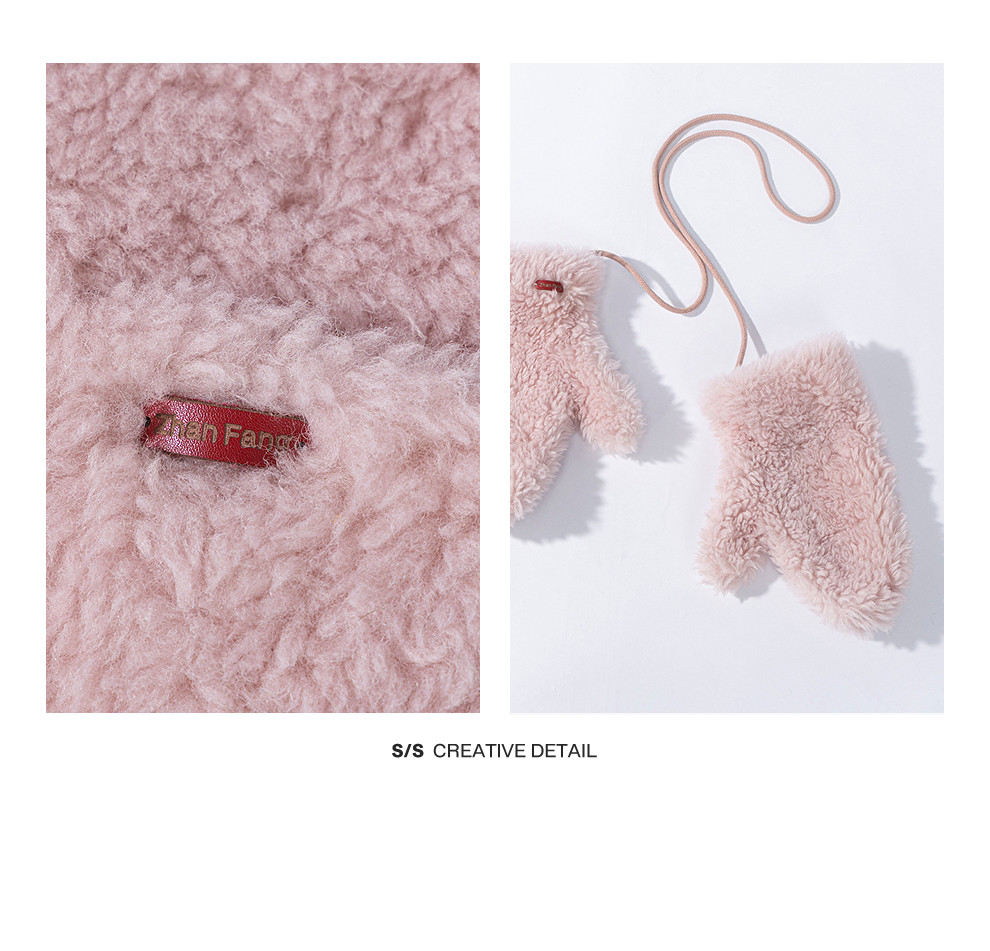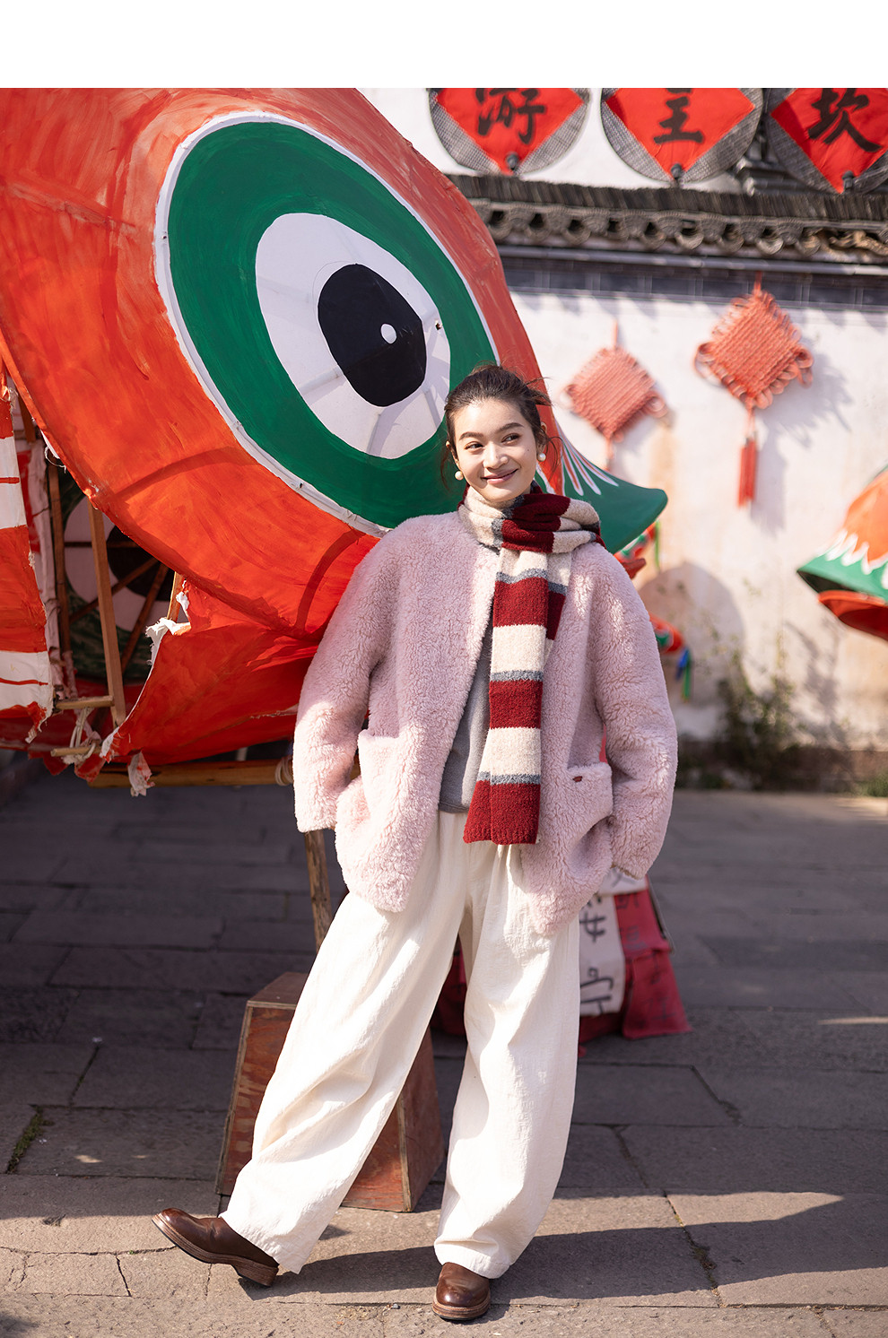 绽放024朵/羊羔毛圆领带手套一手长外套保暖宽松纯羊毛厚外套新款
