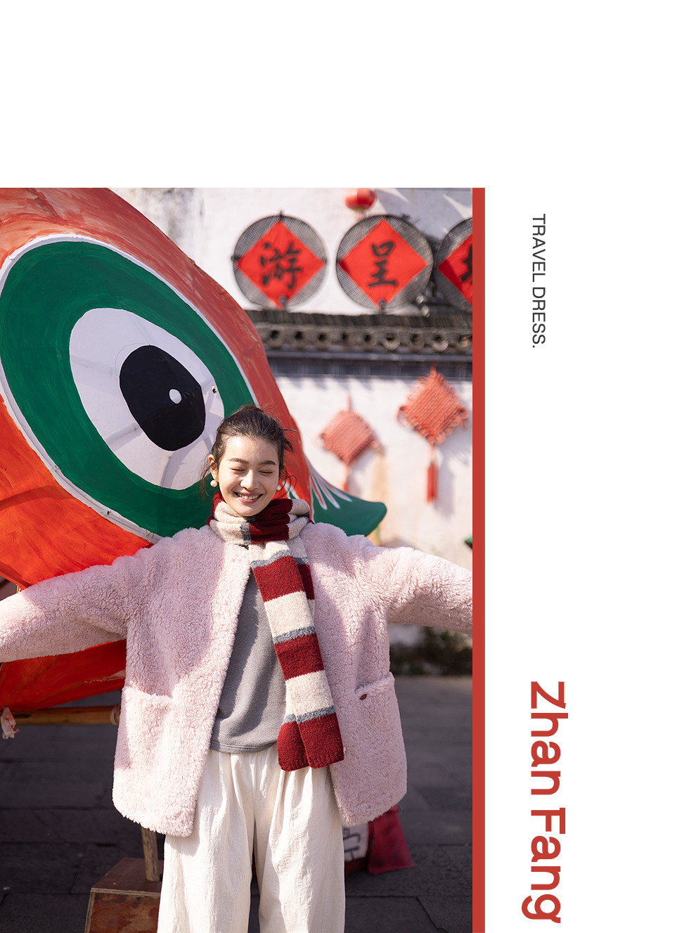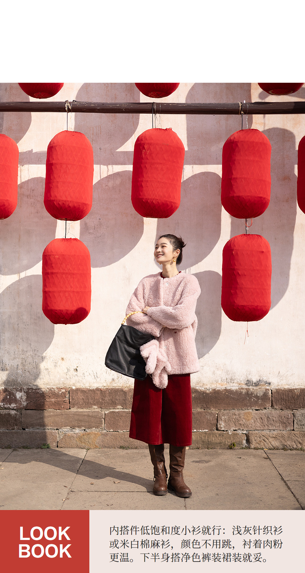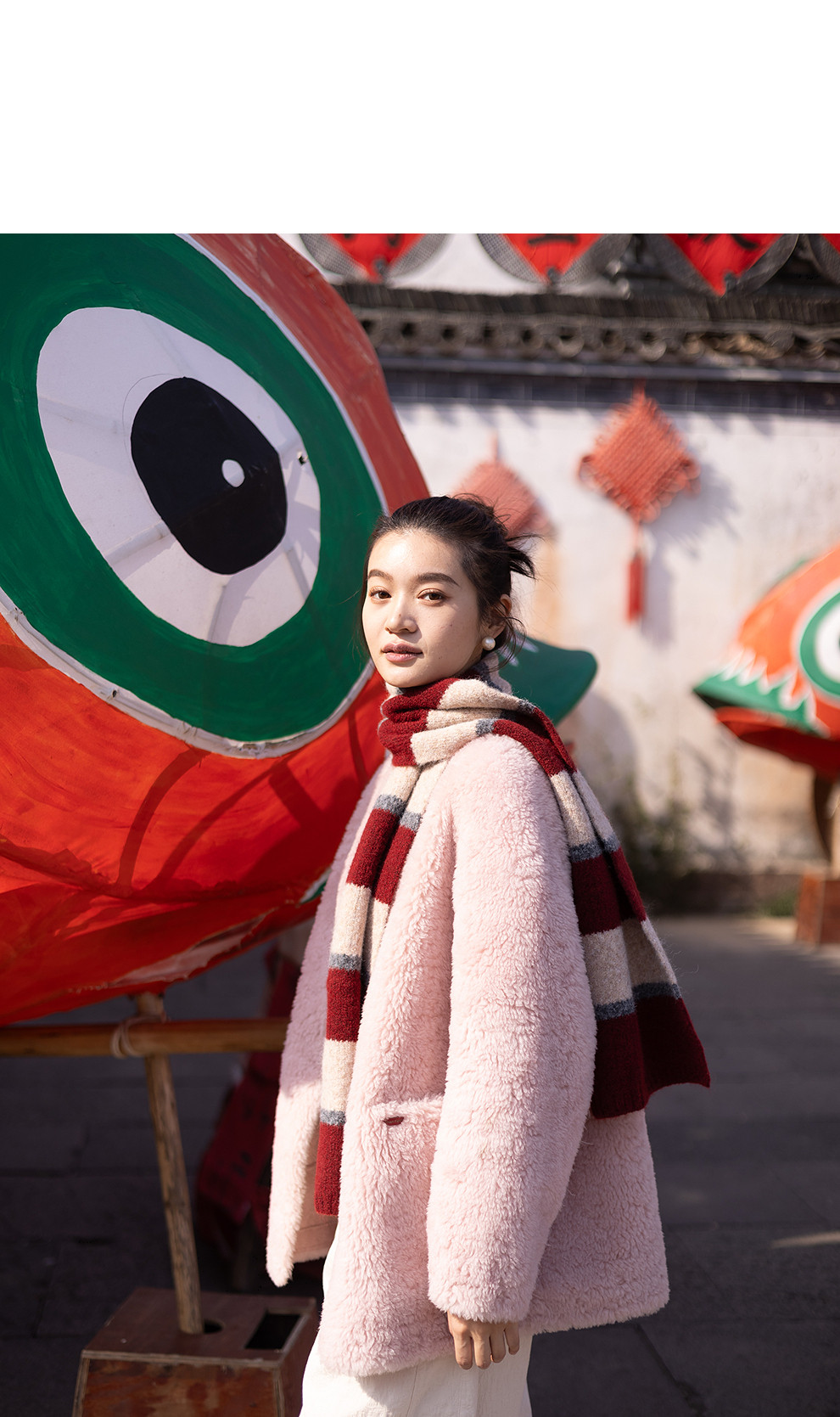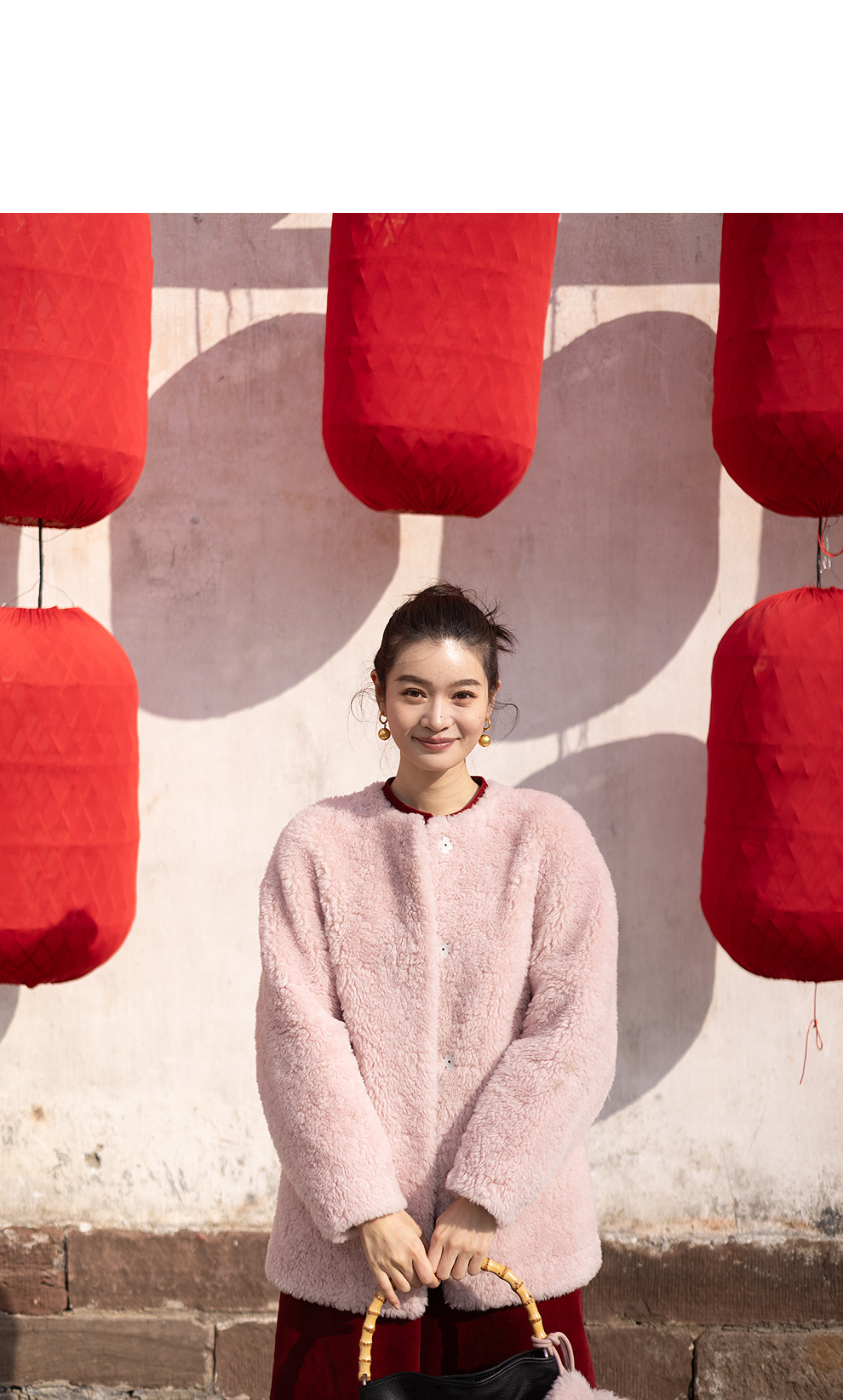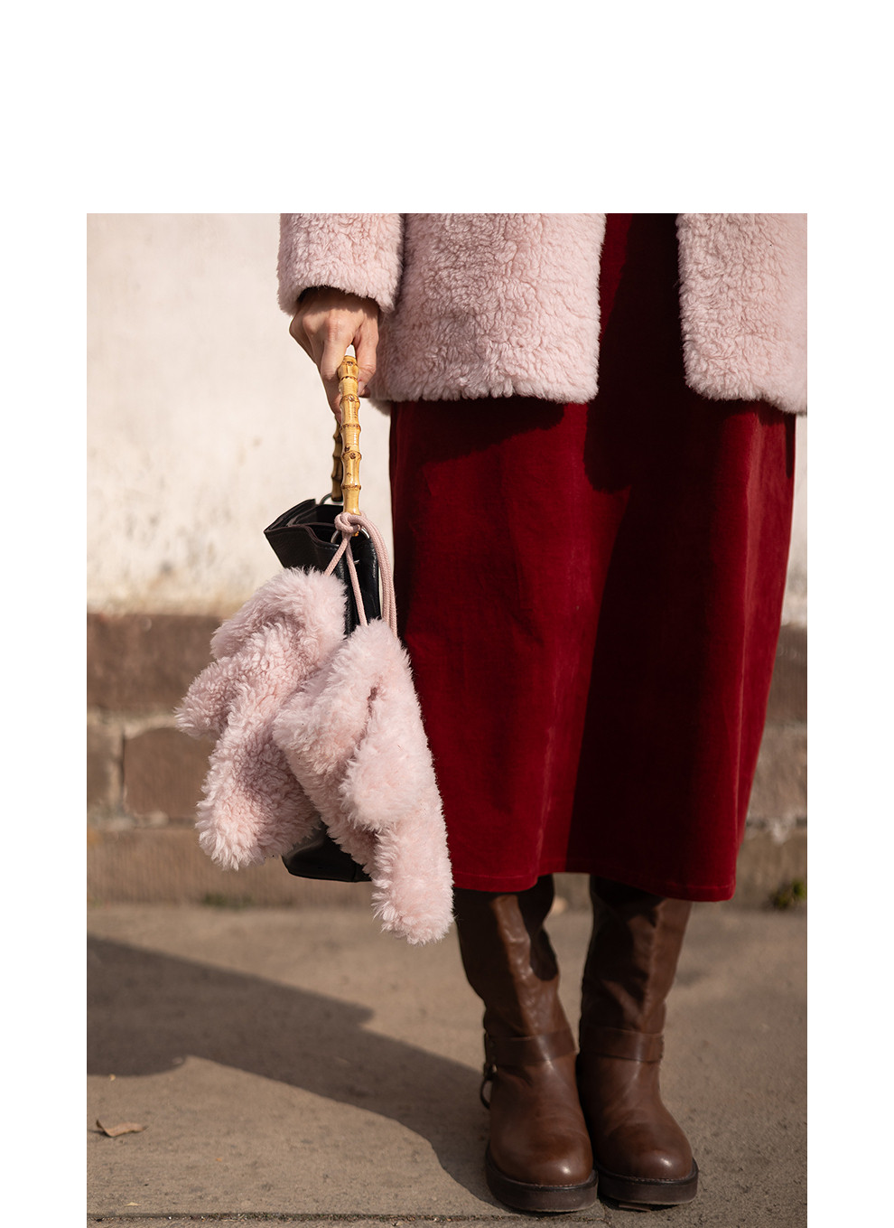 绽放024朵/羊羔毛圆领带手套一手长外套保暖宽松纯羊毛厚外套新款
