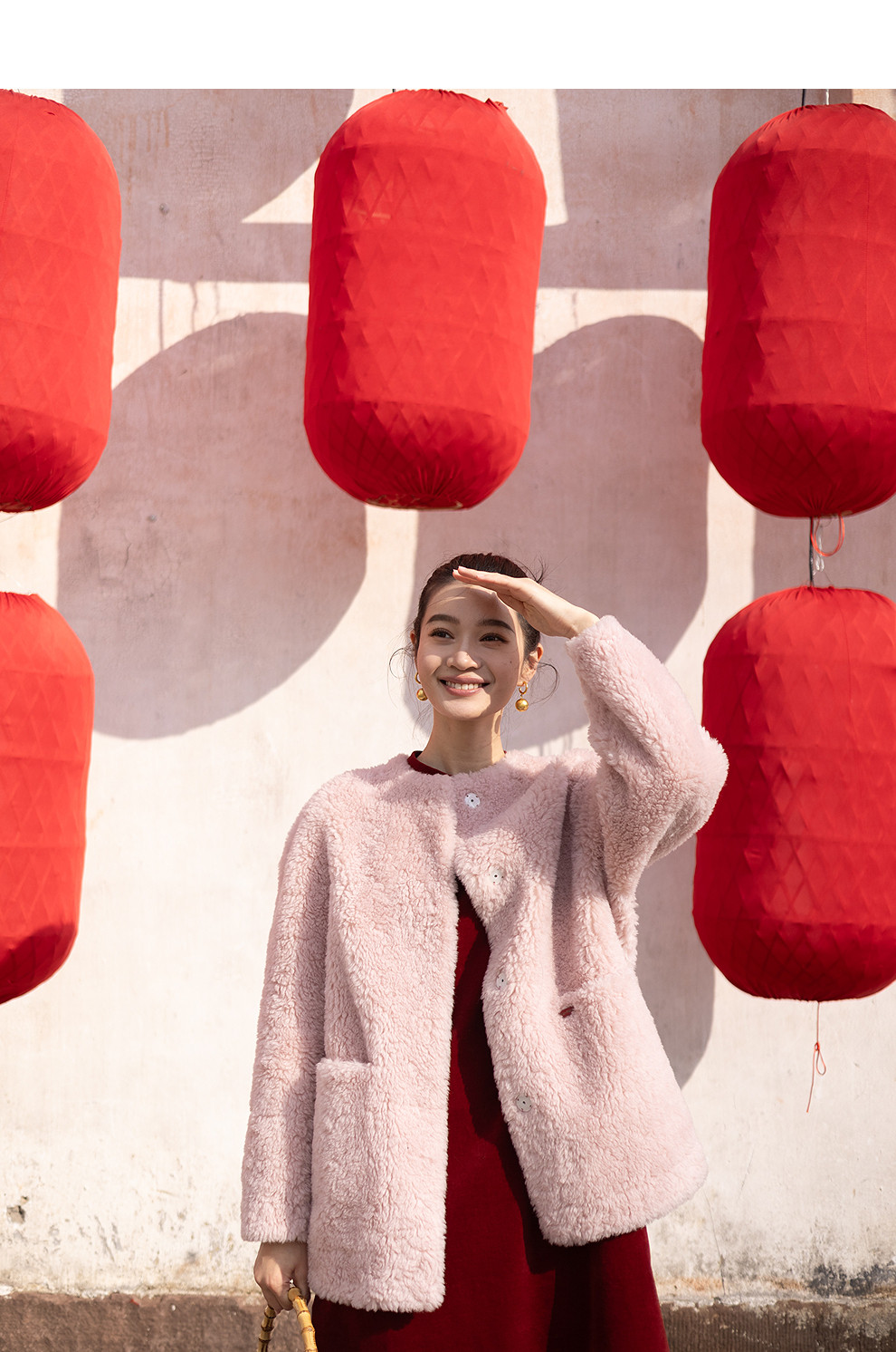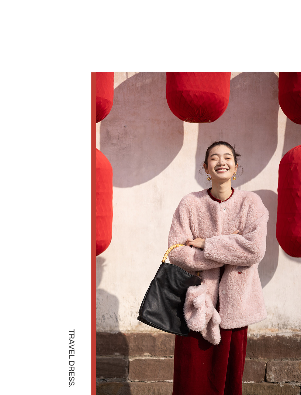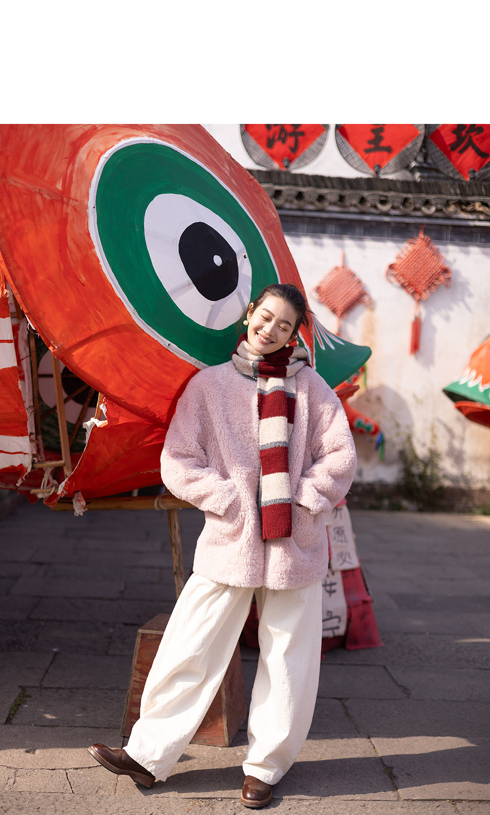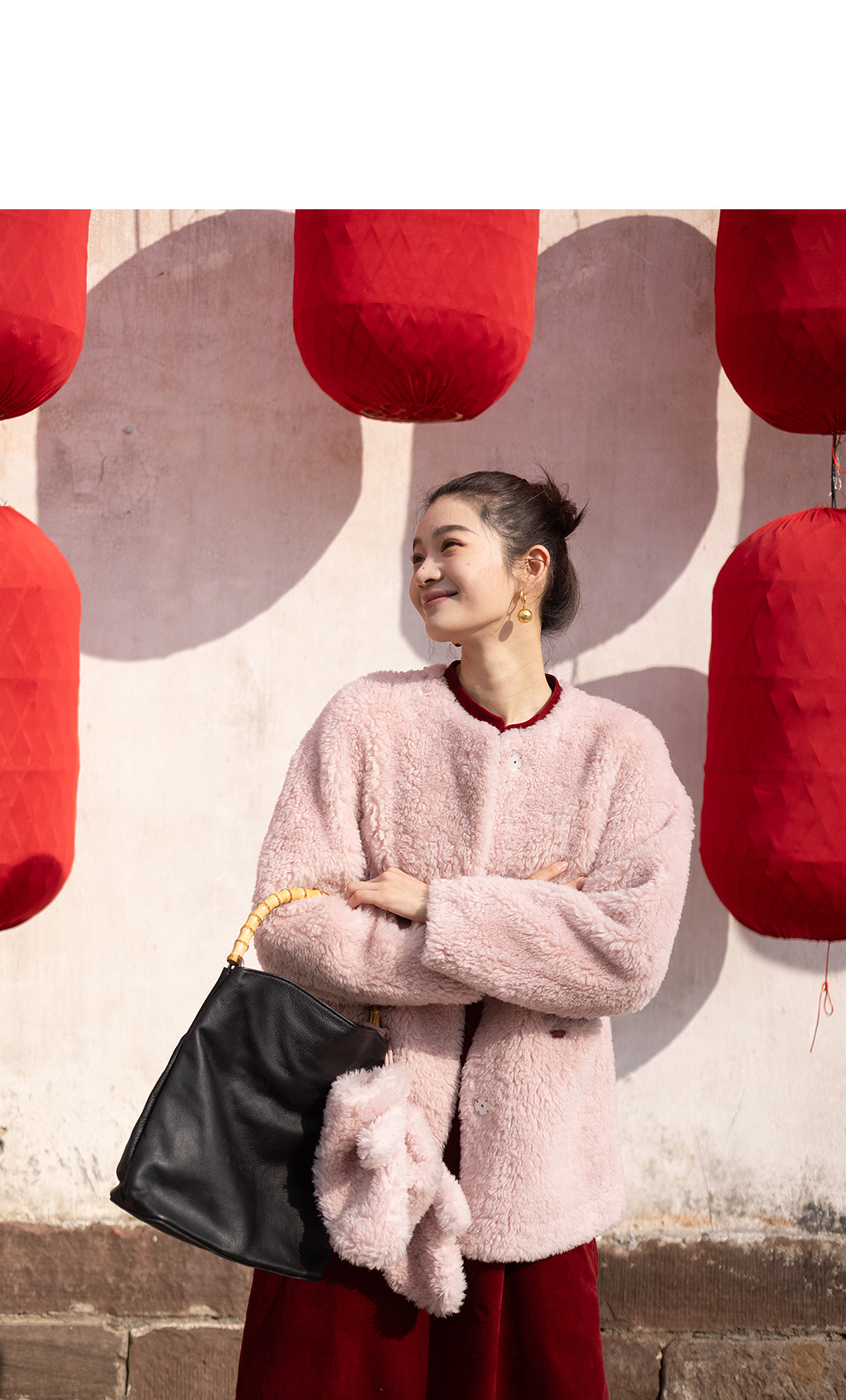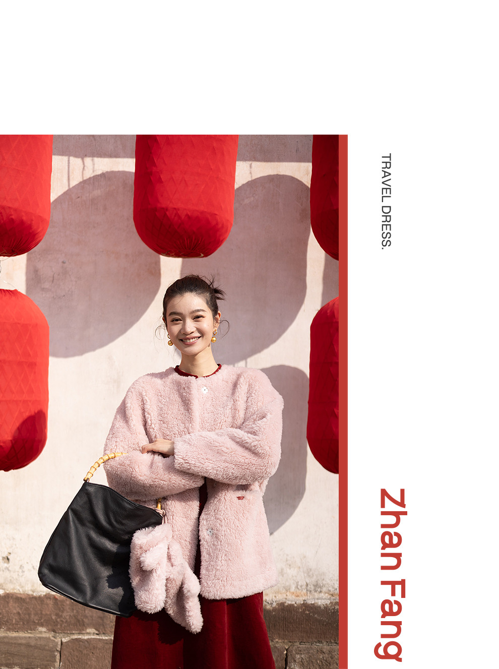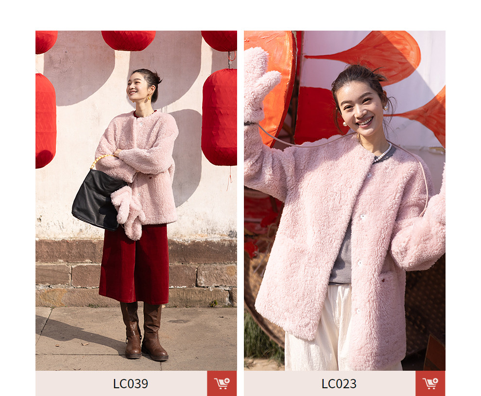 绽放024朵/羊羔毛圆领带手套一手长外套保暖宽松纯羊毛厚外套新款