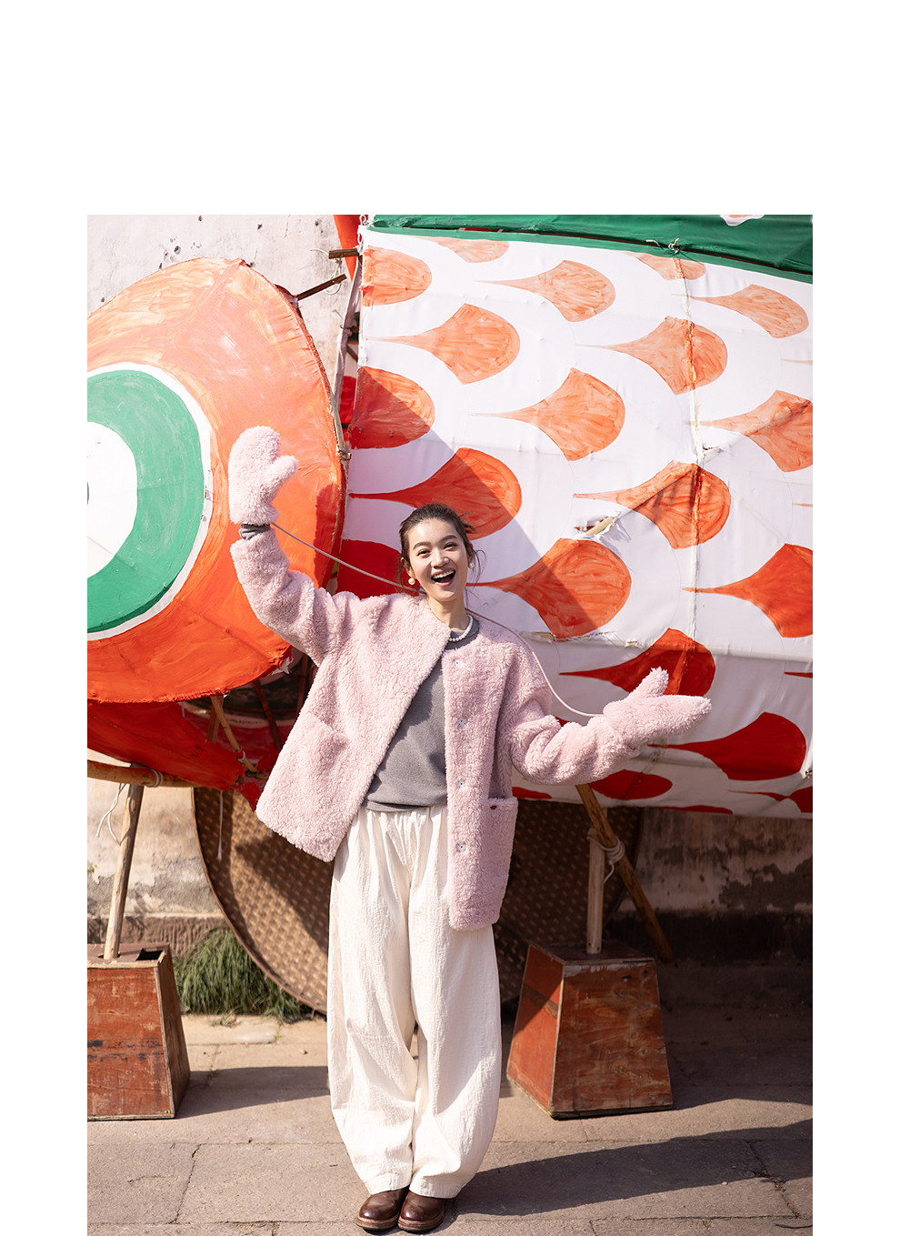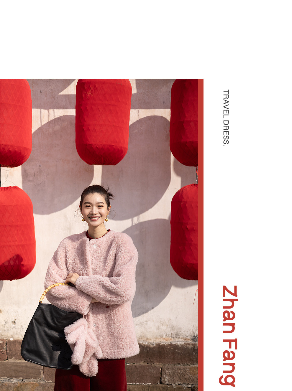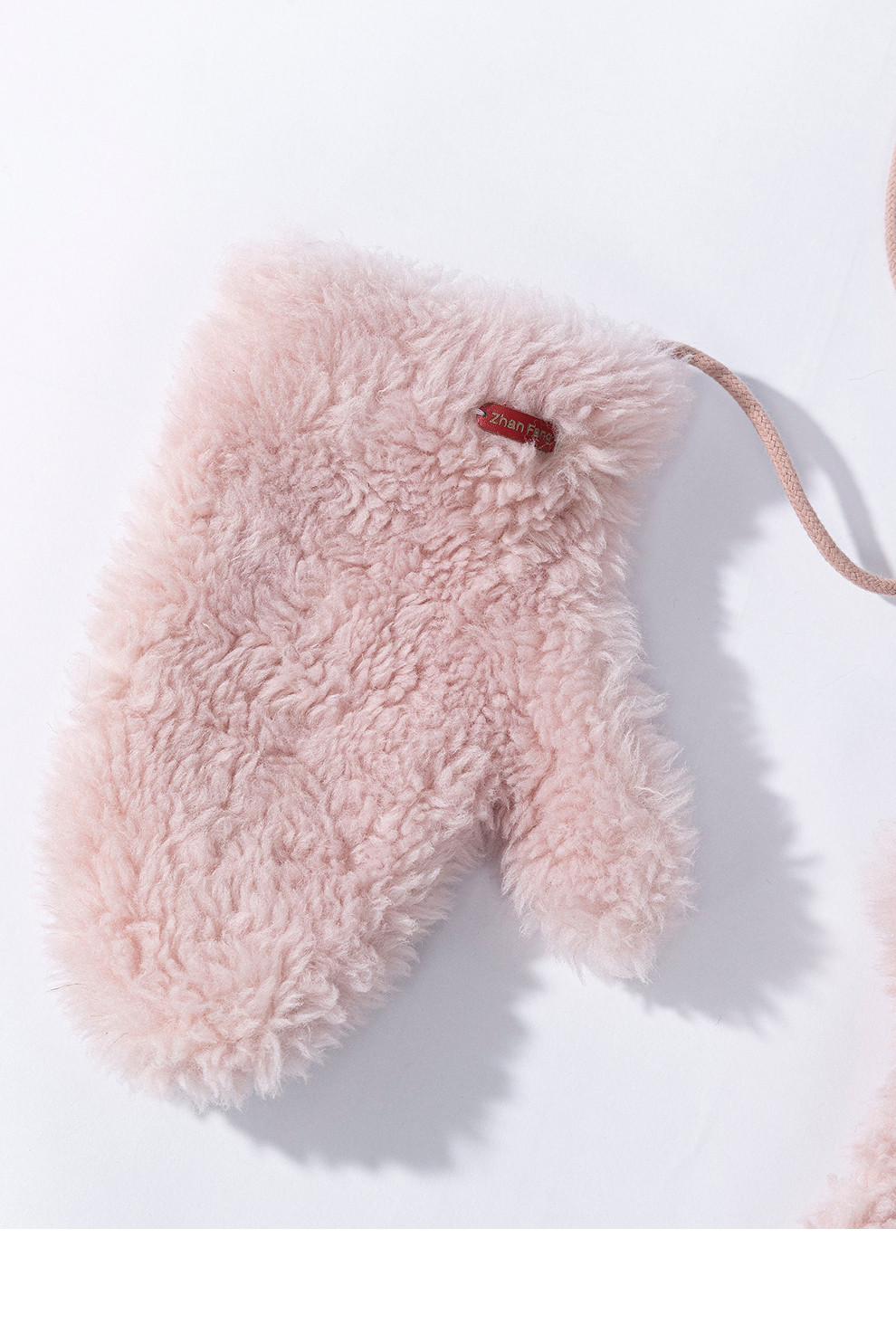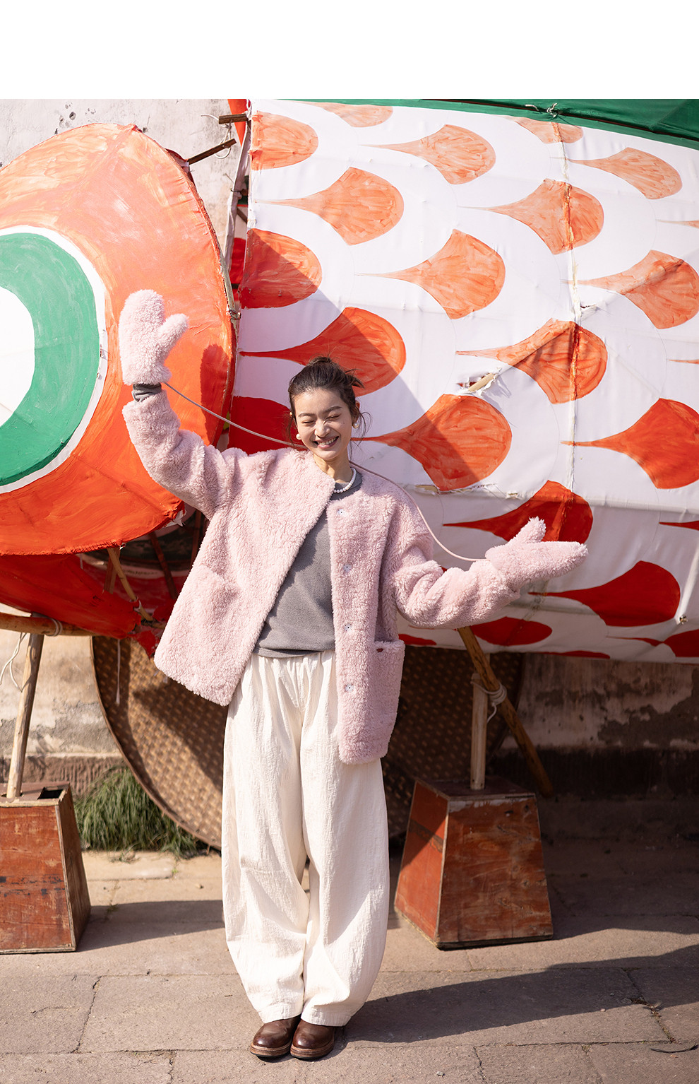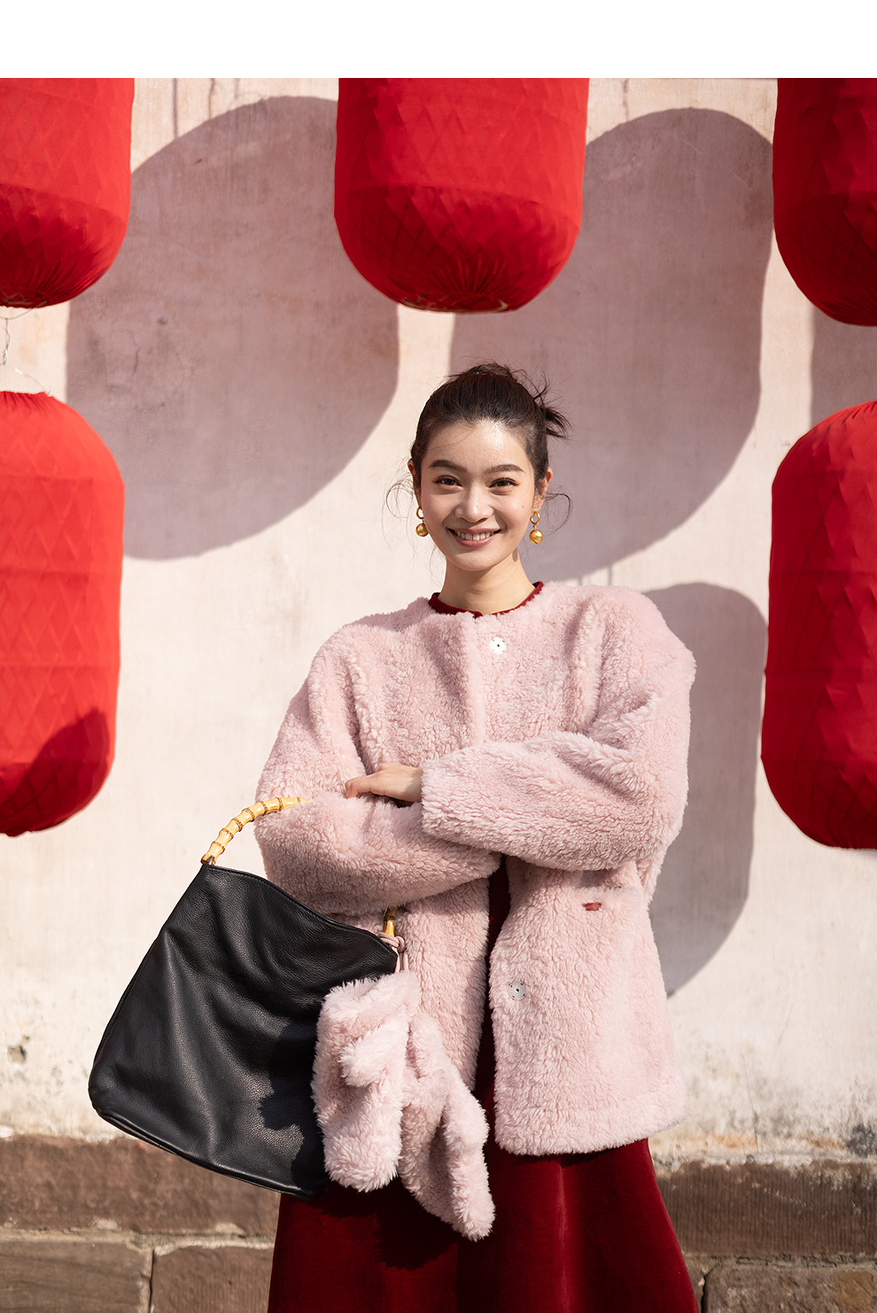 绽放024朵/羊羔毛圆领带手套一手长外套保暖宽松纯羊毛厚外套新款