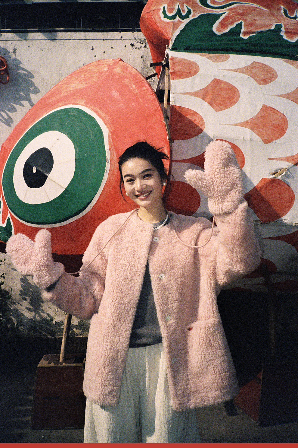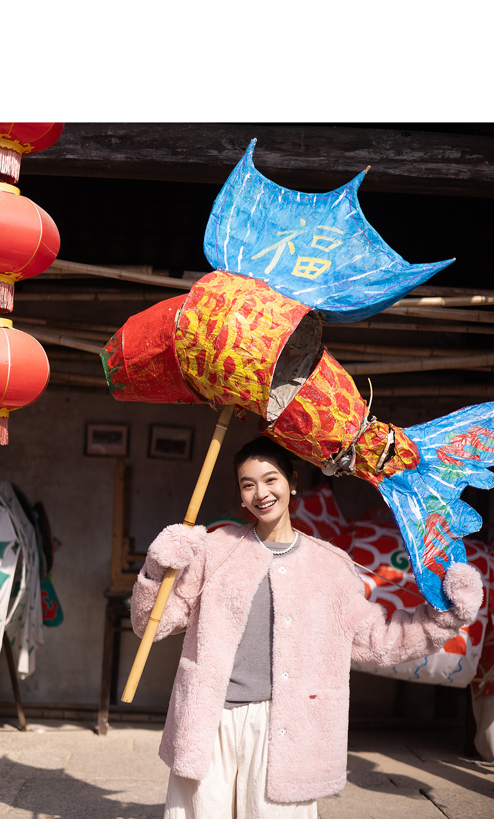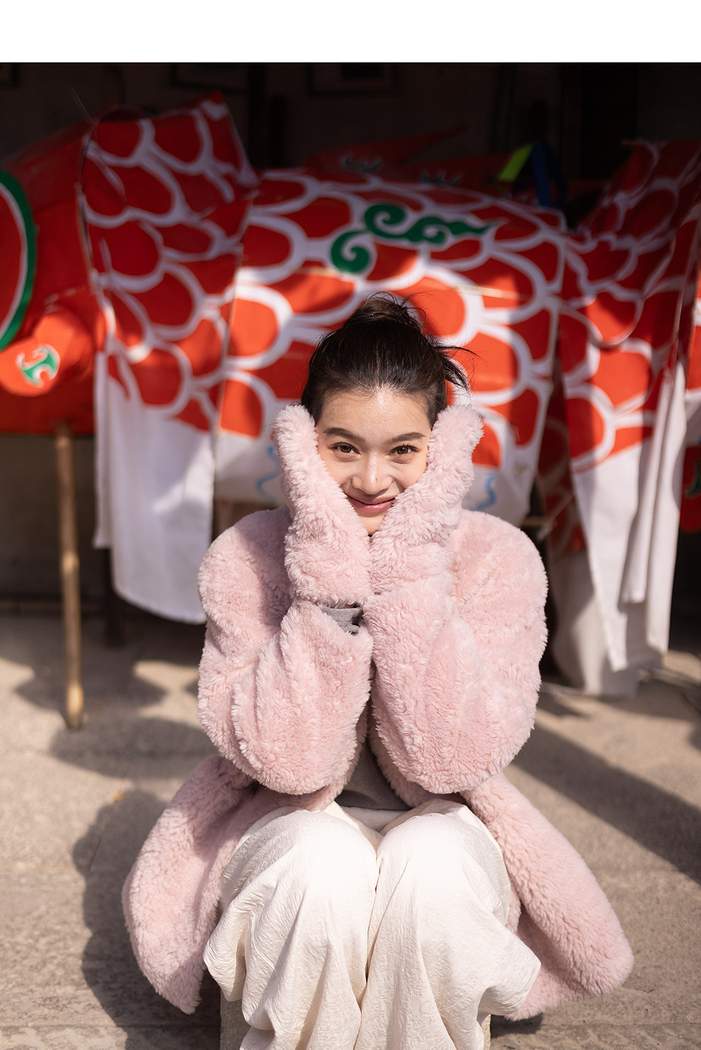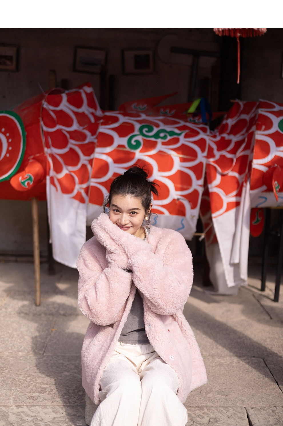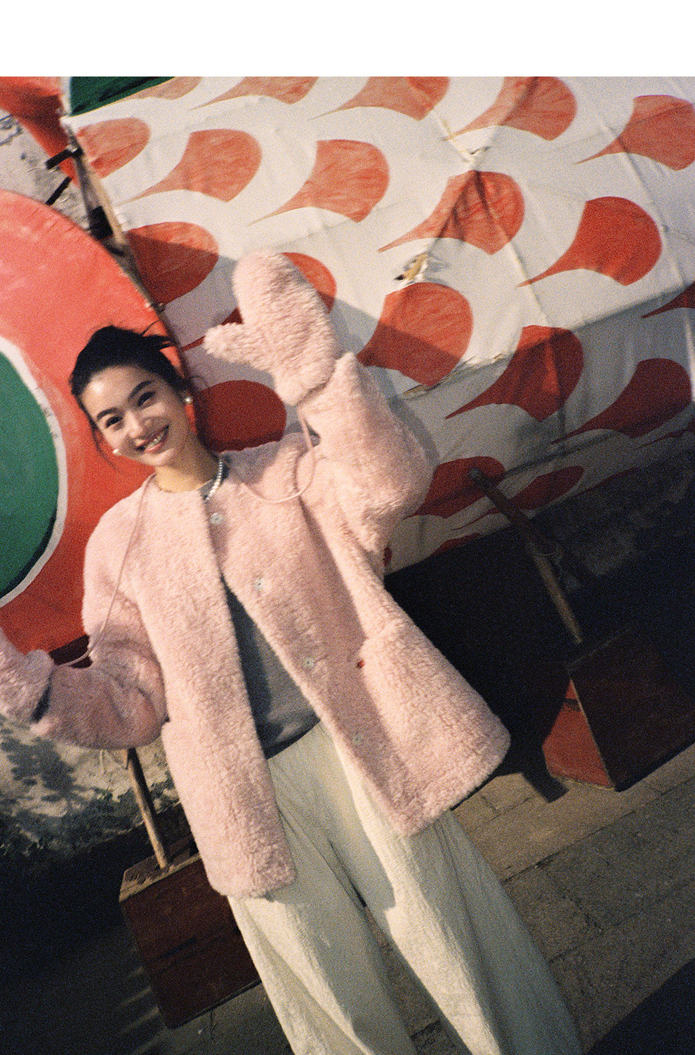 绽放024朵/羊羔毛圆领带手套一手长外套保暖宽松纯羊毛厚外套新款
