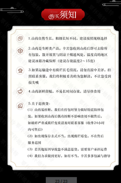 5、如收货后即时拆箱,发现断损、霉变、冻伤严重无法食用需退货退款时,即时拍照群内反馈、需原单退回,运费客户自行承担,提供退货单号即退款,如客户自行丢弃损坏山药无法按要求提供照片不予处理。请谅解!
