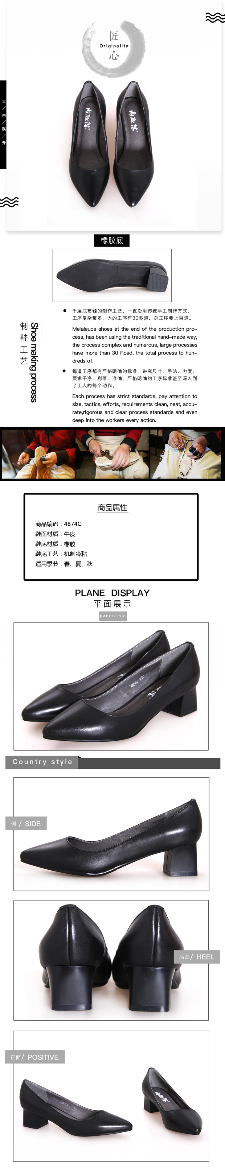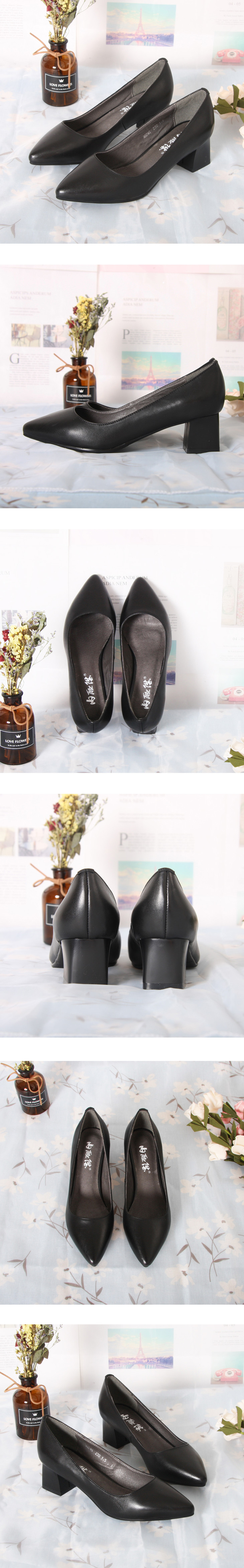 内联升女鞋皮鞋低帮春秋牛皮正装职业女式中跟尖头职业鞋4874C