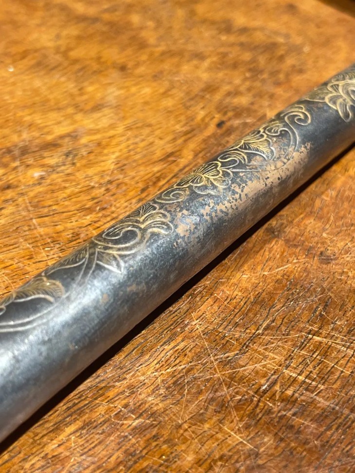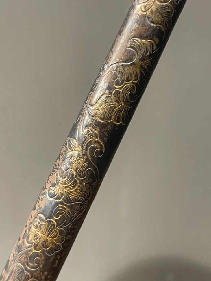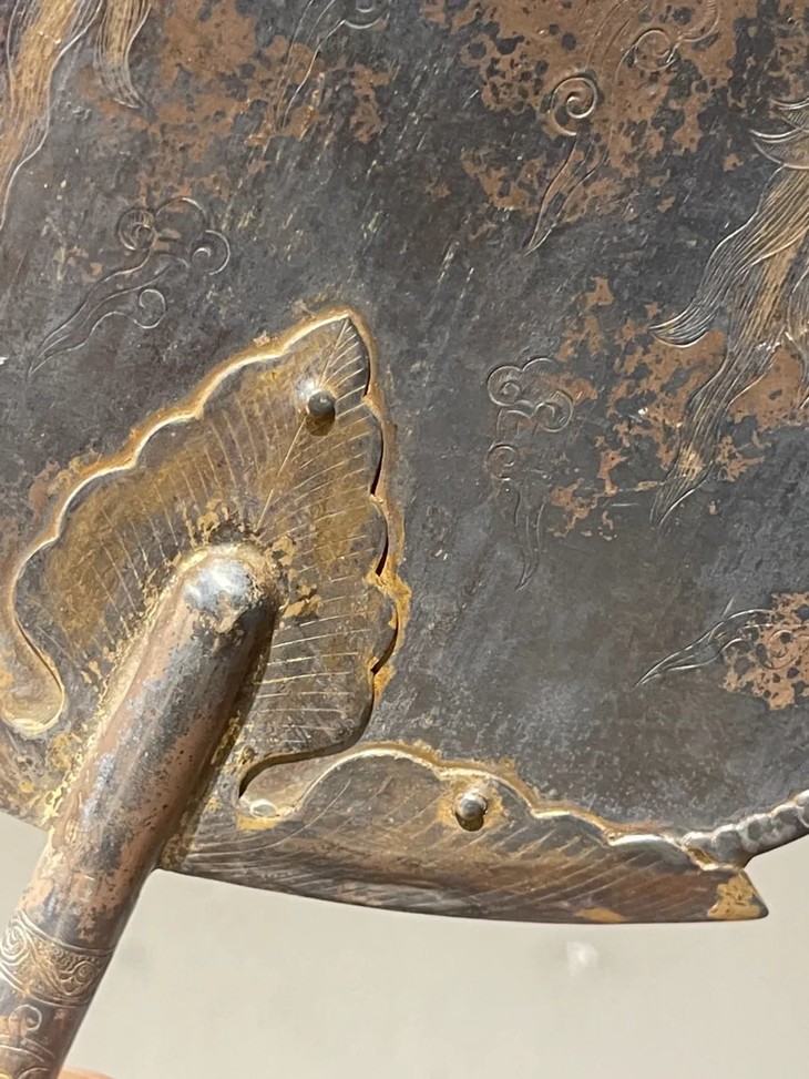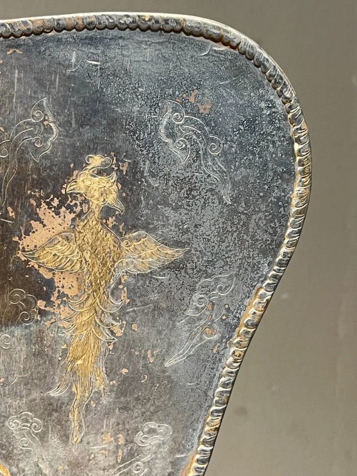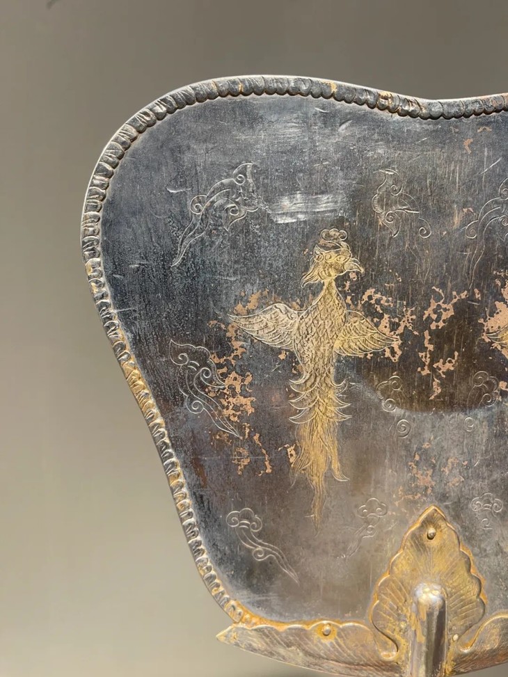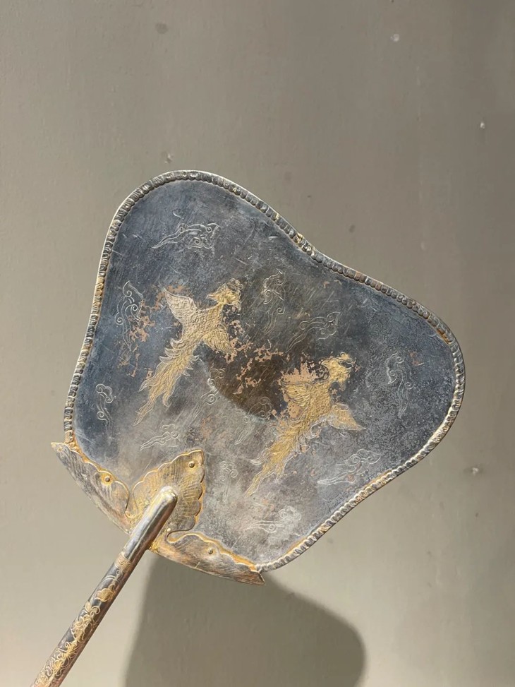 此鎏金银如意云凤鸟纹长柄扇,如图所示,表面鎏银局部脱落斑驳,表面细微磨损刮痕外基本完好。