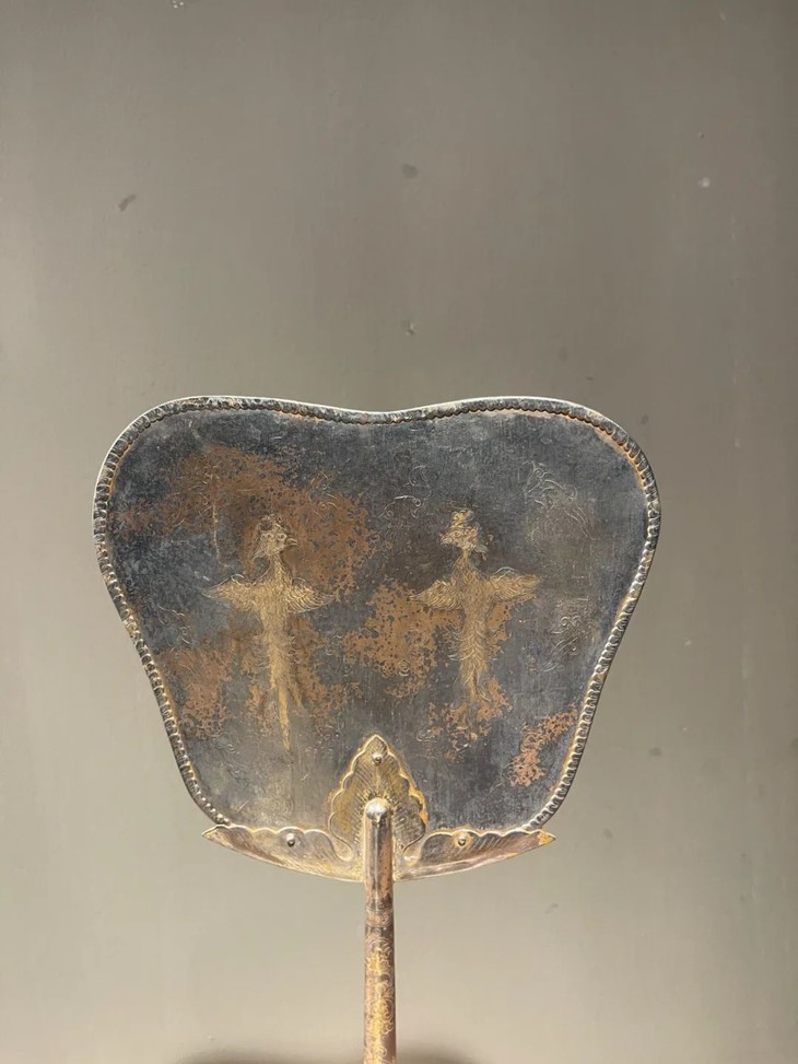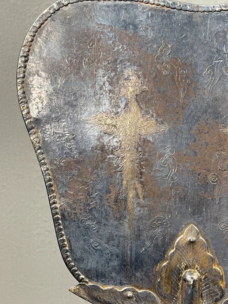 这是一件以银合金精心打造而成的仿唐代风格长柄扇,扇身蒲叶型搭配圆筒长柄与羽毛型扇面扣夹,扇身双面錾刻如意云纹间两只垂直往上飞的凤鸟,凤鸟局部鎏金点缀,环绕长柄錾刻唐草纹,羽毛型扣夹局部鎏金点缀,取材精良,鎏金鎏银雍容华丽、型式典雅、工艺精湛,整体贵气十足,是仿唐代金银器经典风格。