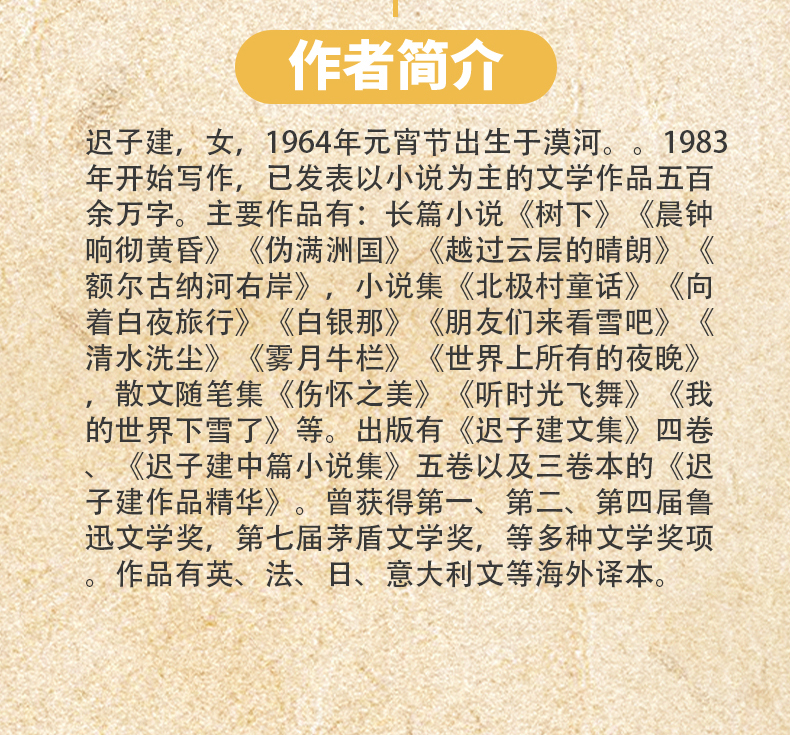 迟子建,女,1964年元宵节出生于漠河。。1983年开始写作,已发表以小说为主的文学作品五百余万字。主要作品有:长篇小说《树下》《晨钟响彻黄昏》《伪满洲国》《越过云层的晴朗》《额尔古纳河右岸》,小说集《北极村童话》《向着白夜旅行》《白银那》《朋友们来看雪吧》《清水洗尘》《雾月牛栏》《世界上所有的夜晚》,散文随笔集《伤怀之美》《听时光飞舞》《我的世界下雪了》等。出版有《迟子建文集》四卷、《迟子建中篇小说集》五卷以及三卷本的《迟子建作品精华》。曾获得第一、第二、第四届鲁迅文学奖,第七届茅盾文学奖,等多种文学奖项。作品有英、法、日、意大利文等海外译本。