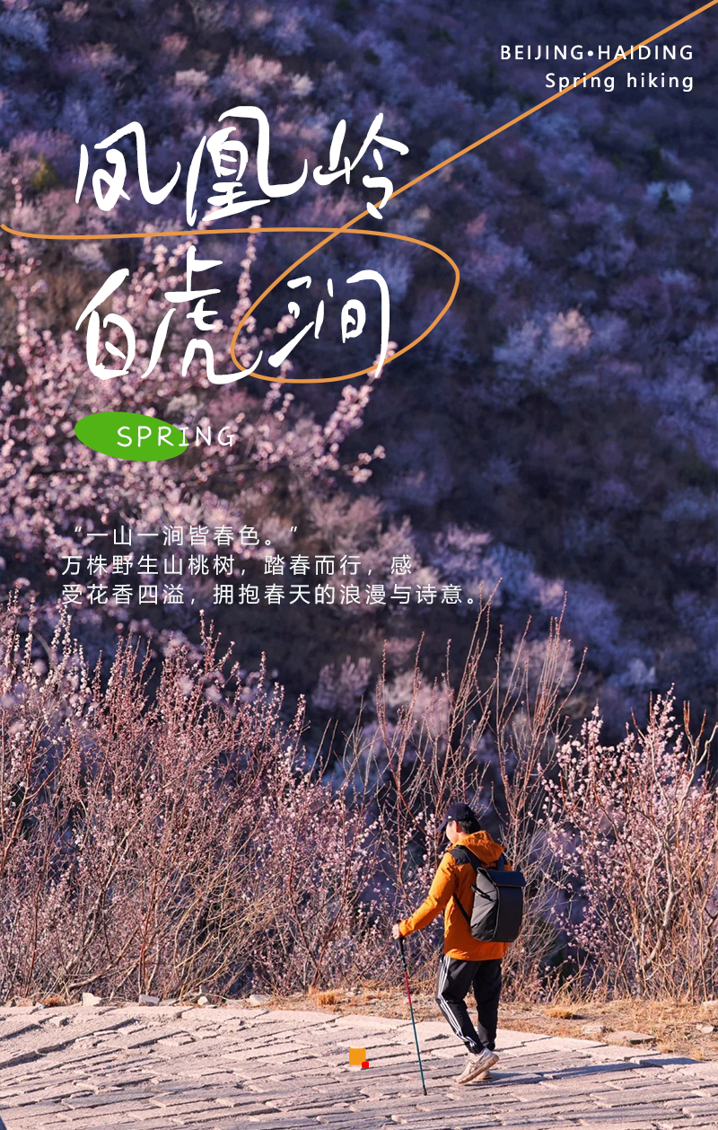 每年三月中旬到四月,是凤凰岭 - 白虎涧徒步穿越赏桃花的好时节。凤凰岭近万株山桃树,届时漫山遍野的桃花将这里变成粉红色海洋。从凤凰岭天梯爬上后,便如入仙境。穿越到白虎涧,野生桃花依山而上,开得肆意绚烂。尤其是白虎涧的火焰山,登上山顶,花海尽收眼底。粉嫩嫩的花朵与奇峰怪石、湛蓝天空相互映衬,构成了京郊最美的桃林春景画卷。