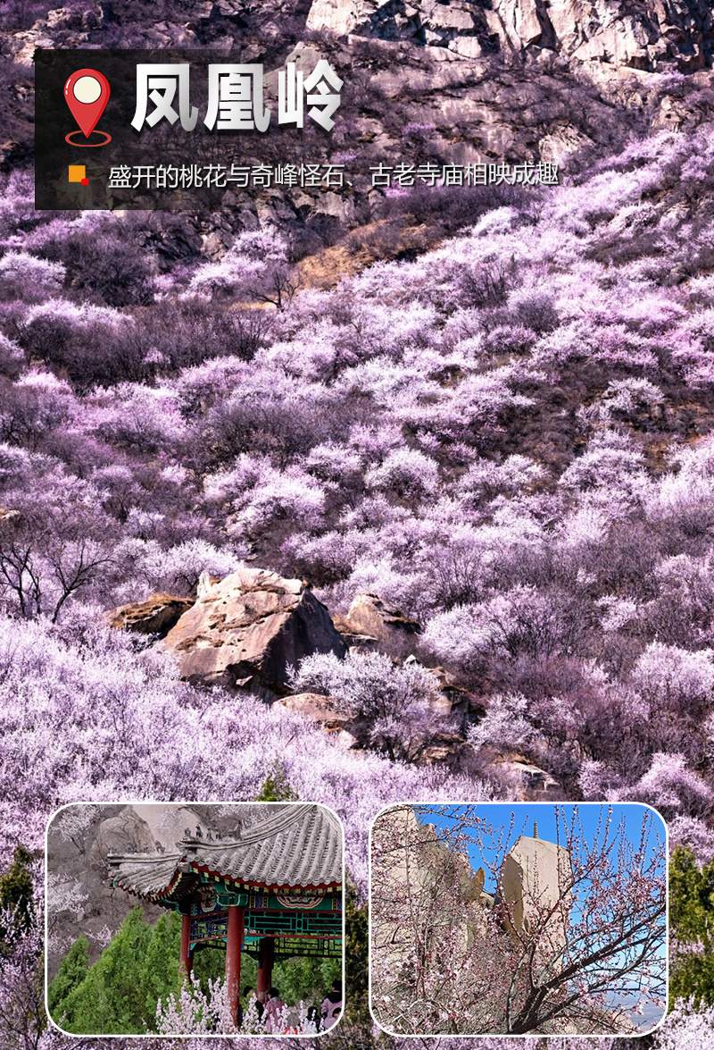 凤凰岭有 “神岭千峰” 等著名景观,还有 1400 年的古寺、道观遗址。盛开的桃花与奇峰怪石、古老寺庙相互映衬,形成了独特的景观,古韵与春景交融。