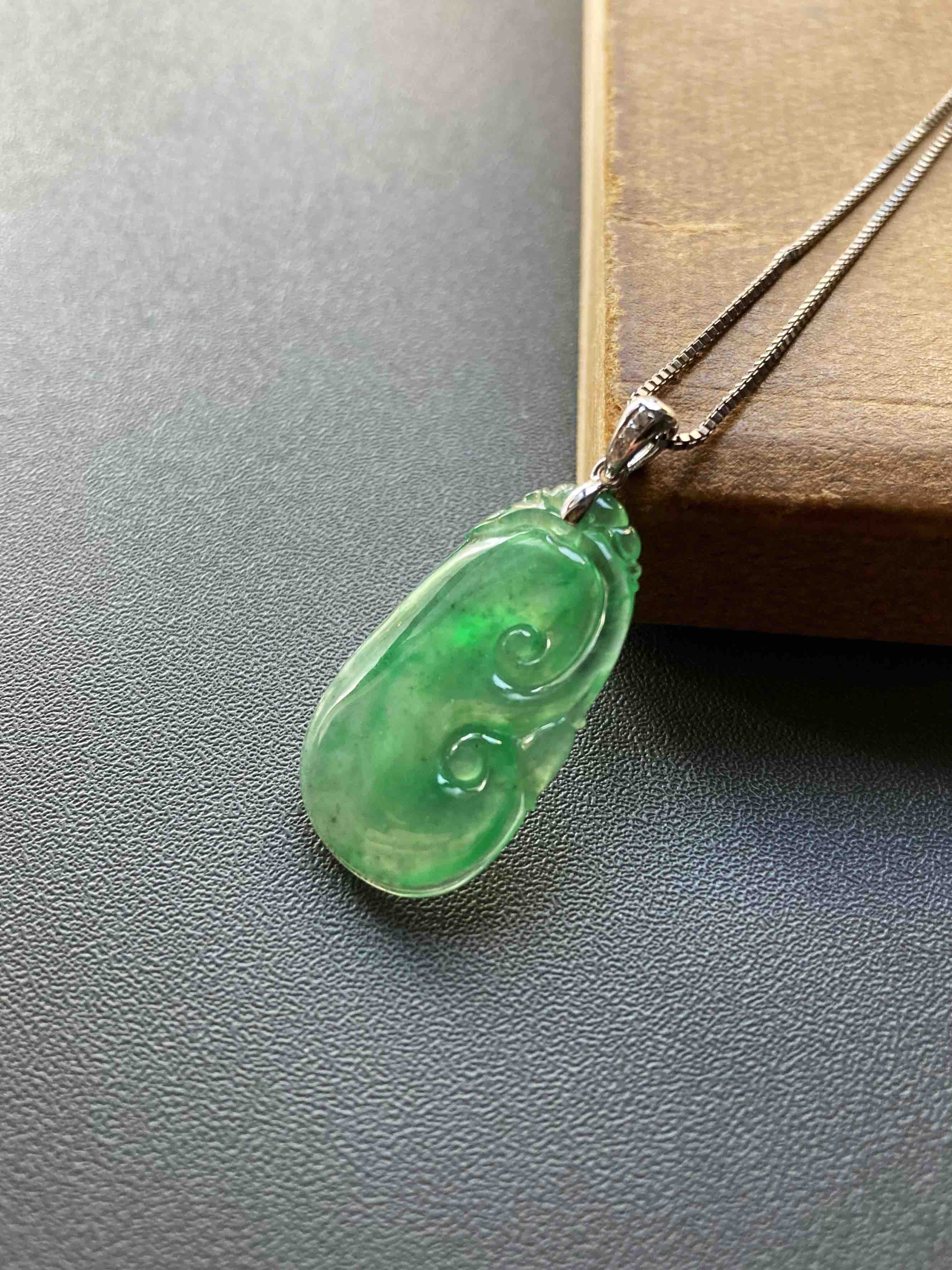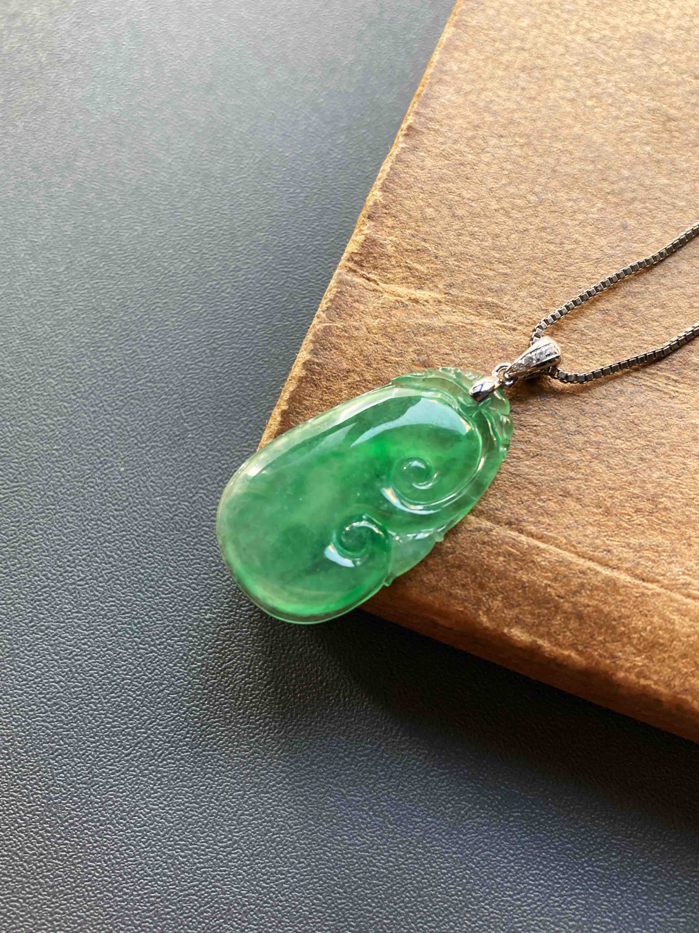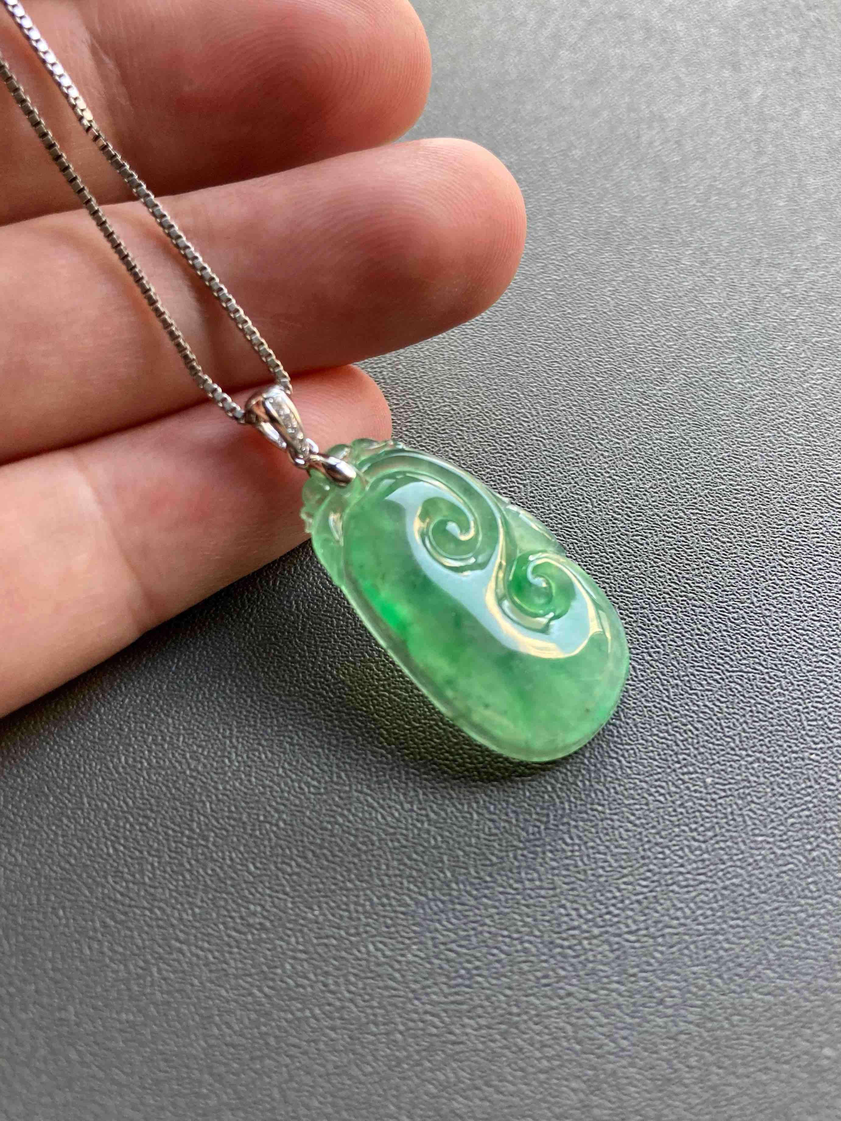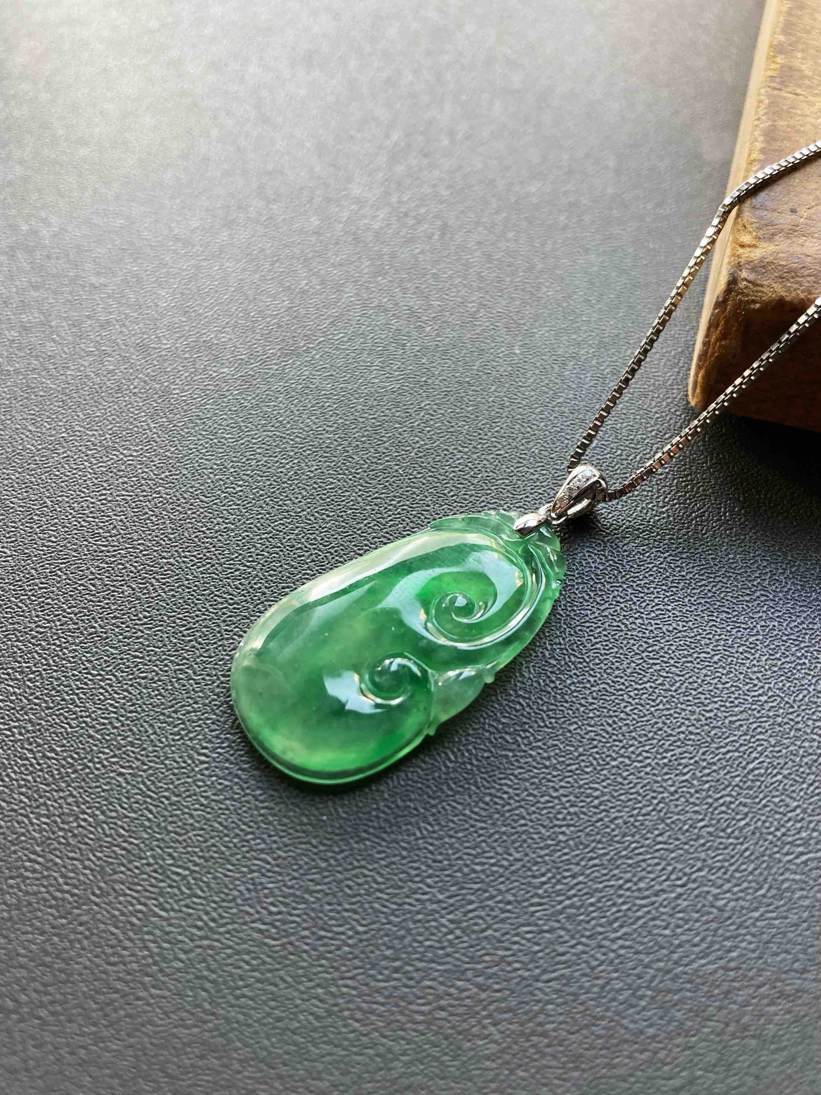 高冰种阳绿翡翠如意,种水晶莹剔透,荧光四射,特别有灵气的一件宝贝,阳绿流淌其中,透光色根清晰可见,纯天然高种水等级阳绿宝贝的魅力,今天请走再送你18k白金钻石镶嵌扣头加银镀白金项链一条,超划算,如意26.9×15×3.8mm