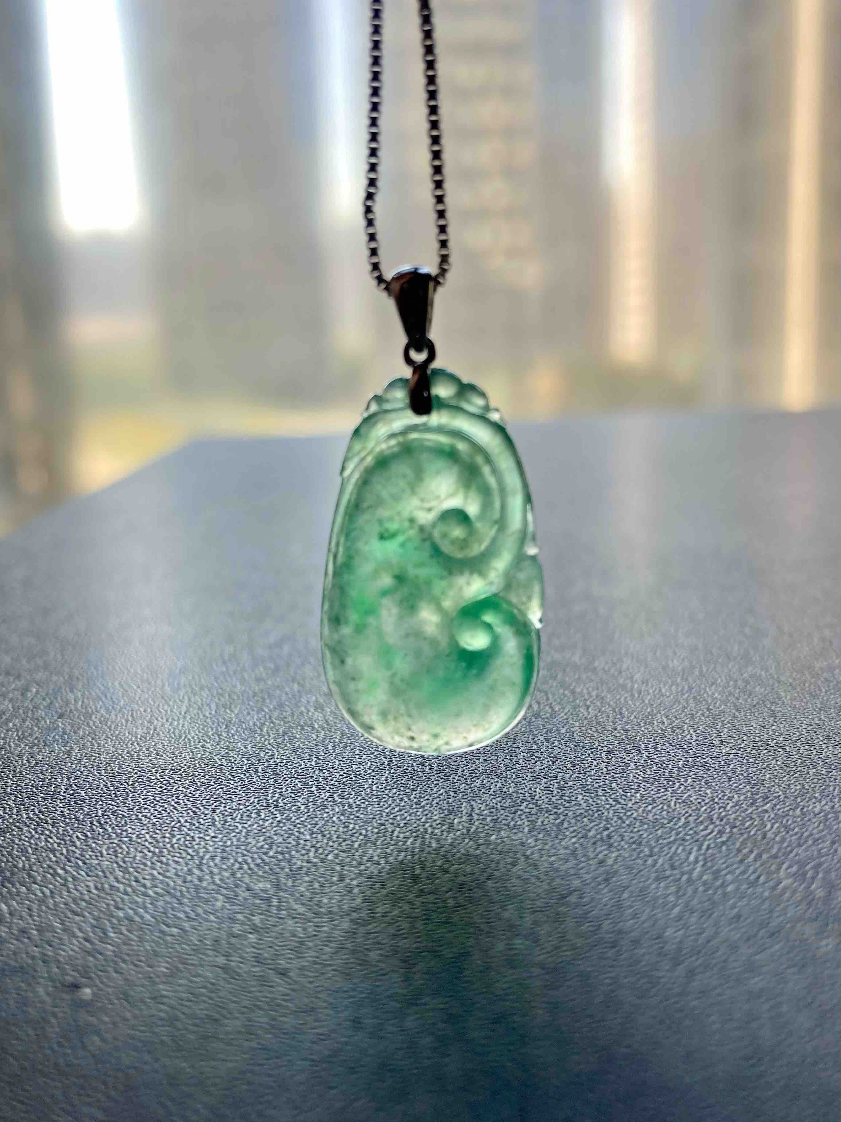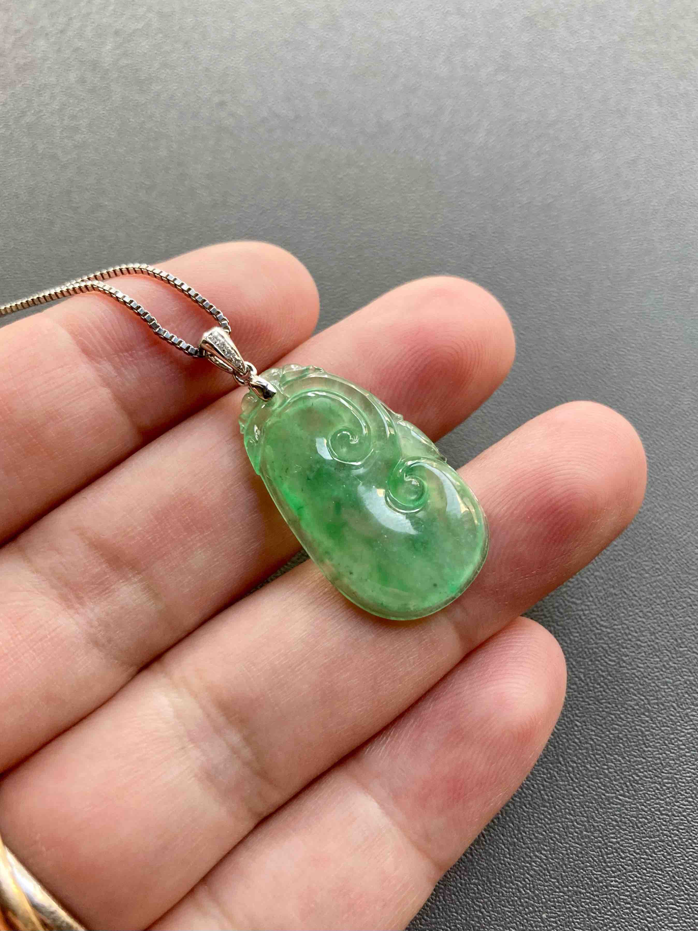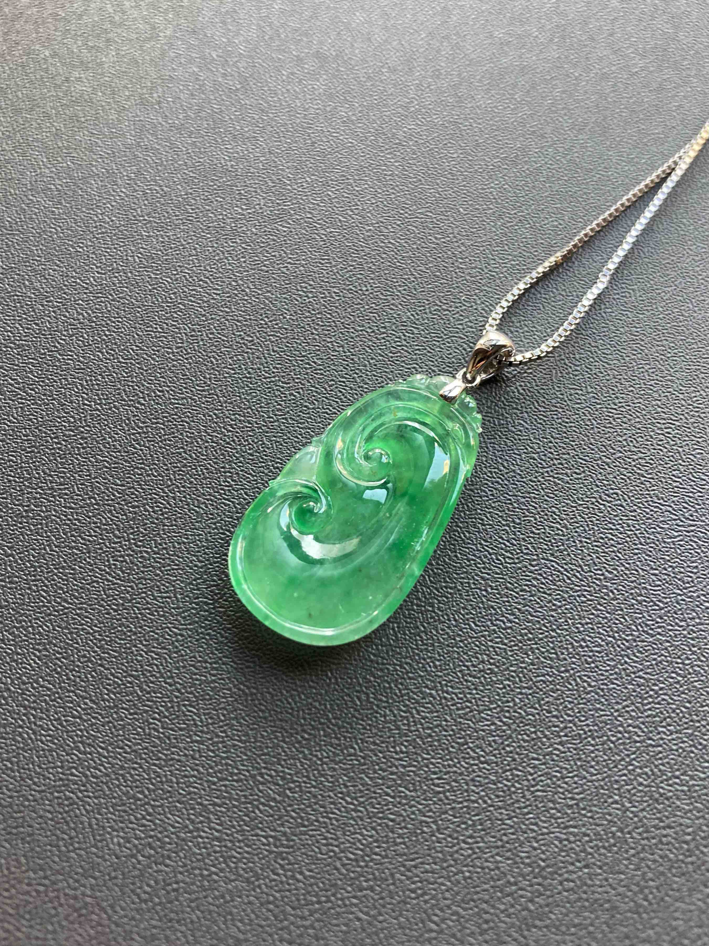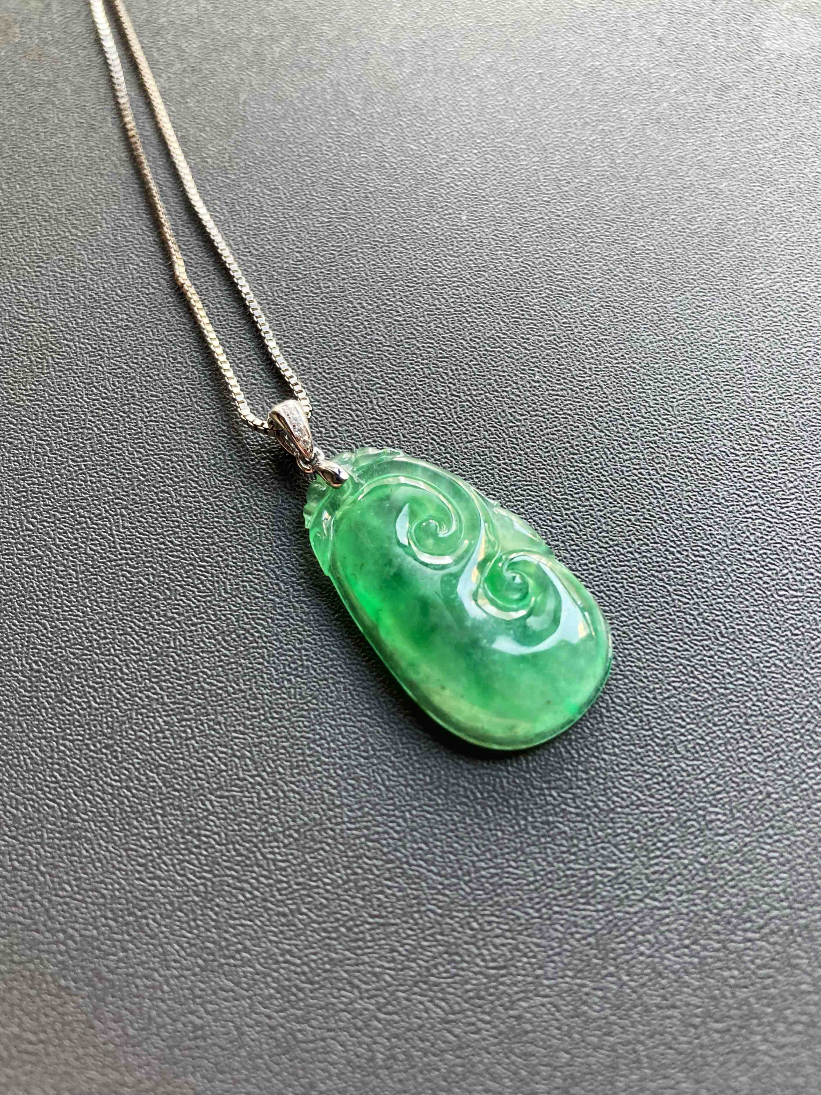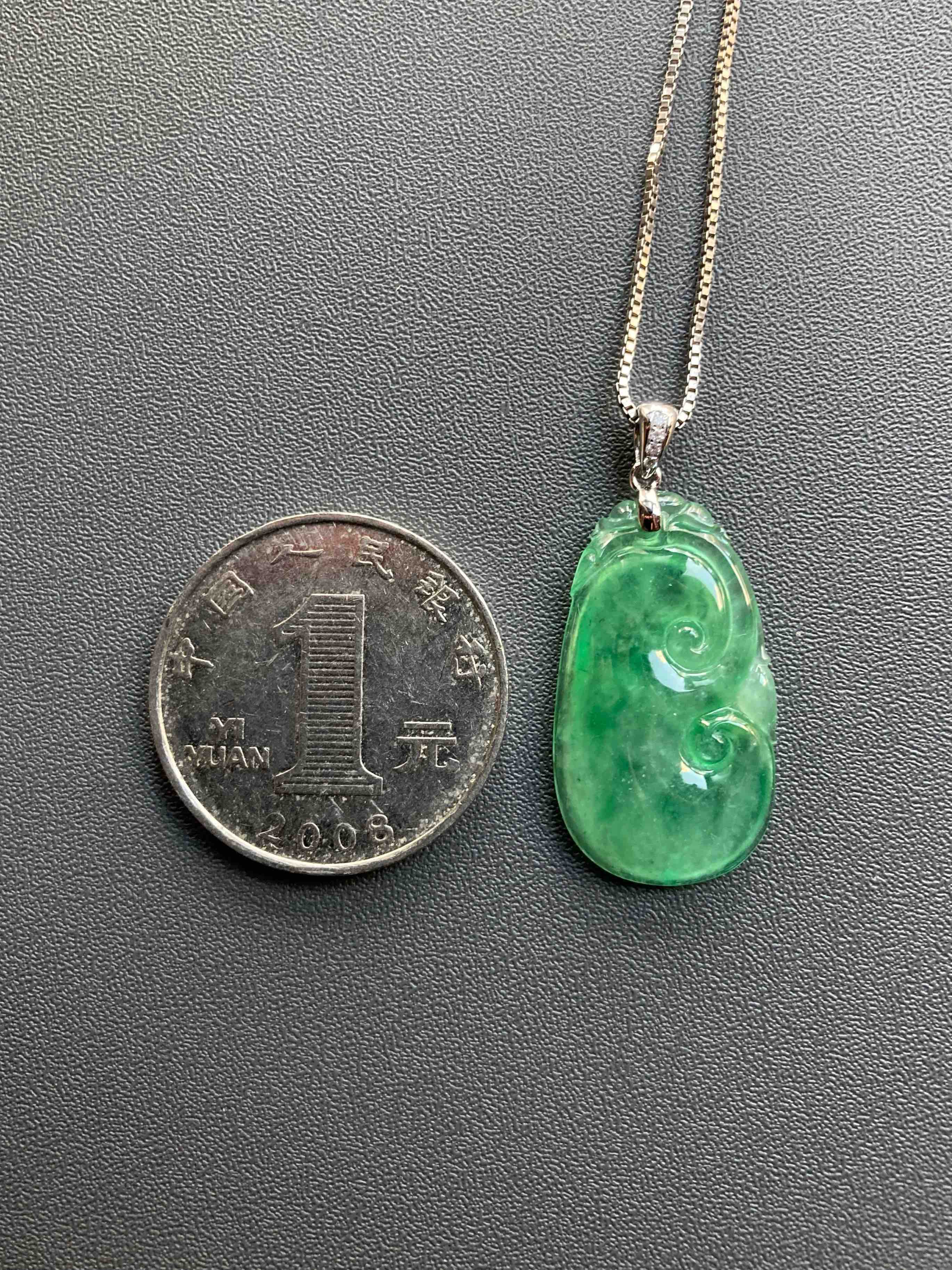 高冰种阳绿翡翠如意,种水晶莹剔透,荧光四射,特别有灵气的一件宝贝,阳绿流淌其中,透光色根清晰可见,纯天然高种水等级阳绿宝贝的魅力,今天请走再送你18k白金钻石镶嵌扣头加银镀白金项链一条,超划算,如意26.9×15×3.8mm