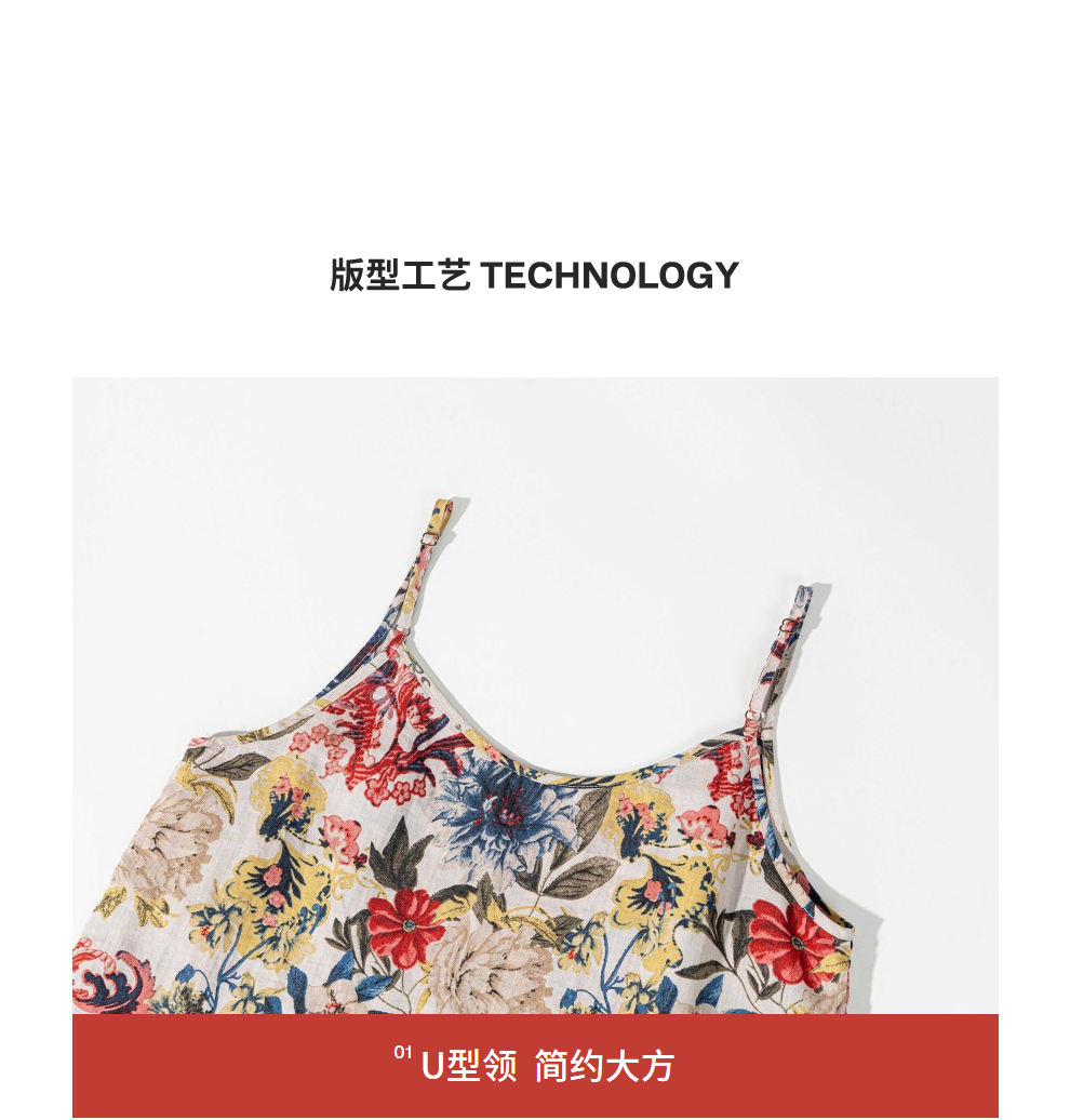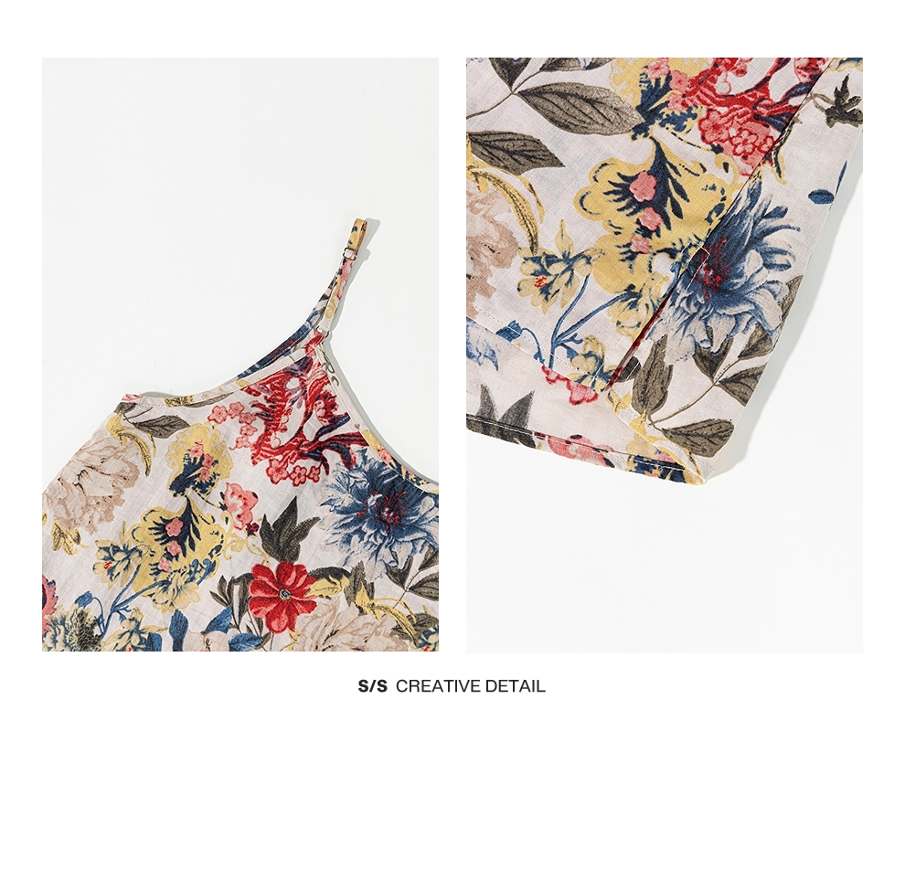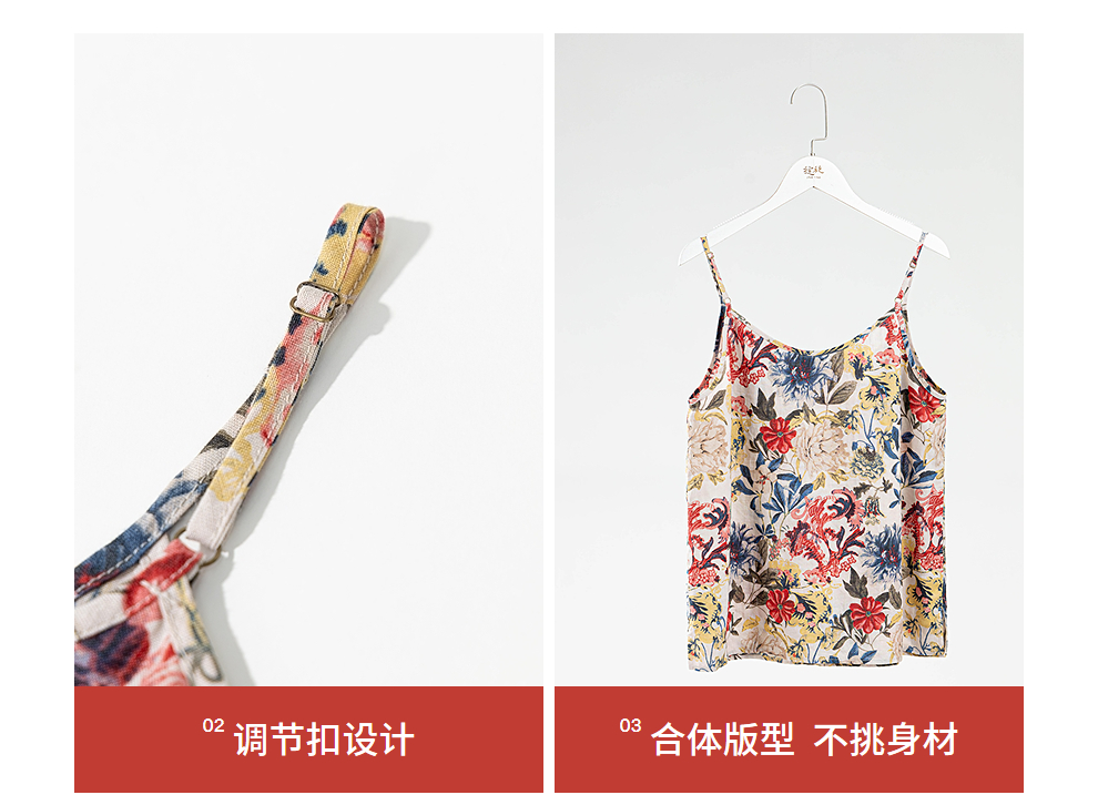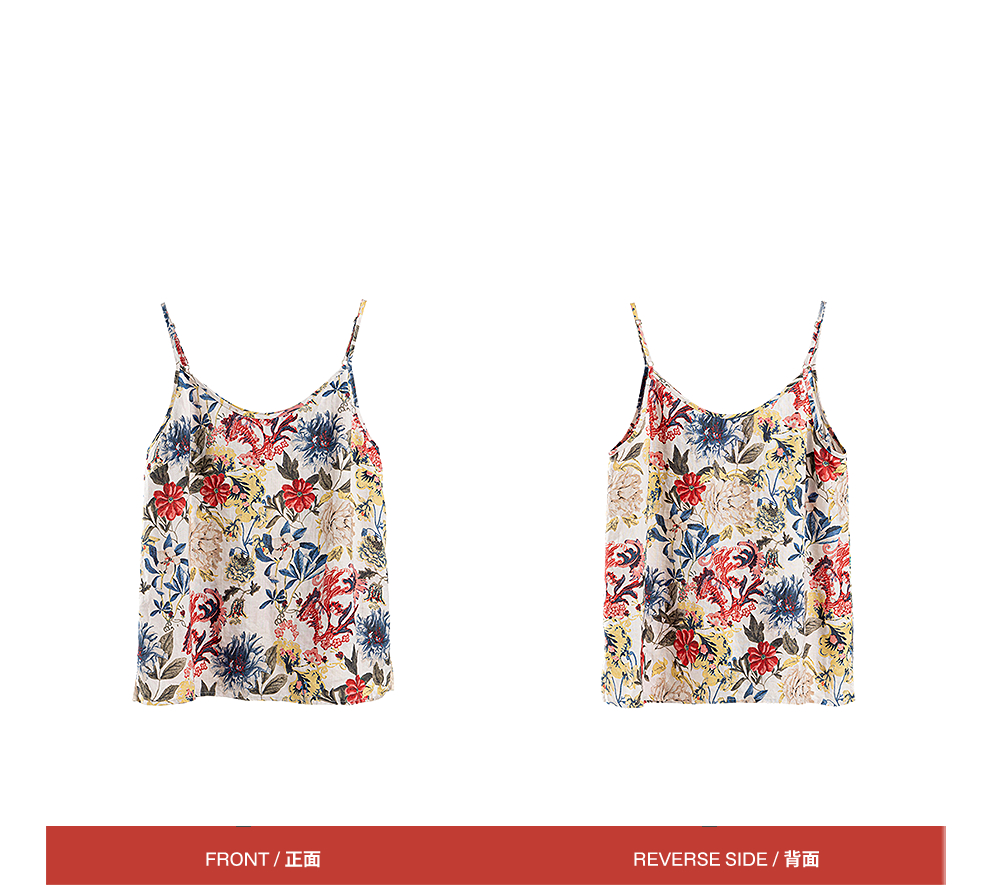 绽放旅行女装117朵/苎麻印花可调节肩带U型领复古吸汗透气吊带