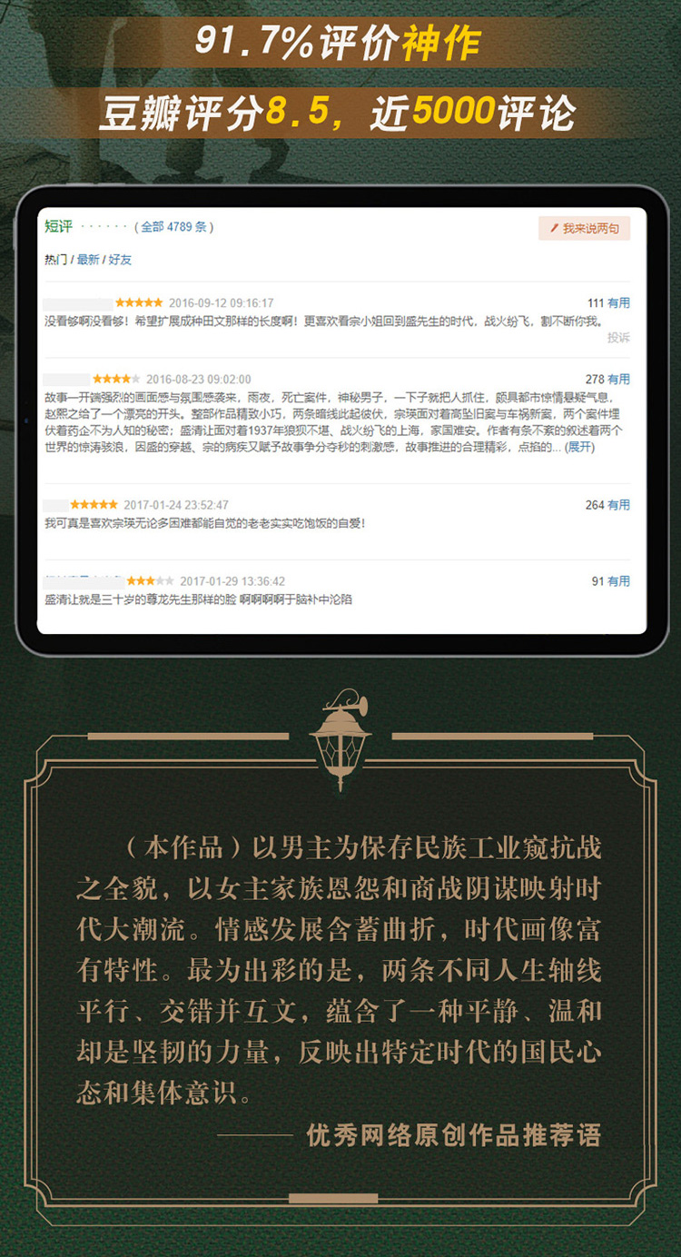 以男主为保存民族工业窥抗战之全貌,以女主家族恩怨和商战阴谋映射时代大潮流。